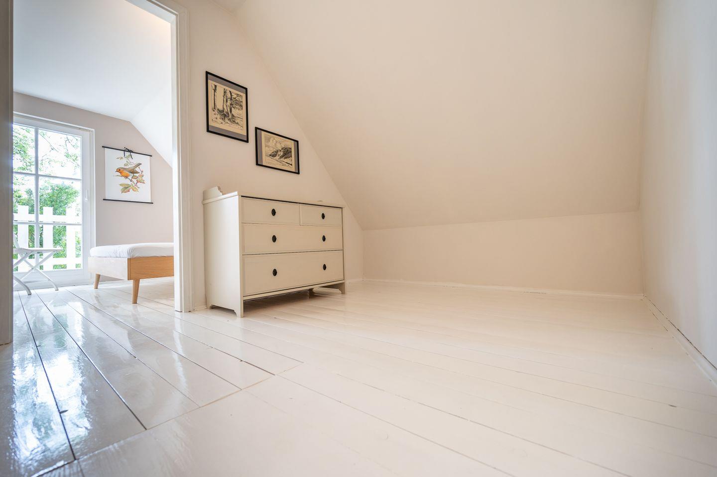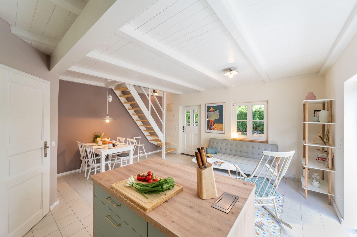 Zwei Schlafzimmer mit Doppelbetten bieten Ruhe nach Strand, Radtour oder Inselausflug. Für ein entspanntes Ankommen steht ein Parkplatz direkt am Haus zur Verfügung. Das Haus liegt auf einem ca. 1.600 m² großen Naturgrundstück mit altem Baumbestand – viel Platz zum Durchatmen und für kleine Entdecker.