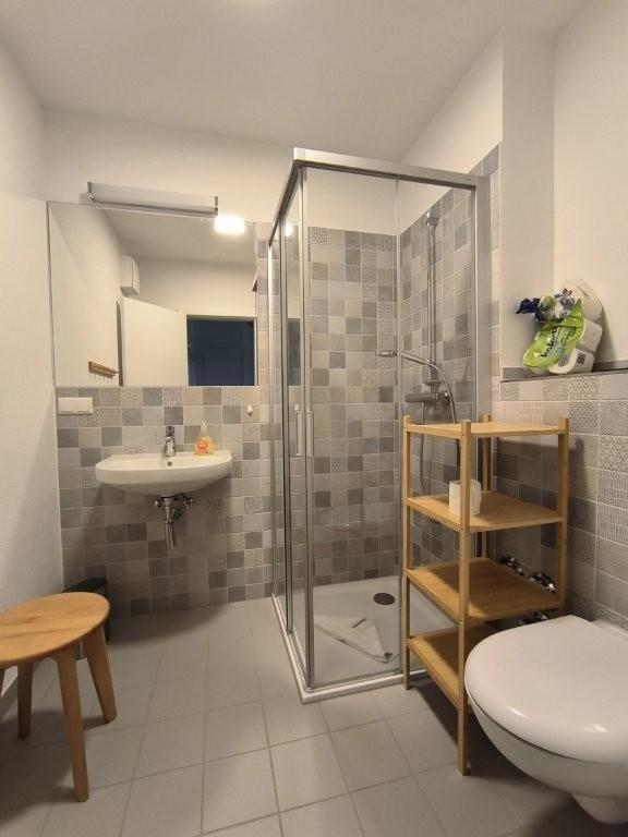 Das großzügige Badezimmer bietet eine bodentiefe Glasdusche, Waschbecken und WC. Außerdem gibt es noch ein zweites Badezimmer mit Dusche und WC.
