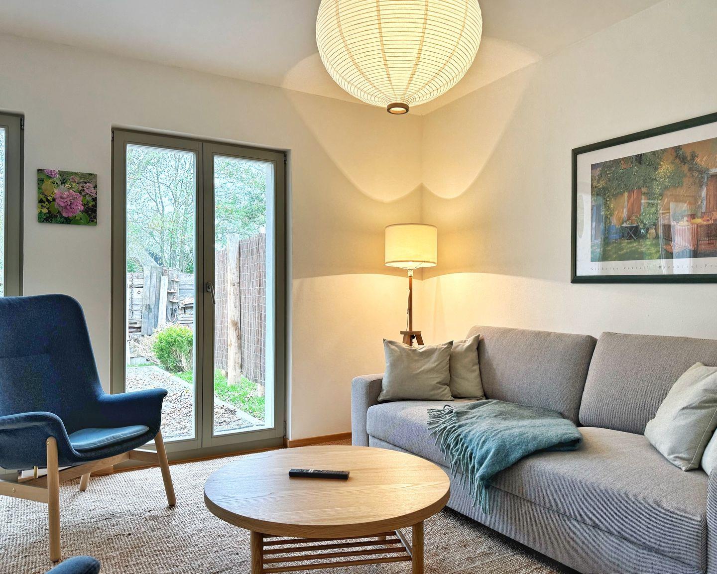 Das Wohn-Esszimmer ist großzügig gestaltet mit bodentiefen Fenstern und vorgelagerter Terrasse. Es gibt eine gemütliche Sofaecke und Sessel vor dem Flat-TV sowie einen großen Esstisch.