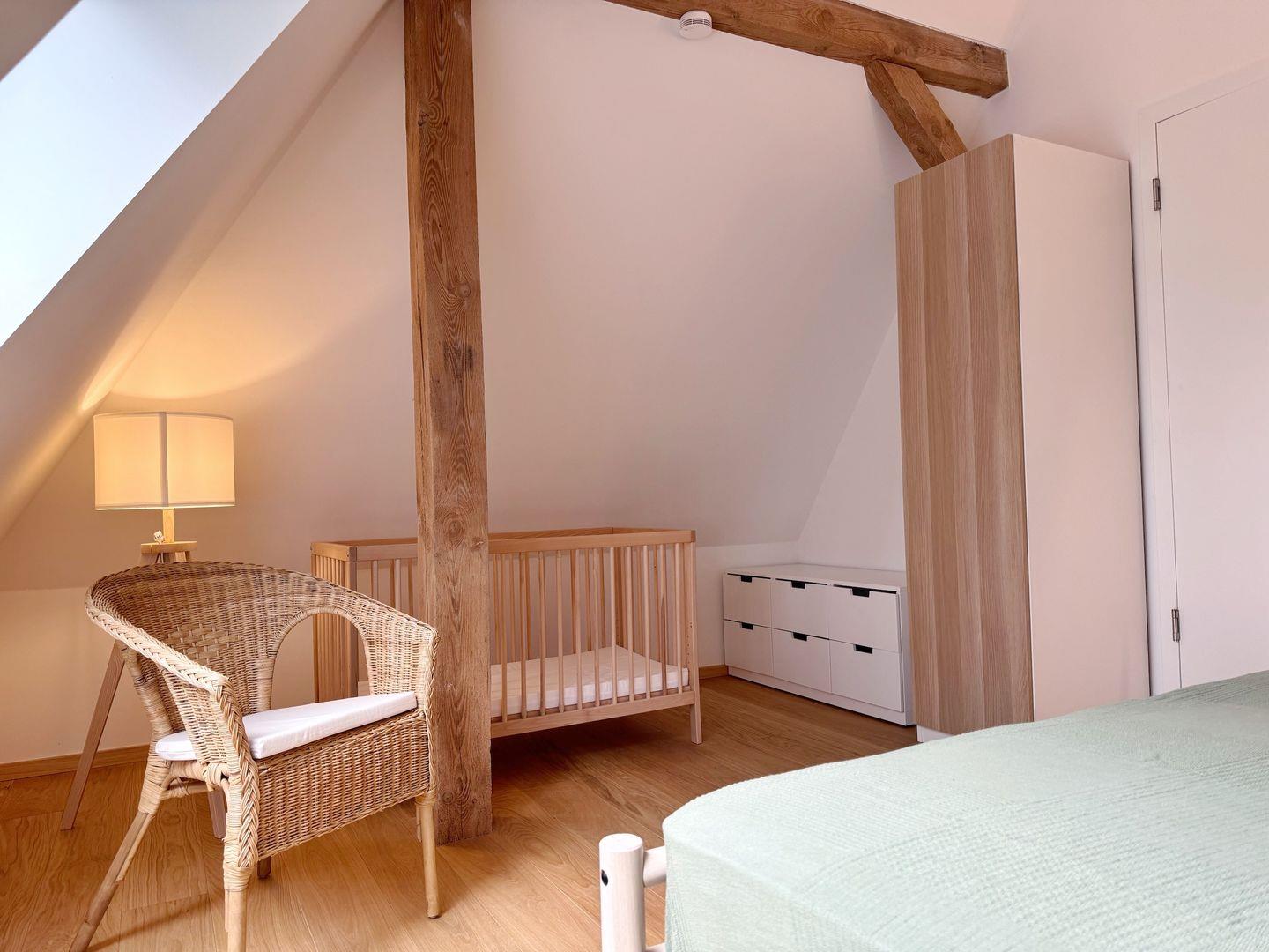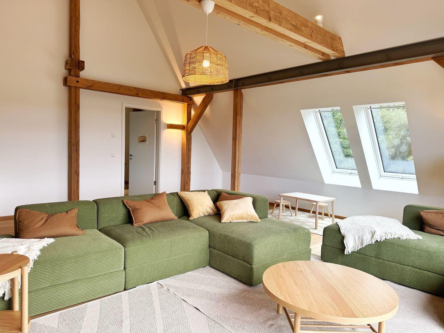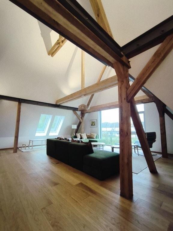 Das Wohnzimmer befindet sich im Obergeschoss und ist großzügig gestaltet mit freiliegenden Balken und bodentiefen Fenstern. Es gibt eine gemütliche Sofalandschaft und Sessel vor dem Flat-TV.