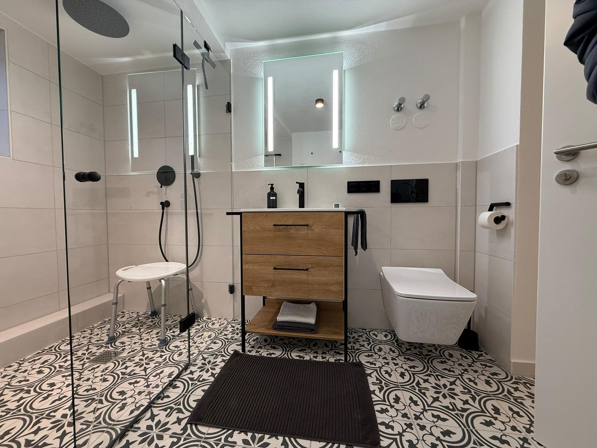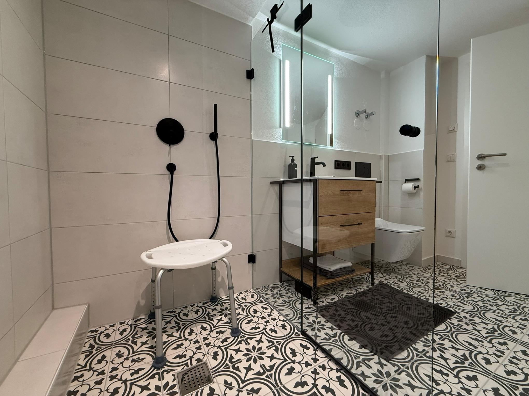 Sie verfügt über ein separates Schlafzimmer (mit 55Zoll TV)mit Doppelbett sowie ein Bad mit ebenerdiger Dusche.