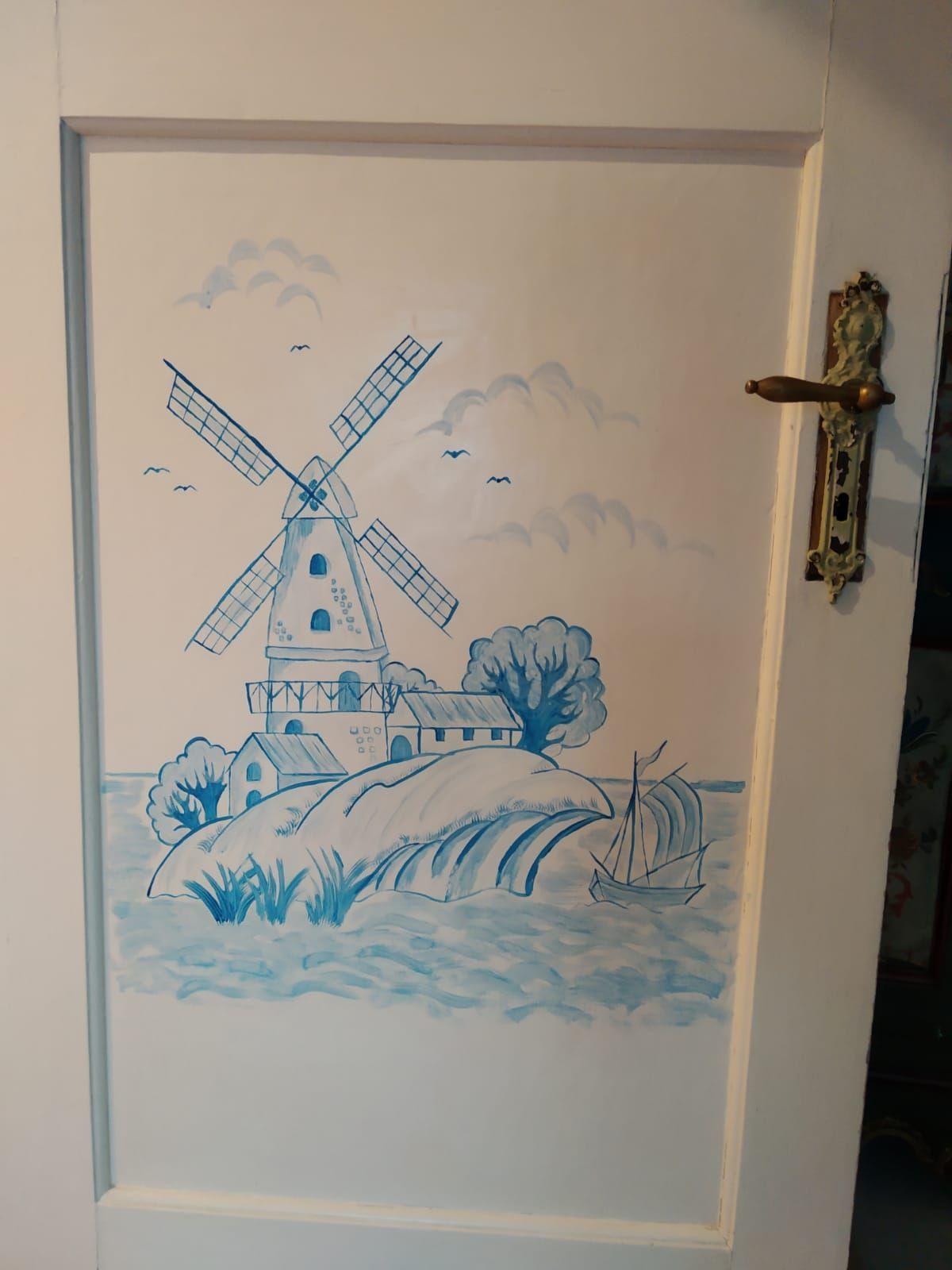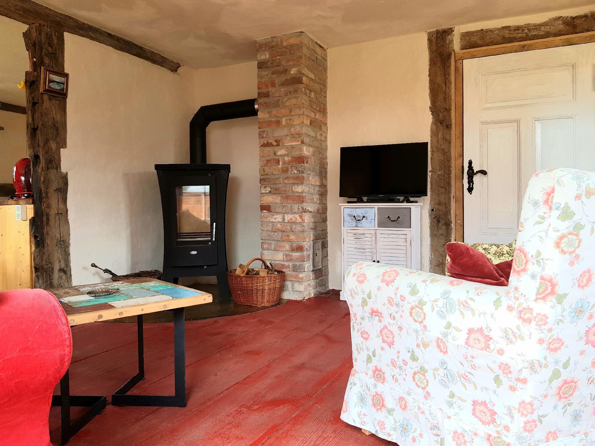 The holiday flat "Traudel" with separate entrance from the garden. Ground floor: Hallway with cloakroom. Living room: antique display cabinet, chest of drawers, small original decorative display cabinet, flat screen TV, small side table, seating furniture, small coffee table, comfortable 2-seater sofa, floor lamp, small lamps, bookshelf converted from antique wooden boat, fireplace, Blu-Ray and DVD player, books and CDs, basket for firewood, music system (radio, USB and CD) Kitchen: kitchen with seating area for 2-4 people, hist. Delft chandelier, retro fridge with freezer compartment, fully equipped kitchen with more than enough pots, pans, cutlery, salad bowls, plates, wine glasses, multi-purpose glasses, champagne glasses, coffee mugs, coffee cups, microwave, espresso machine, coffee machine, blender, chopping board, Toaster, kettle, cooking utensils, spice rack, drawers, dishwasher for 4 people, washing machine, shelves, small initial equipment consisting of 2 tea towels, 2 espresso capsules, some coffee filters, 1 roll of kitchen paper and some dishwasher tablets