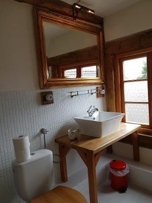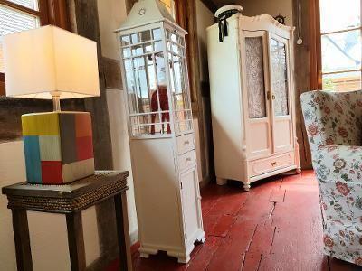 Bathroom: Designed as a bathroom gallery, 2 large free-standing towel rails, hair dryer, soap and disinfectant dispenser, small cosmetics bin, free-standing toilet brush and toilet roll holder, toilet rolls (2 pieces) basic equipment, cupboards for storage, large illuminated mirror, small hist. Table lamp, large window, privacy screen, coat hooks, shower shelf, towels, make-up mirror, washbasin with shelves, seating and shower mat Bedroom: hand-painted historic wardrobe, small historic oak chest, bedside table with lamp, 2 single beds that can be pushed together, curtains for blackout and storage space away from the staircase opposite the bedroom approx. 6 sqm with additional storage table