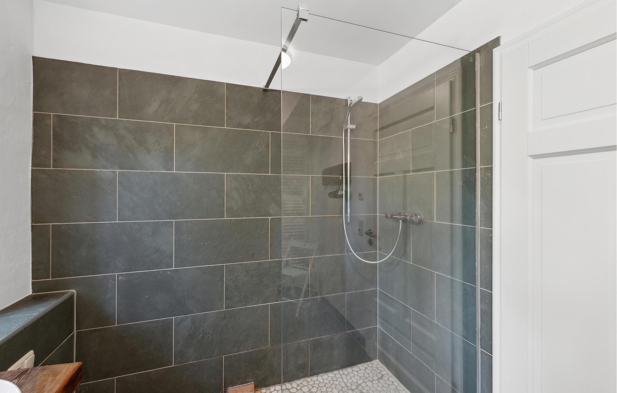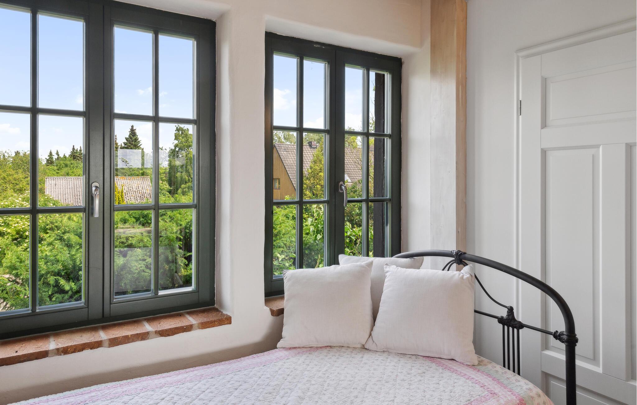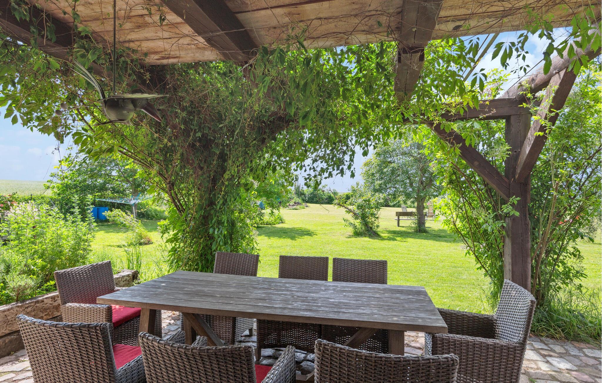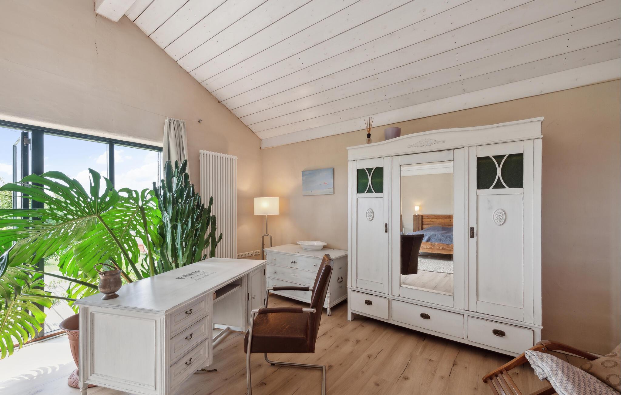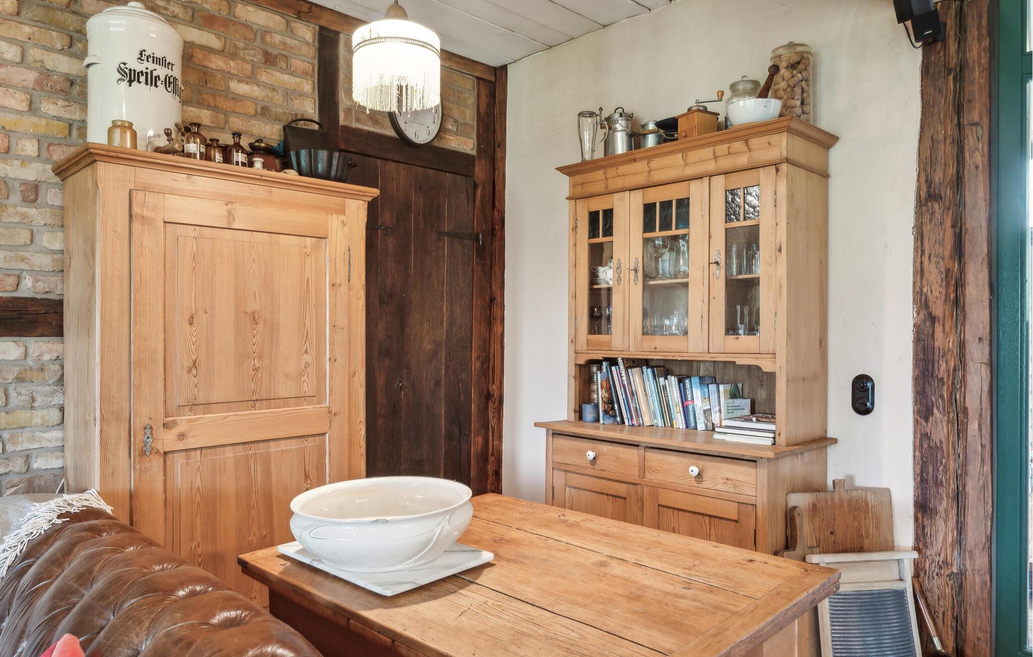 Køkkenet er ideelt til store fejringer og er fuldt udstyret. Dette er fuldt opvarmeligt og er også meget velegnet til vinter. Ud over alle køkkenmaskiner findes et amerikansk køleskab med fryser, justerbar emhætte, opvaskemaskine til 20 personer, pejs, fladskærms-tv, stereoanlæg og Blue-Ray-afspiller. Det rummelige soveværelse på øverste etage har en dobbeltseng lavet af gammelt træ og er bygget af udlejer. Fra balkonen kan I nyde en vidunderlig udsigt over Salzhaff. Haven inviterer jer til at slappe af og lege. Liggestole eller strandstole kan bruges. En volleyballbane er tilgængelig til fri brug.