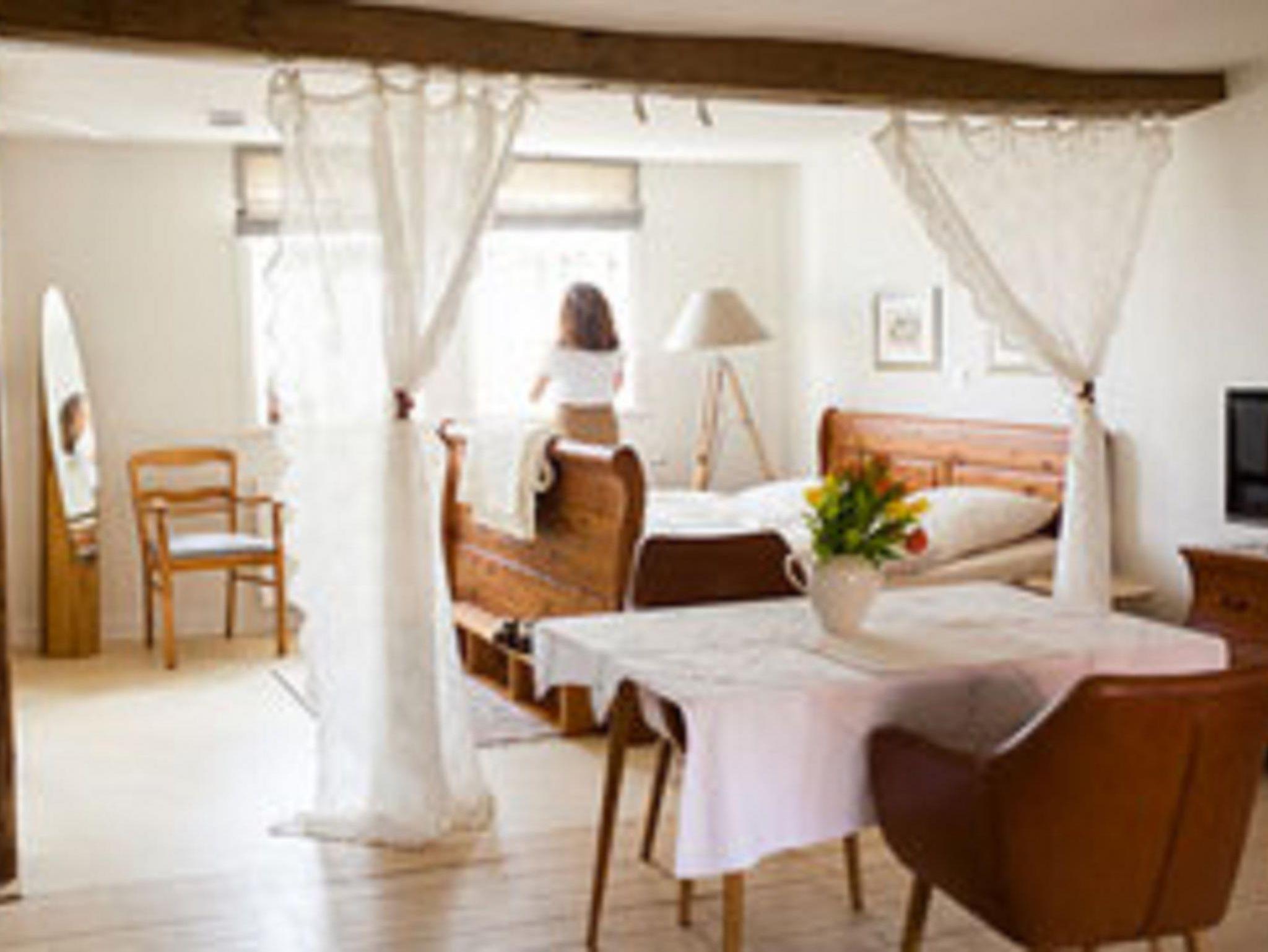 Das Wohnhaus wurde ca. 1775 errichtet, die benachbarte große Scheune mit beeindruckender Zimmermannskonstruktion 1886 beendet. Weitere Nebengebäude und Stallungen zeugen von der wechselvollen Geschichte des Hofes, der bis 2000 bewirtschaftet wurde. Die komplett sanierten und individuell mit einem hochwertigen Mix aus Alt und Neu ausgestatteten Wohnungen bieten bequeme Übernachtungsmöglichkeiten und Feriengenuss: komfortable Doppelbetten, eine großzügig ausgestattete Küchenzeile und ein modernes Bad/WC mit Dusche. Gemeinschaftsraum mit Waschmaschine und Trockner und ein abschließbarer Abstellraum stehen den Gästen zur Verfügung. Ein Wintergarten und die gesamte Hoffläche mit schattigen Plätzen laden zum Frühstück oder einem gemütlichen Sundowner ein.