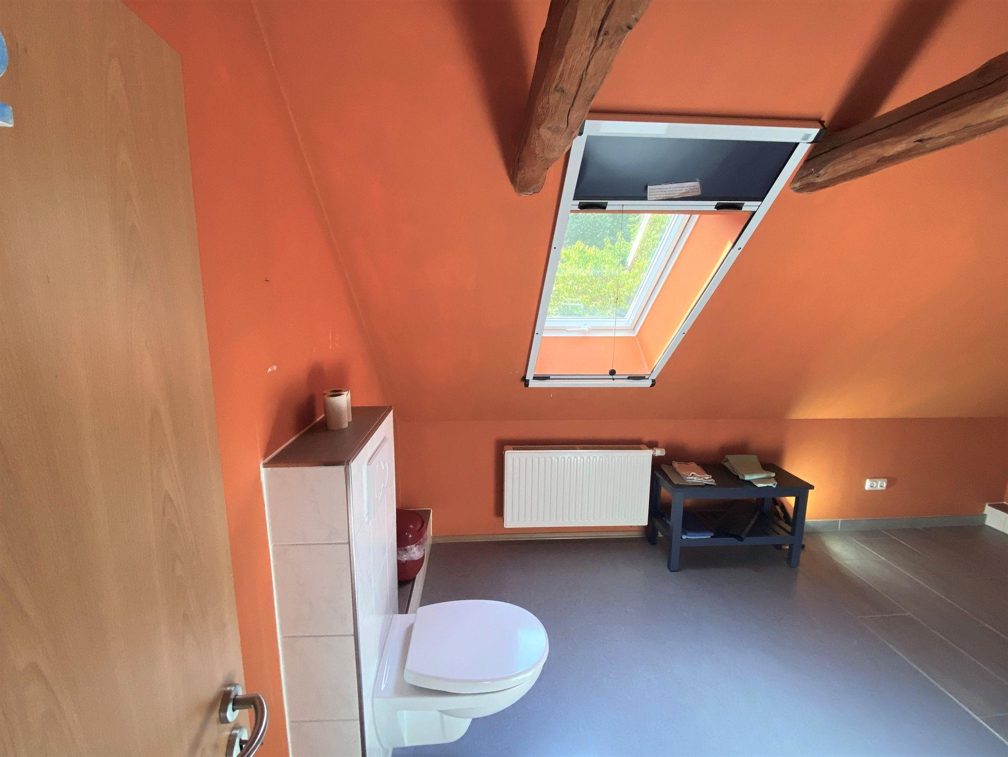 Ein großzügiges Badezimmer mit WC und Dusche ist vorhanden.