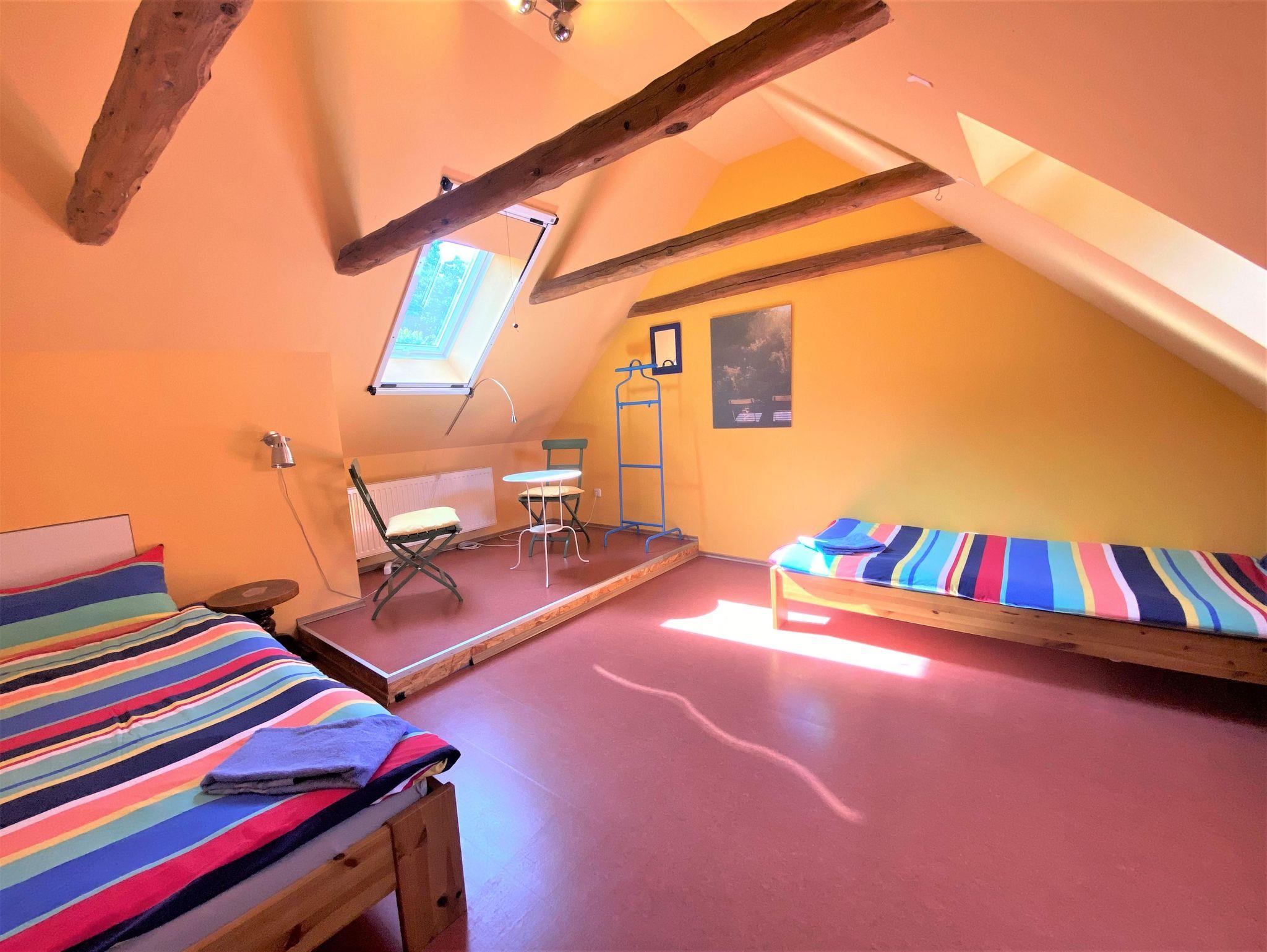 Das Zweibettzimmer bietet zwei, getrennt stehende, bequeme Betten 90x200 ohne Fußende, also auch geeignet für große Menschen. es gibt eine kleine Sitzecke mit Leselampe, ein mückensicheres Dachfenster mit Blick auf Biergarten und Auwald und ein Fenster zum Hof.