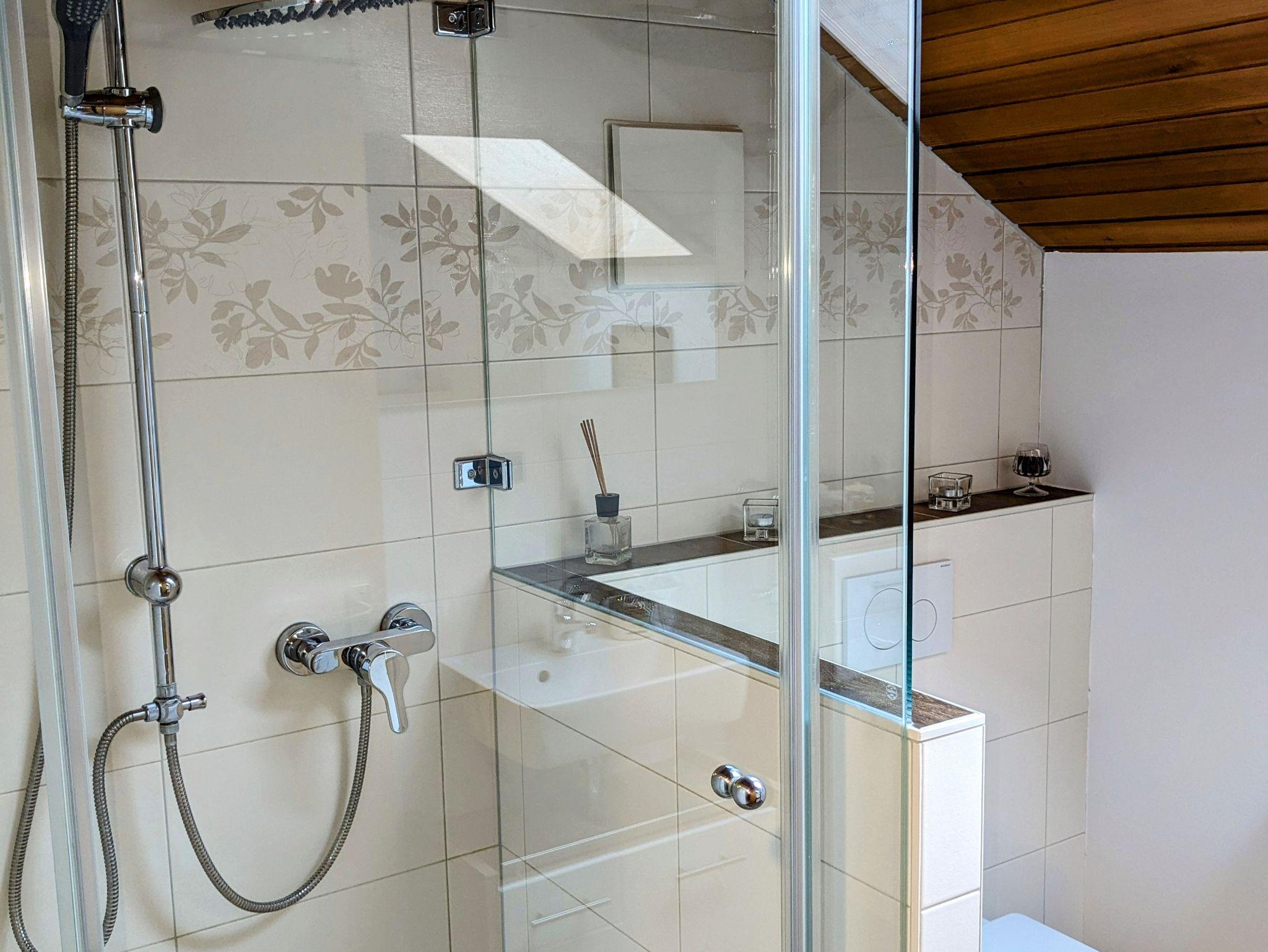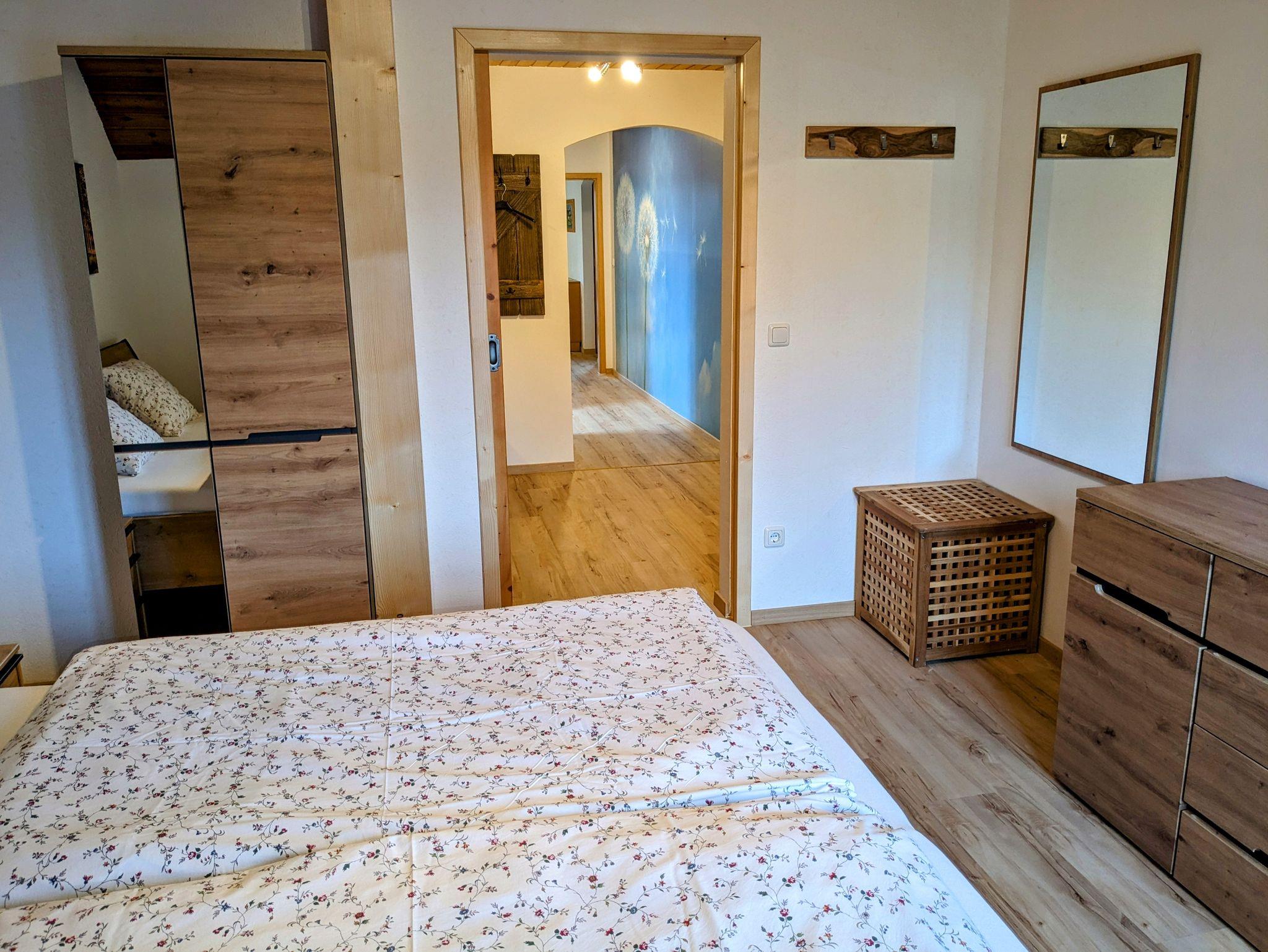 Unsere Dachgeschoß-Ferienwohnung misst 76m², verfügt über ein separates Schlafzimmer mit einem Doppelbett und einem abgeschlossenen Wohnzimmer mit Sat-TV. Die Wohnung hat ein Bad mit WC, einem kleinen Flur, eine voll ausgestattete Küche mit Essecke und einem Balkon mit herrlichen Berg- und Panoramablick. Sie eignet sich für maximal zwei Personen.