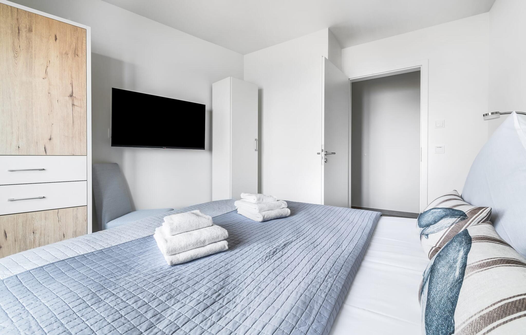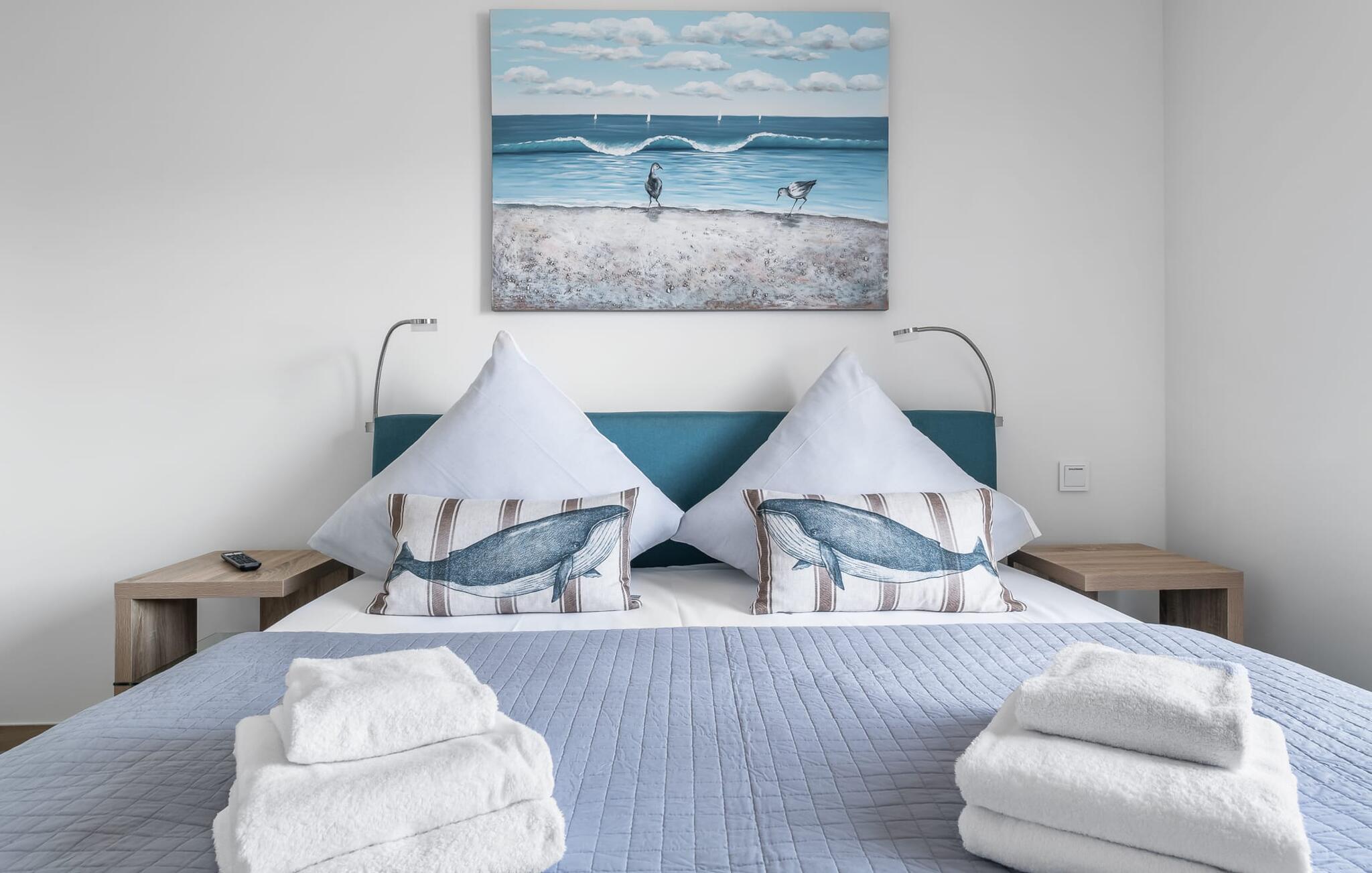 De to soveværelser er også af høj kvalitet og smagfuldt indrettede. Hvis vejret er for gråt til at se udenfor, er der et fjernsyn i begge soveværelser til underholdning. Det store soveværelse har en dobbeltseng, det andet soveværelse har to enkeltsenge.