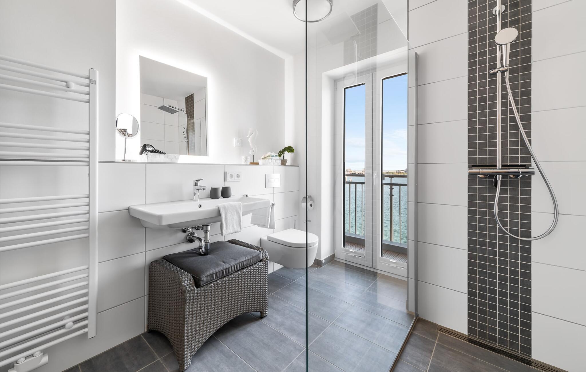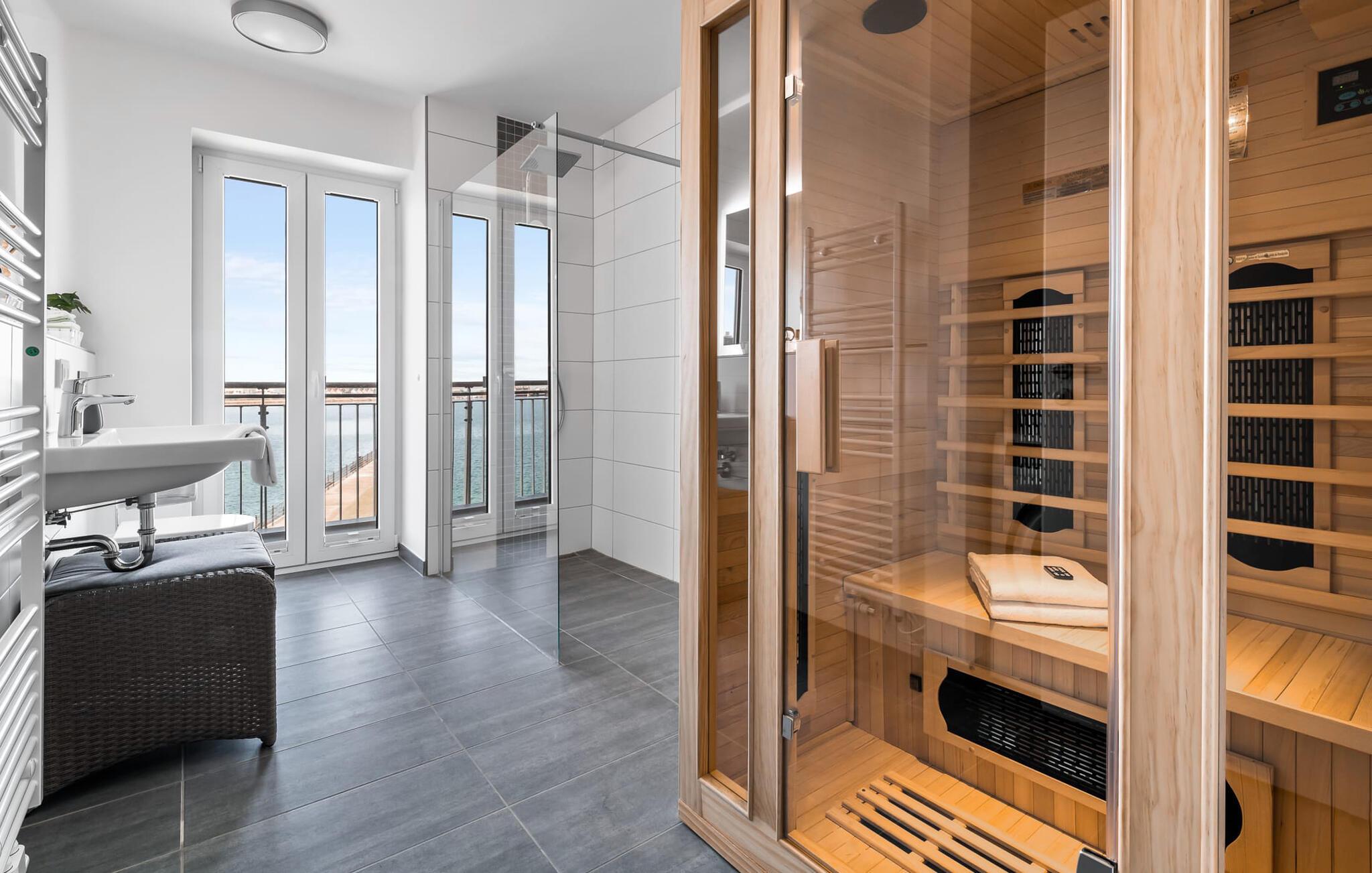 Du har en meget privat wellness-oplevelse på badeværelset Ud over en rummelig regnbruser, er der en infrarød sauna til din rådighed for at bringe afslapning tilbage til dig efter en anstrengende dag på ferie.
