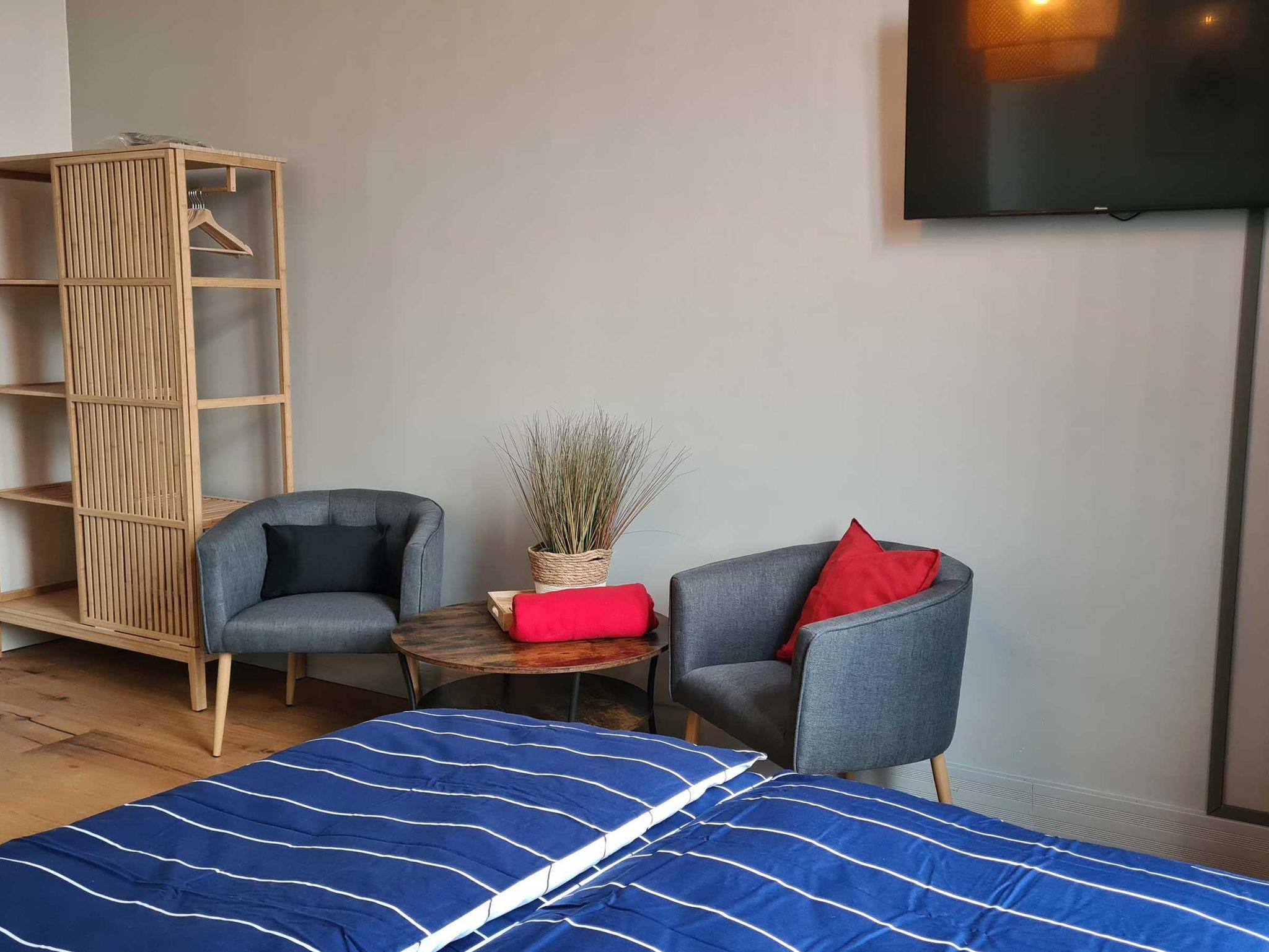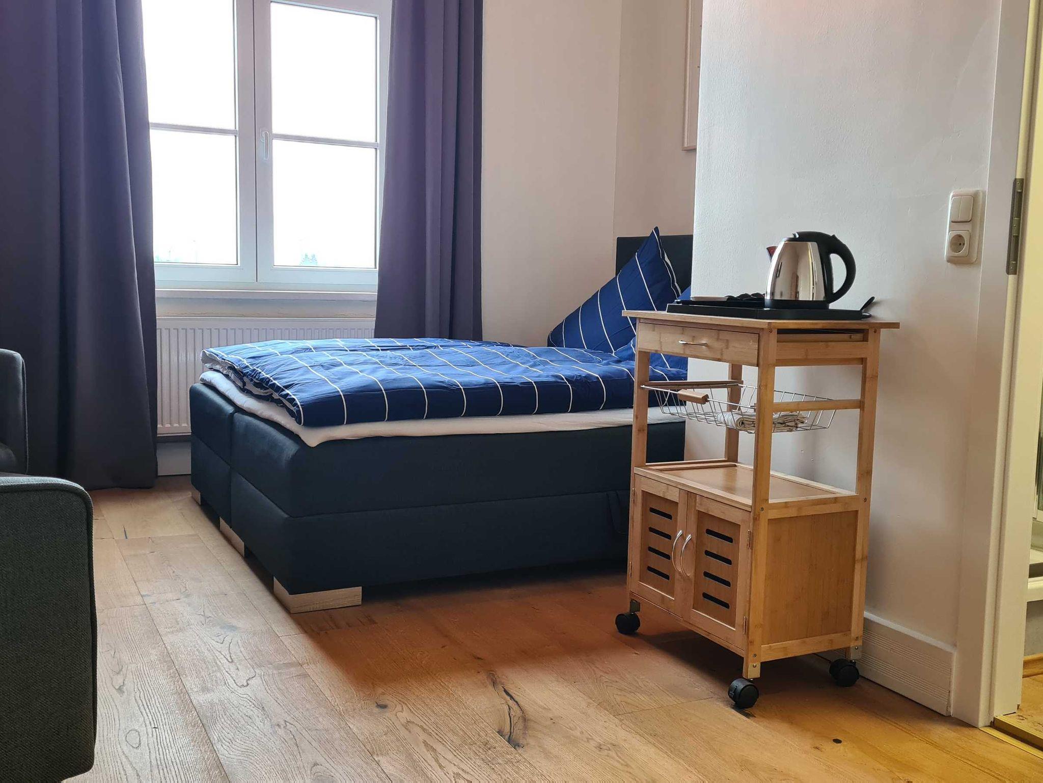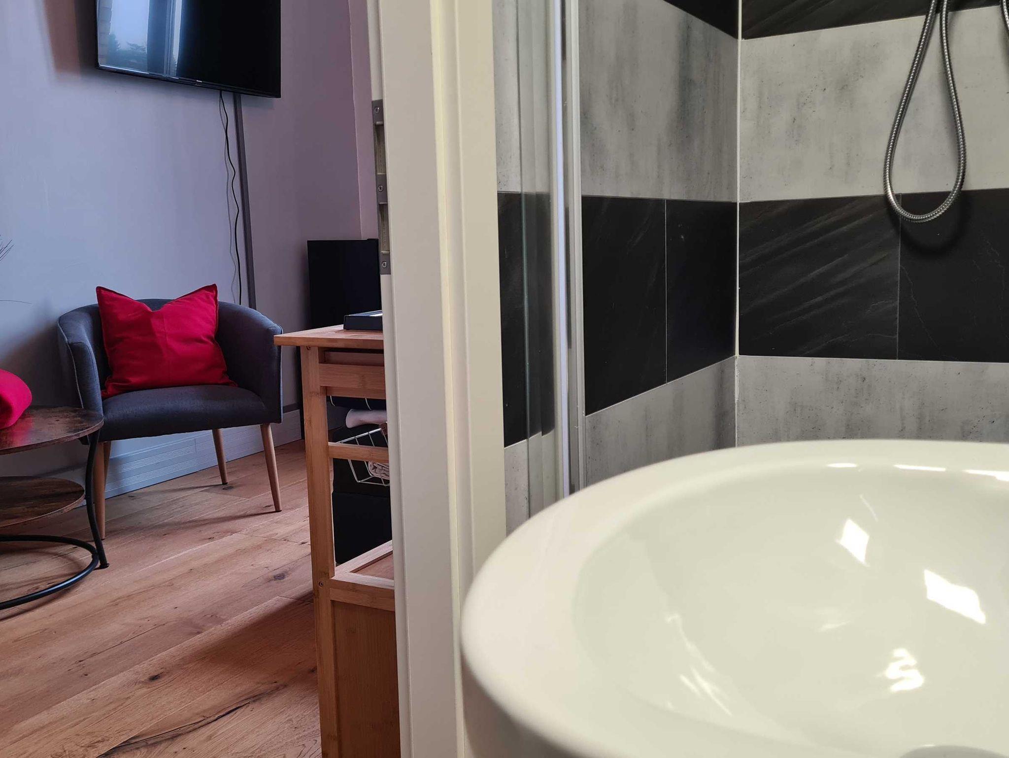 Alle Zimmer Nichtraucherzimmer mit Boxspringbett (Doppelbett), Flachbild-TV, Smart-TV, W-LAN, Bad mit Dusche oder Badewanne, WC. Minikühlschrank, Wasserkocher und Geschirr.