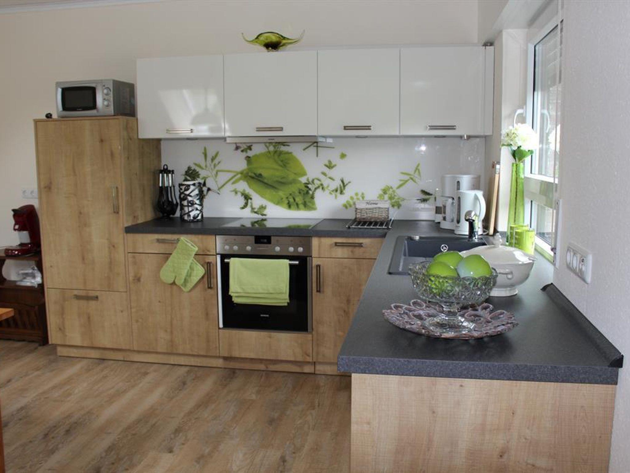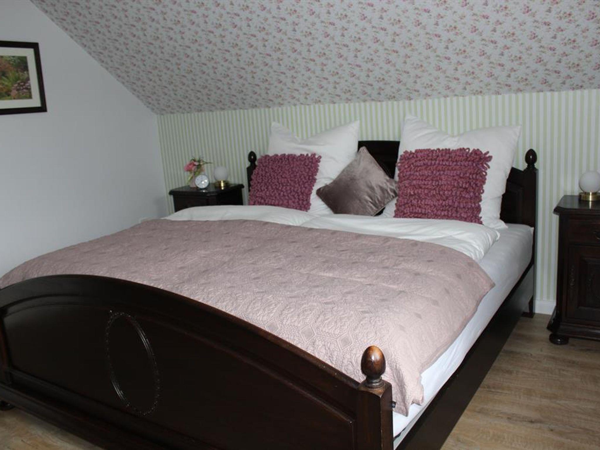 80 m² große Obergeschoss Ferienwohnung mit separatem Eingang. Wohnzimmer mit SAT/TV und Radio, sowie verglastem Balkon. Komplett eingerichtete Küche mit Geschirrspüler und Mikrowelle. Badezimmer mit Dusche und WC. 1 Schlafzimmer mit Doppelbett, 1 Schlafzimmer mit Einzelbett. Babyreisebett und Kinderhochstuhl auf Wunsch verfügbar.