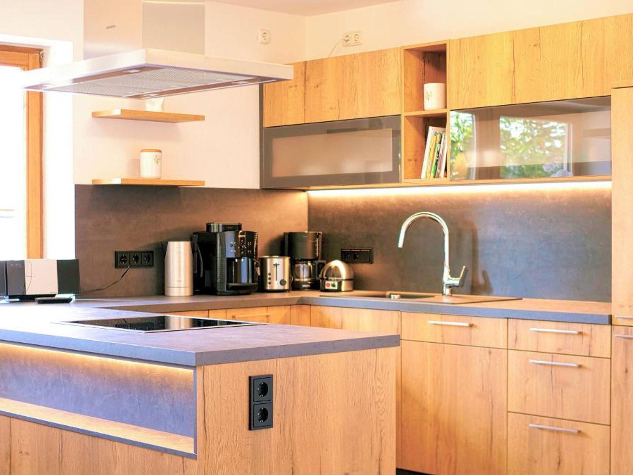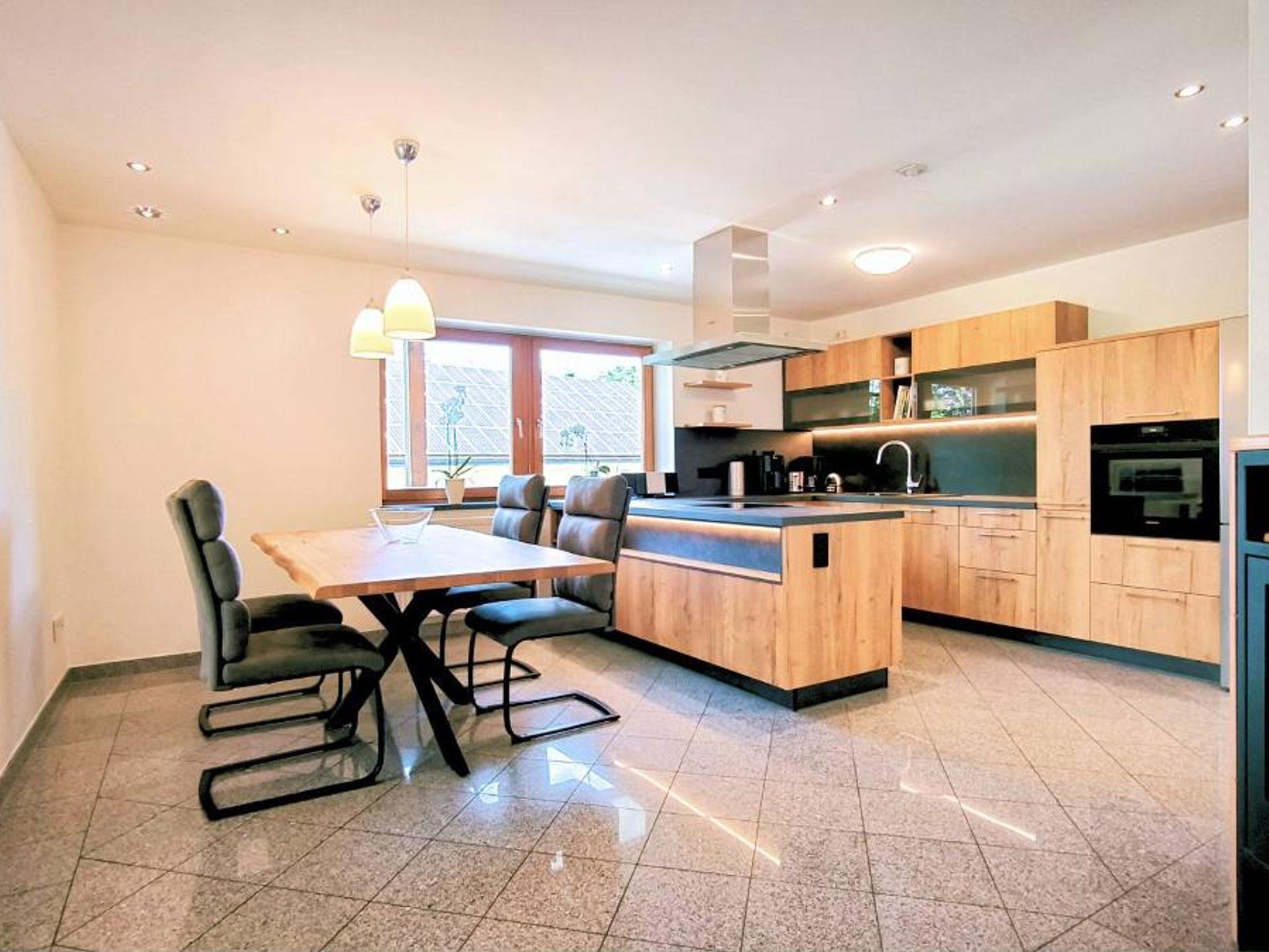 Küche: Exklusive Küche mit hochwertigen Elektrogeräten, Schwedenofen, Esstisch “wie der Baum gewachsen ist”, dazu bequeme rückengerechte Schwingstühle.