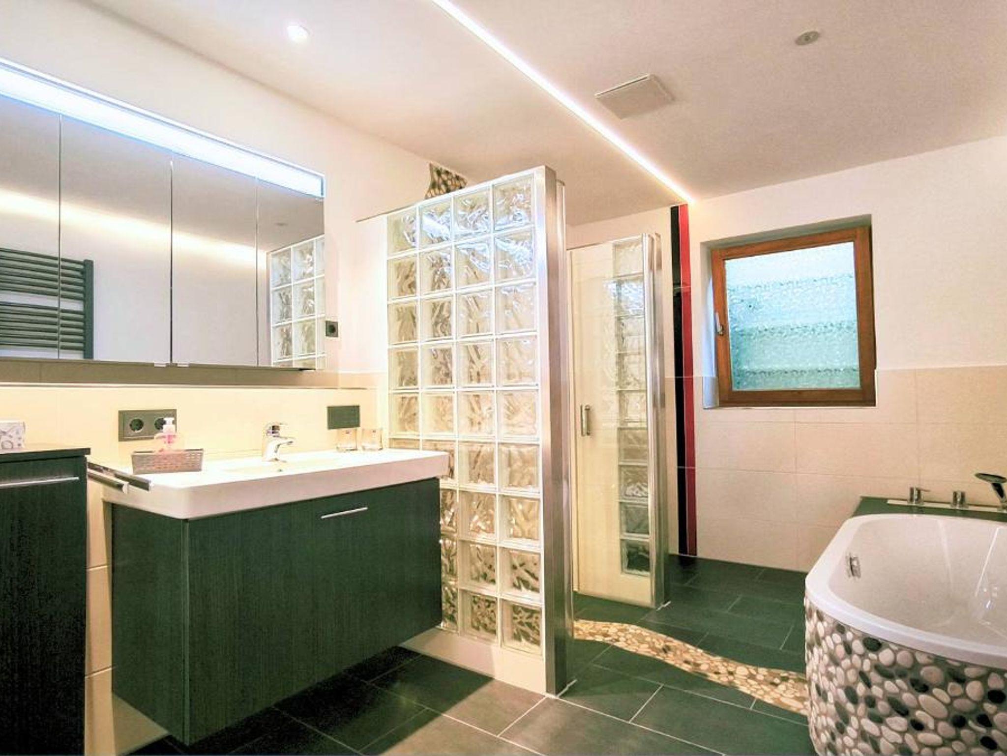 Badezimmer: Begehbare Dusche, Badewanne, WC und großer Spiegelschrank.