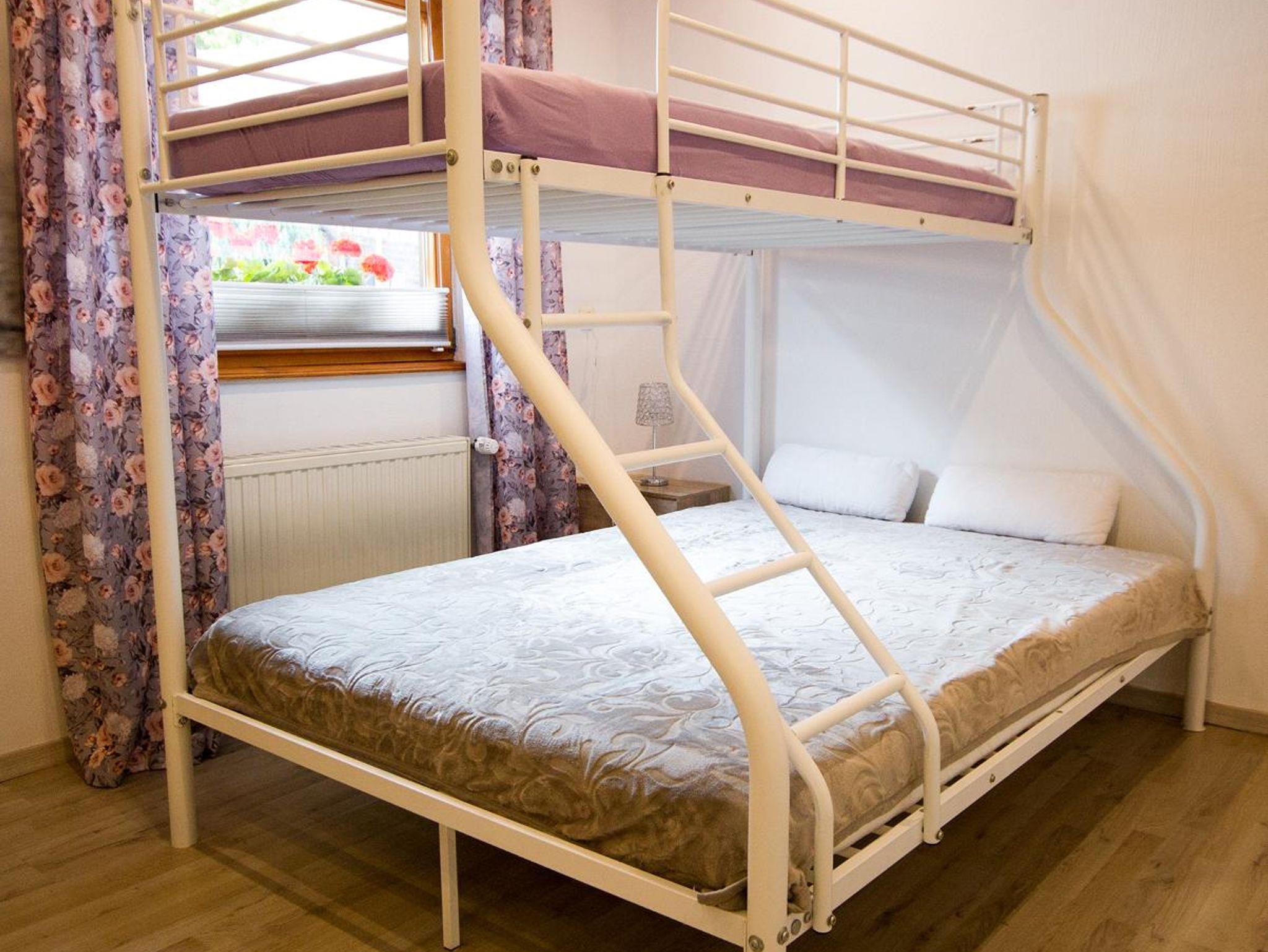 Das Chalet verfügt über ein großes Schlafzimmer mit Doppelbett. Zusätzlich gibt es ein Etagenbett (unten 140x200 cm, oben 90x200 cm) – ideal für Kinder. Dieser Bereich ist ein Durchgangszimmer ohne Tür.