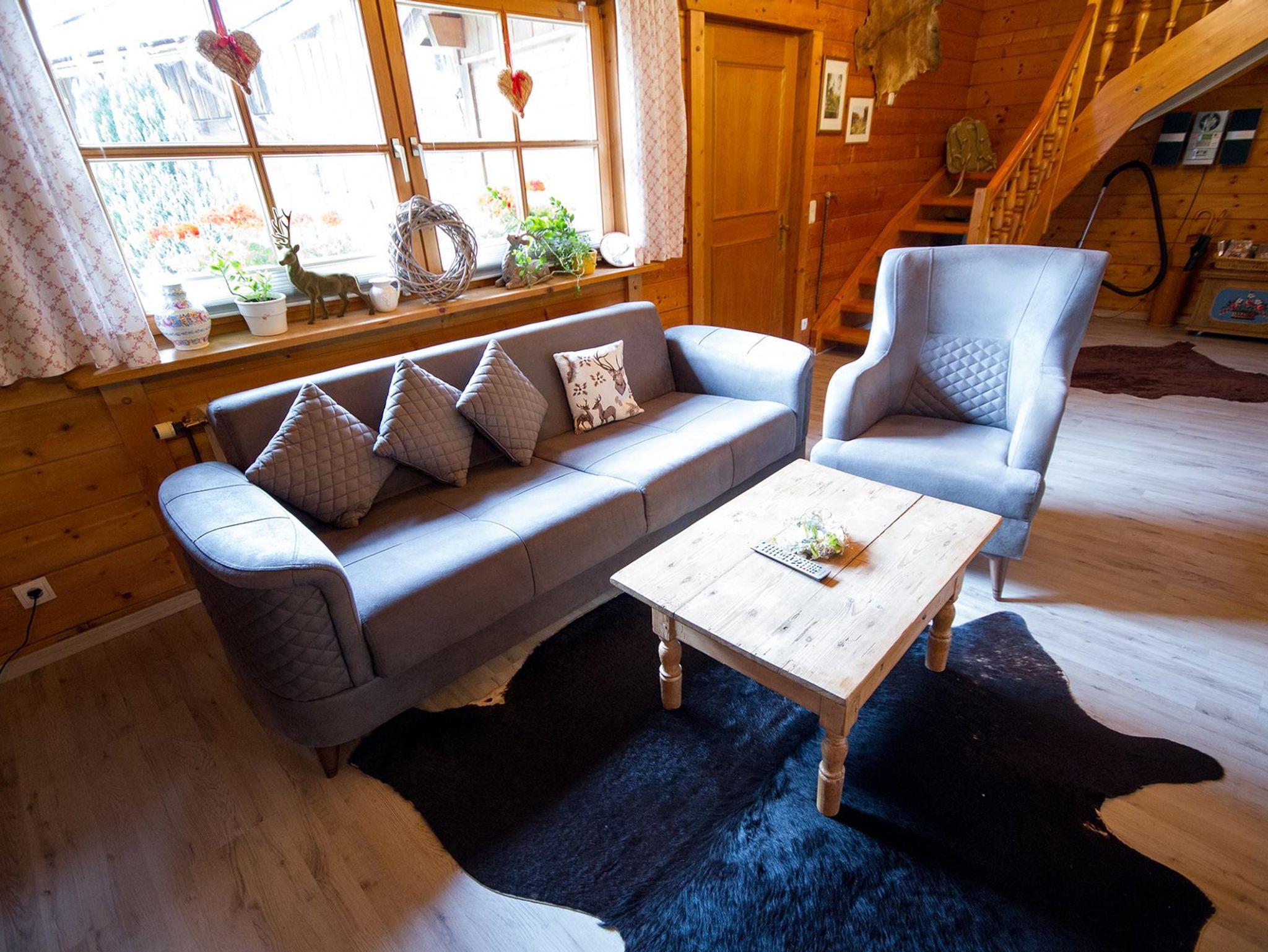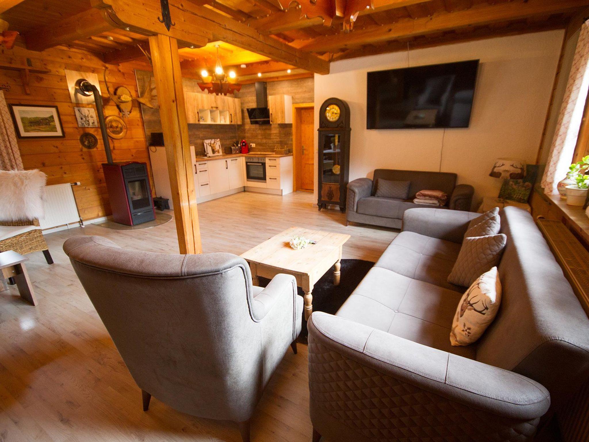 Die offene Wohnküche im Hüttenstil mit Pelletsofen und Zentralheizung bietet eine behagliche Atmosphäre – perfekt für gemütliche Stunden, auch an kühlen Tagen. Der Wohnbereich ist mit einem Samsung HD-Flat-TV und Glasfaser-WLAN ausgestattet.