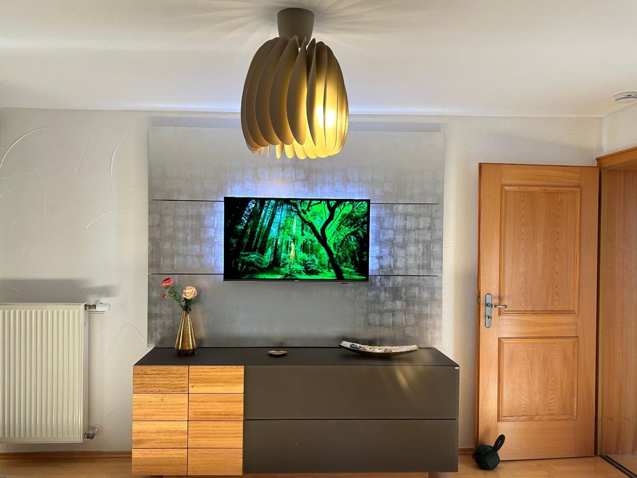 Schlafzimmer 1: Boxspringbett, elektrischen Lattenrost, Tempur-Matratzen, Ambilight-TV und Voglauer-Schränken.