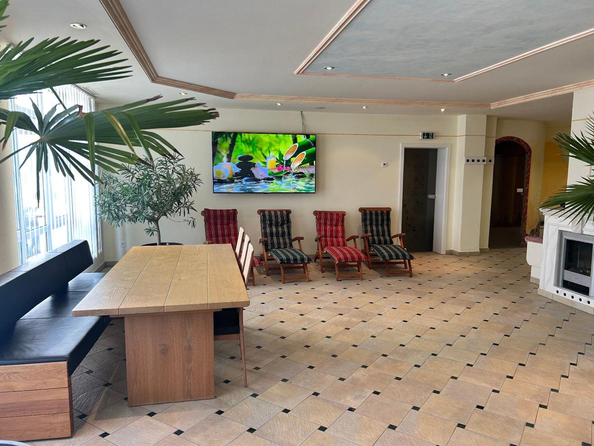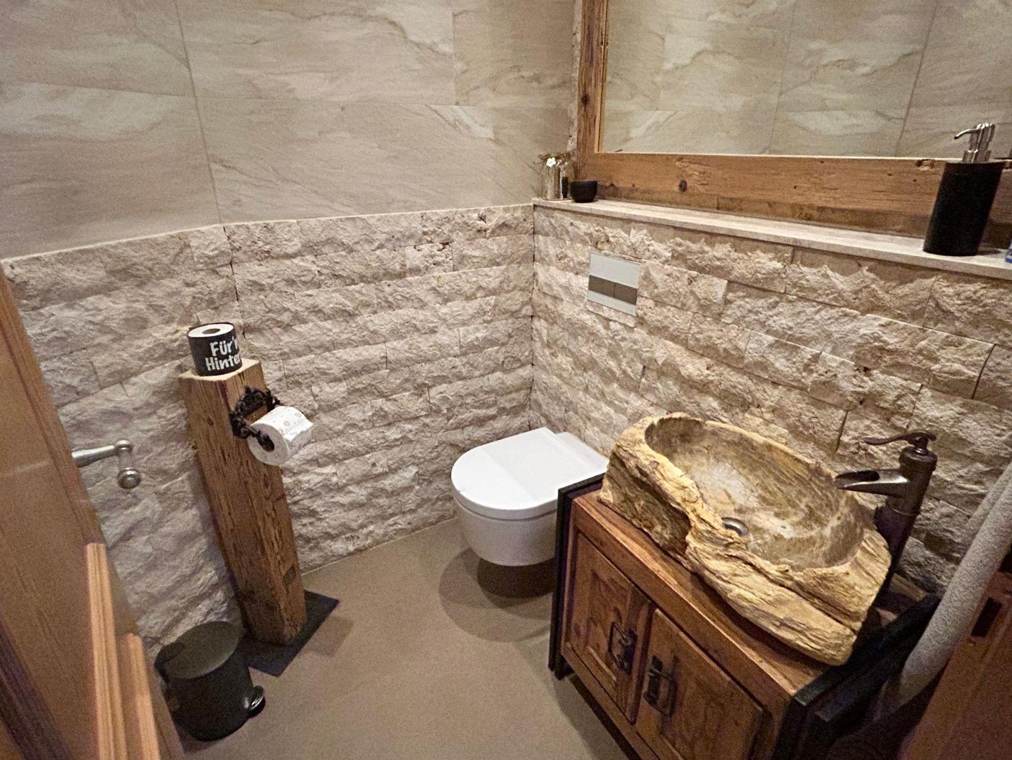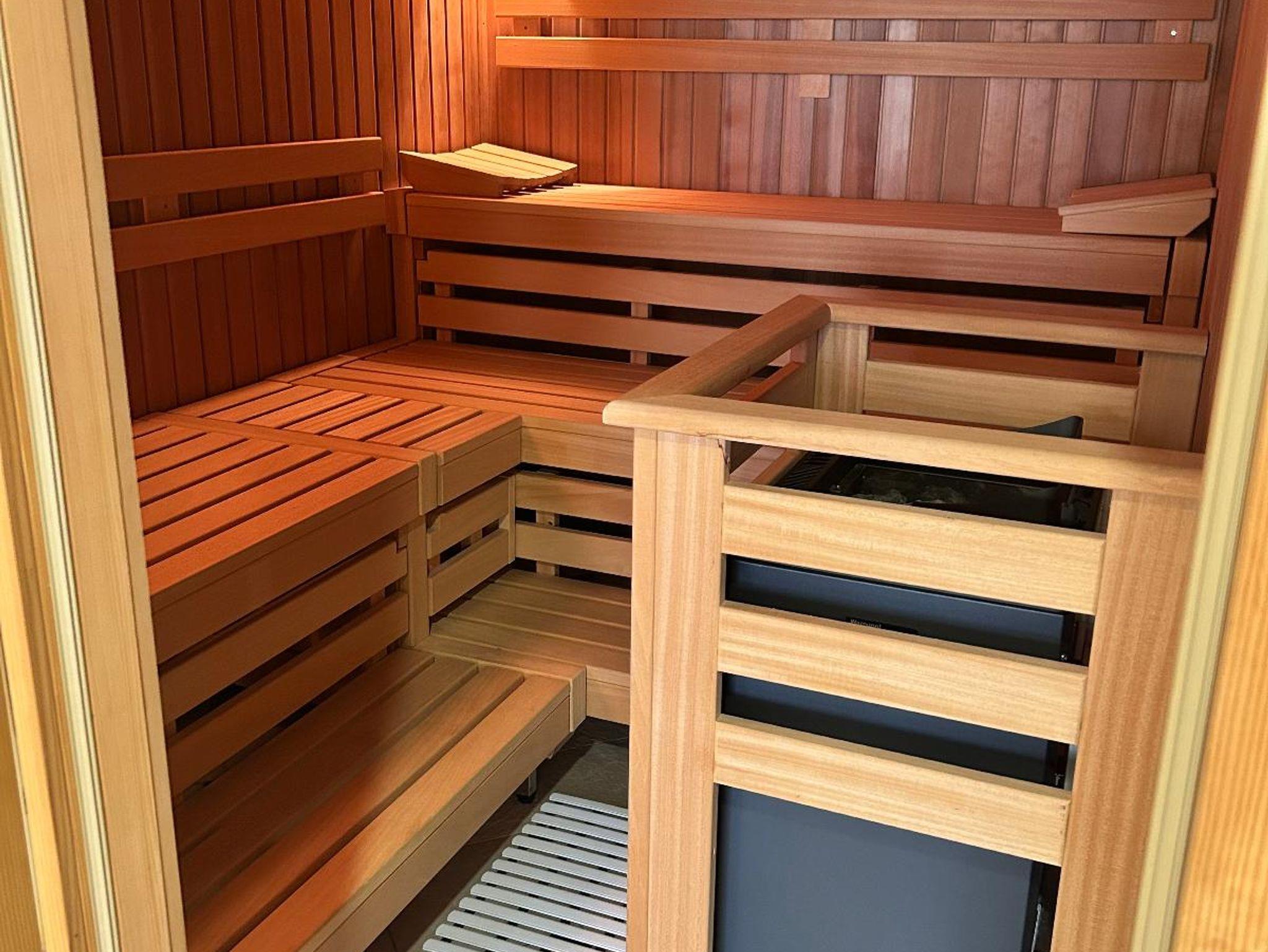 Mit einer großen Warmwasserdusche und den zwei Fußbecken, für genussvolle Wechselbäder, bereiten Sie sich optimal auf den Saunagang vor. Unter der Kaltwasserdusche mit Schwalleimer genießen Sie die schnelle und frische Abkühlung. Ein großer 65-Zoll Fernseher, eine Couch sowie eine Essgruppe tragen zu einem gemeinsamen privaten Wohlbefinden bei.