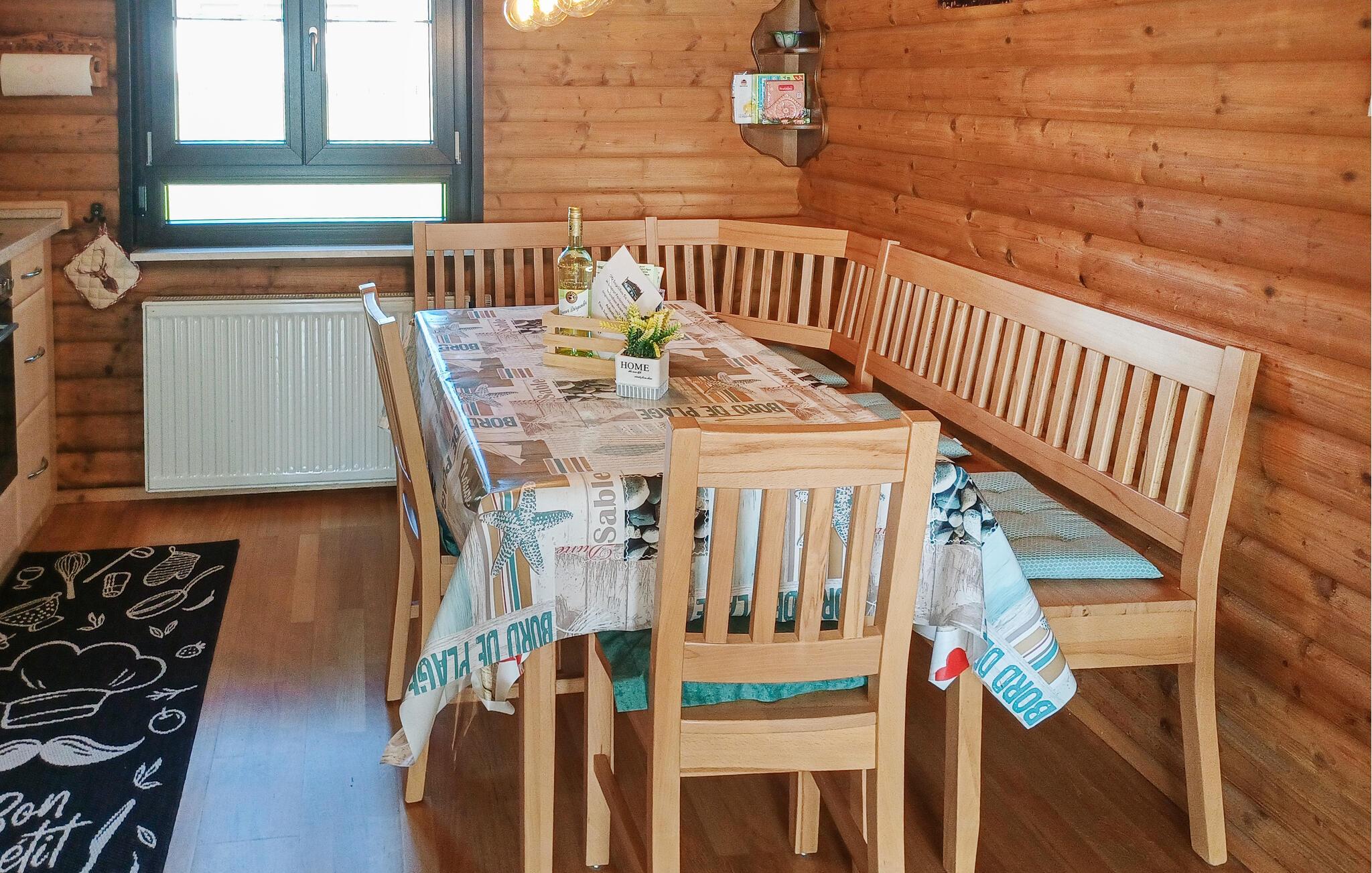 I det komfortable køkken er der en hjørnebænk, hvor I kan side sammen og hygge jer om aftenen. Der er skøn udsigt over den omliggende natur gennem store vinduer.