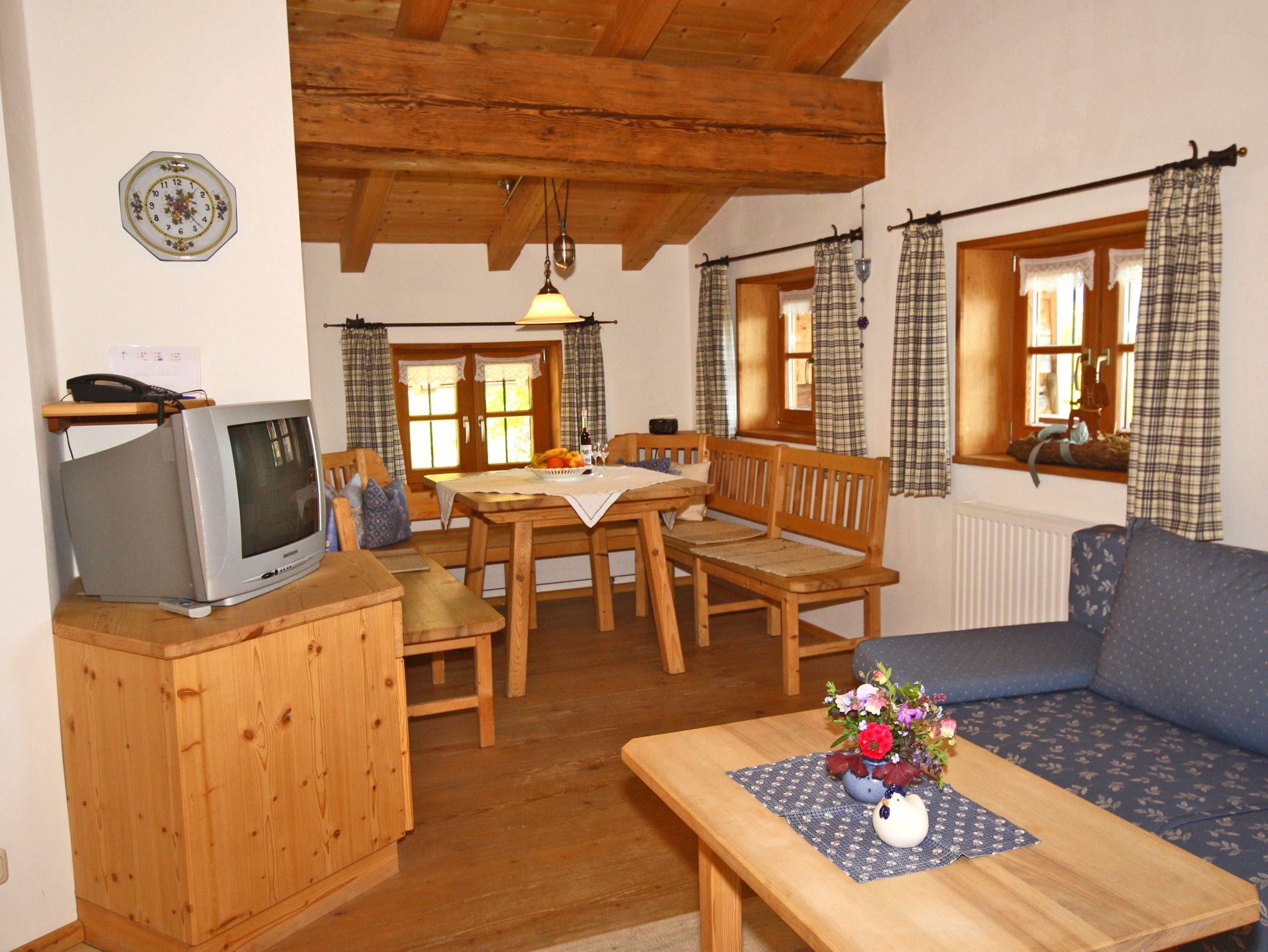 Die Ferienwohnung Geigelstein ist eine behagliche und liebliche Ferienwohnung mit einer romantischen Note. Vom Balkon der Wohnung können Sie einen herrlichen Blick ins Kaisergebirge genießen. Die großzügige Wohnküche ist mit folgenden Geräten ausgestattet: Kühl- und Gefrierschrank, Cerankochfeld, Backofen, Spülmaschine, Kaffeemaschine, Wasserkocher und Toaster. Unsere Schreiner haben eine schöne Eckbank mit Tisch in die gemütliche Nische eingepasst. Ein großes Sofa und ein Fernseher ergänzen die Wohnküche. Es gibt zwei Schlafzimmer. Das Elternschlafzimmer verfügt über ein Doppelbett und das Kinderzimmer ist mit einem Stockbett ausgestattet. Am Balkon stehen gemütlche Stühle, ein geschreinerter Klapptisch und eine Bank. Es ist eine Nichtraucherwohnung. Hunde auf Anfrage.