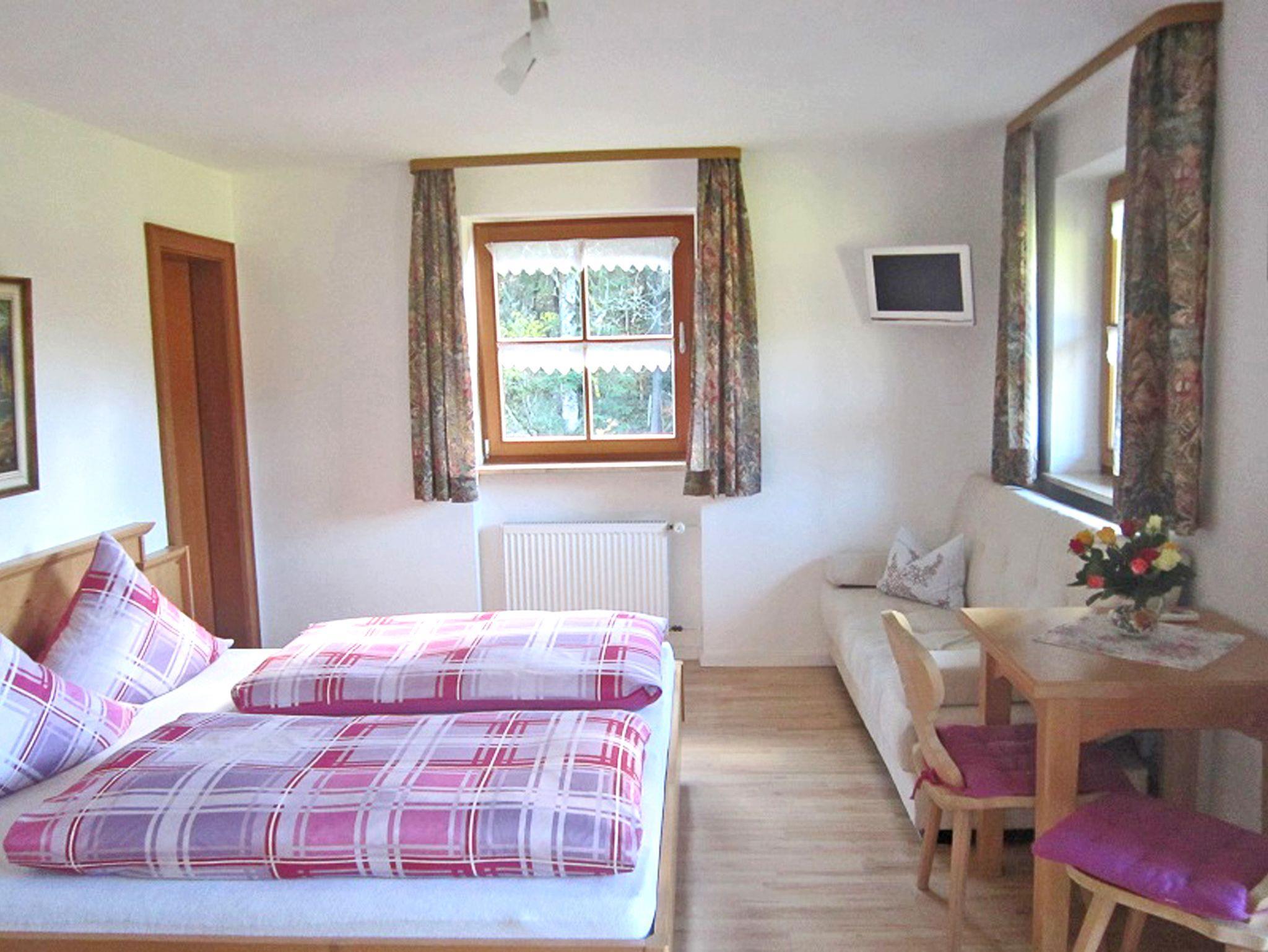 Unser gemütlich eingerichtetes Doppelzimmer ist mit einem Doppelbett und einer ausziehbaren Schlafcouch, digital Flachbild-SAT-TV und Balkon mit Balkonmöbeln ausgestattet. Genießen Sie die herrliche Natur zum Entspannen. Badezimmer mit Dusche/WC, Handtücher und Fön. Im Aufenthaltsraum haben wir für unsere Gäste, zur allgemeinen Nutzung, einen Gäste-Kühlschrank, einen Kaffeeautomaten, sowie Geschirr und Spiele, die jederzeit gerne zur Verfügung stehen. Leider können wir keine Haustiere und Hunde aufnehmen.