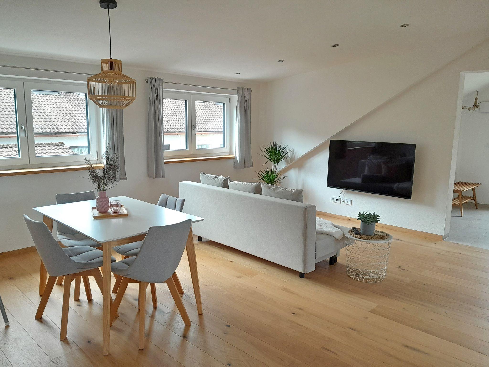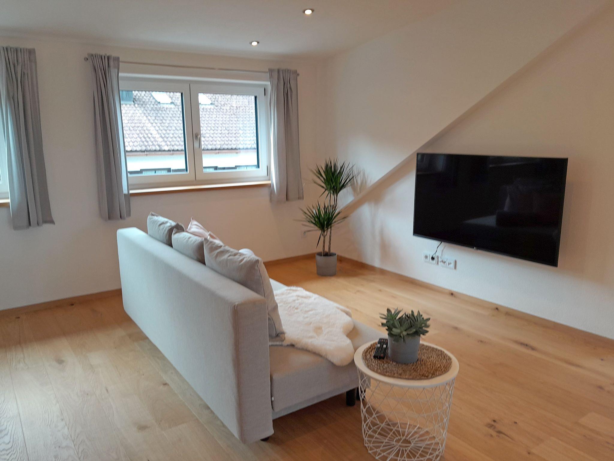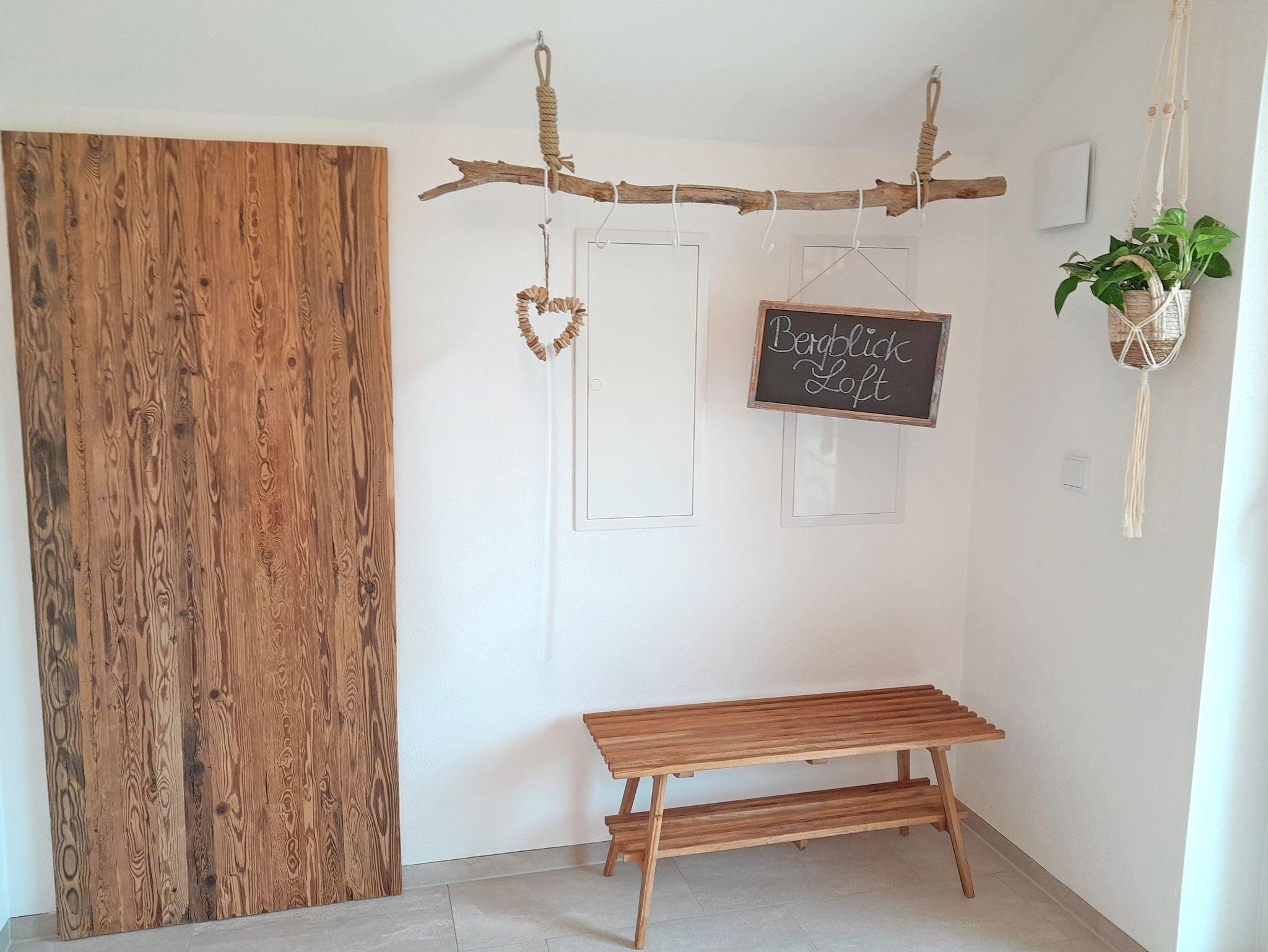 Die 2022 neu erbaute helle Nichtraucher Ferienwohnung Bergblick Loft 60 qm, lädt mit einem großzügigen Wohnraum und durch eine große Holz-Schiebetür abgetrennten Schlafzimmer, zum Entspannen ein. Auf dem West-Balkon genießen Sie die Abendsonne und den Blick auf die Berge. Separates Schlafzimmer mit Doppelbett 160 x 200 cm und offenem Regalschrank. Stilvoll eingerichteter Wohnraum mit Schlafcouch 130 x 190 cm, Flat-SAT-TV, kostenloses WLAN, Esstisch mit Stühlen und offener Küche. Die Küchenzeile ist mit Geschirrspüler, Kühlschrank/Tiefkühlfach, 2-Platten-Cerankochfeld, Mikrowelle, Senseo-Kaffeepadmaschine, Wasserkocher und Toaster ausgestattet. Badezimmer mit Dusche/WC und Fön. Gerne darf auf dem Balkon geraucht werden. Haustiere und Hunde dürfen nicht mitgebracht werden.