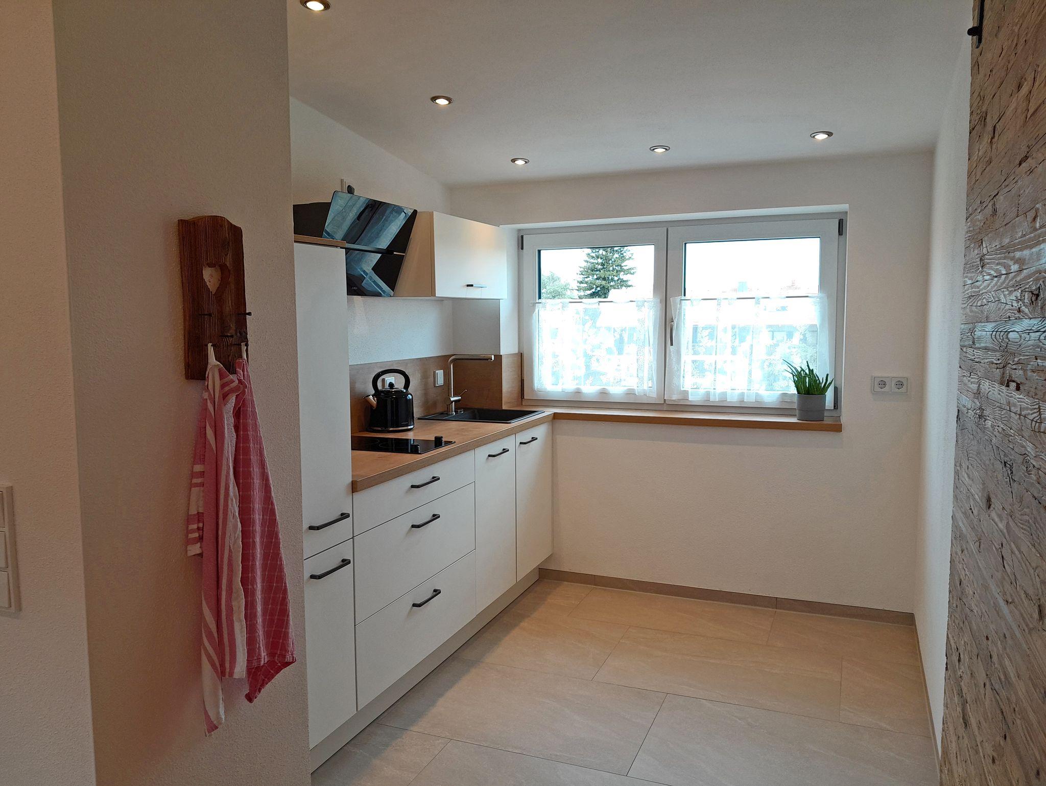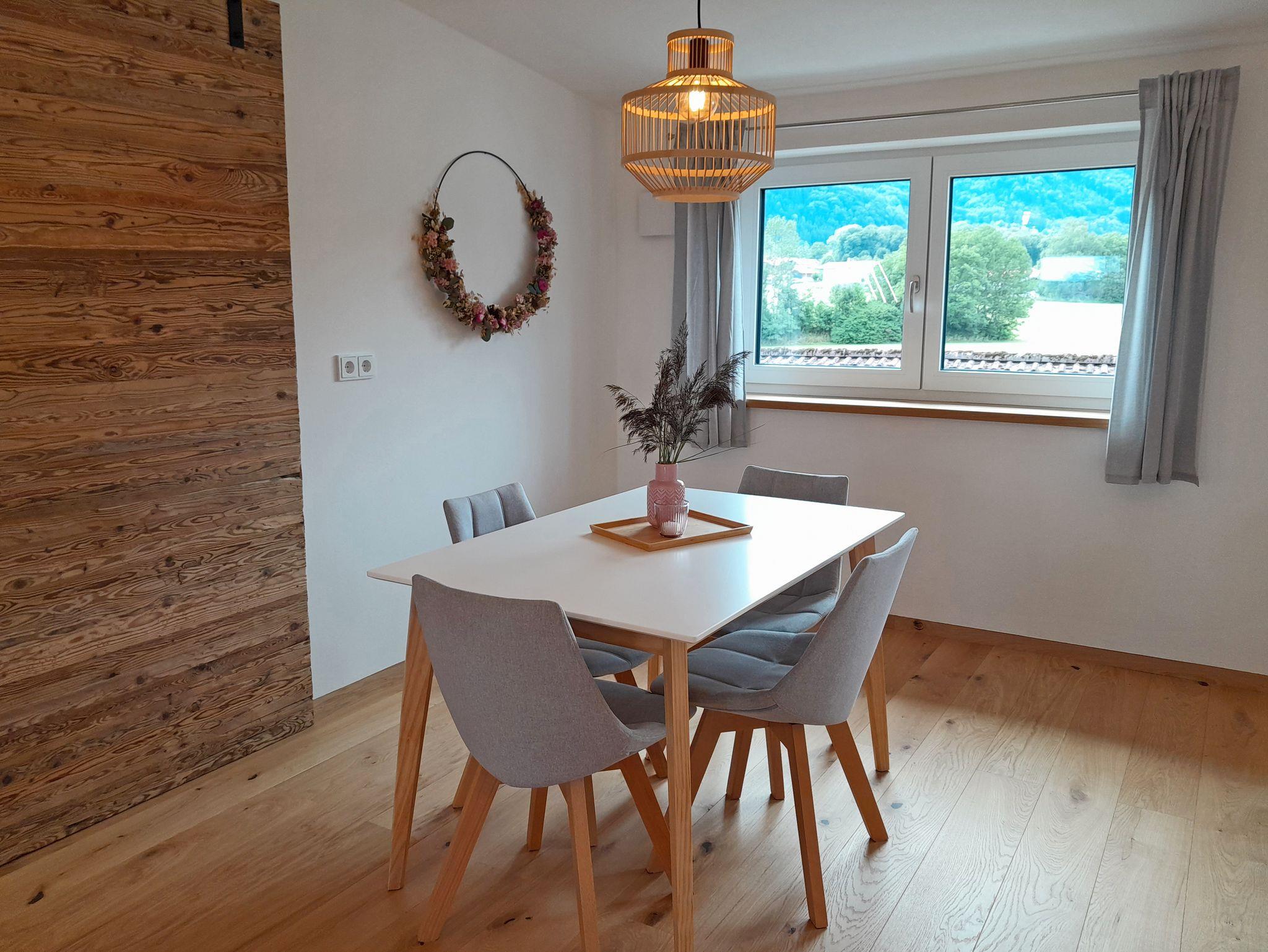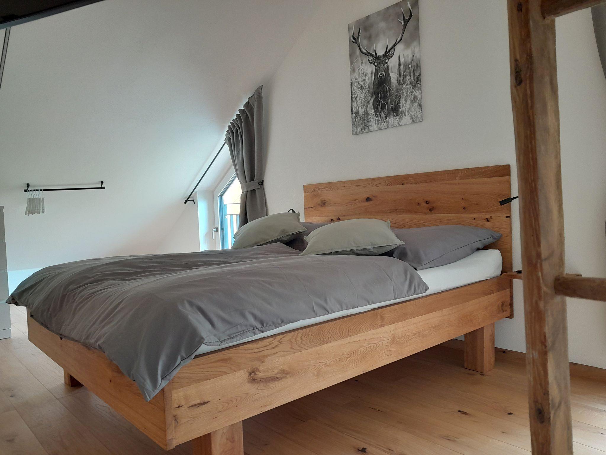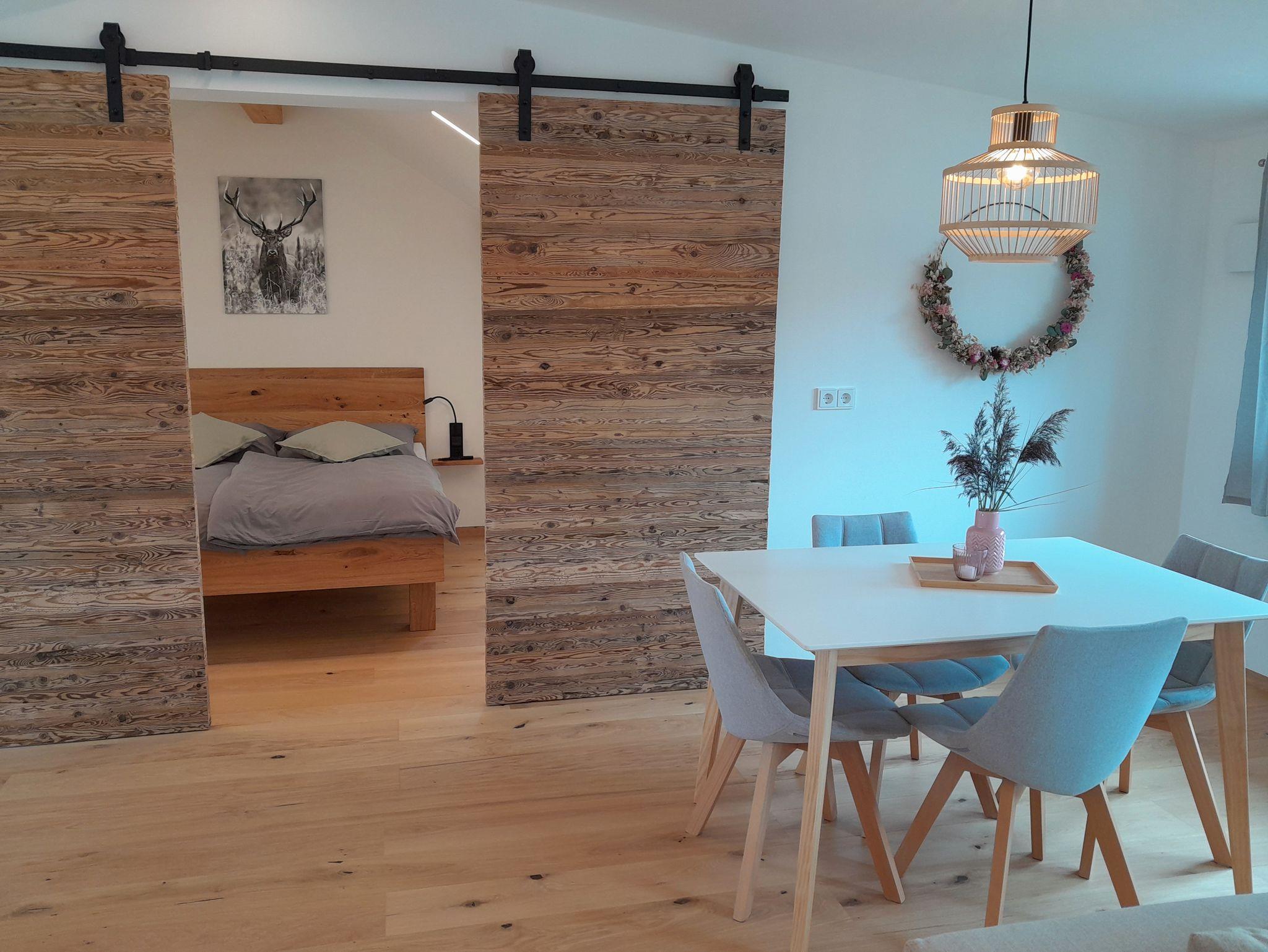 Die 2022 neu erbaute helle Nichtraucher Ferienwohnung Bergblick Loft 60 qm, lädt mit einem großzügigen Wohnraum und durch eine große Holz-Schiebetür abgetrennten Schlafzimmer, zum Entspannen ein. Auf dem West-Balkon genießen Sie die Abendsonne und den Blick auf die Berge. Separates Schlafzimmer mit Doppelbett 160 x 200 cm und offenem Regalschrank. Stilvoll eingerichteter Wohnraum mit Schlafcouch 130 x 190 cm, Flat-SAT-TV, kostenloses WLAN, Esstisch mit Stühlen und offener Küche. Die Küchenzeile ist mit Geschirrspüler, Kühlschrank/Tiefkühlfach, 2-Platten-Cerankochfeld, Mikrowelle, Senseo-Kaffeepadmaschine, Wasserkocher und Toaster ausgestattet. Badezimmer mit Dusche/WC und Fön. Gerne darf auf dem Balkon geraucht werden. Haustiere und Hunde dürfen nicht mitgebracht werden.