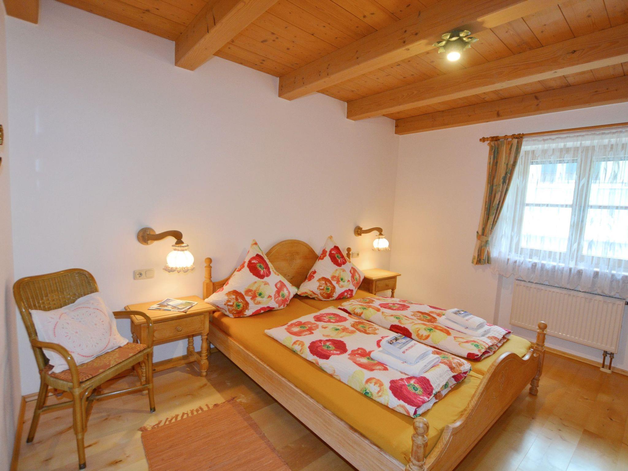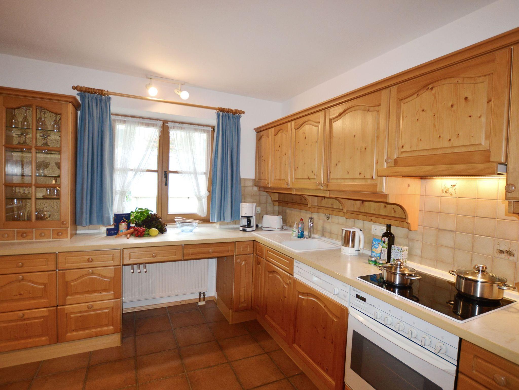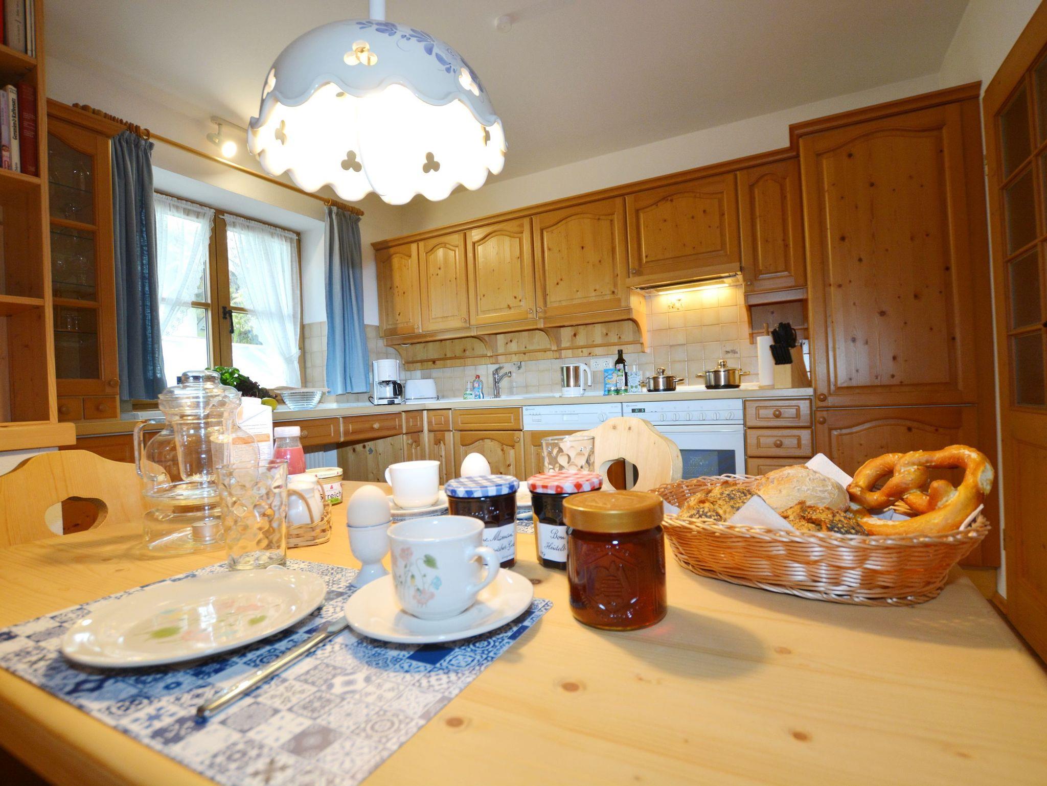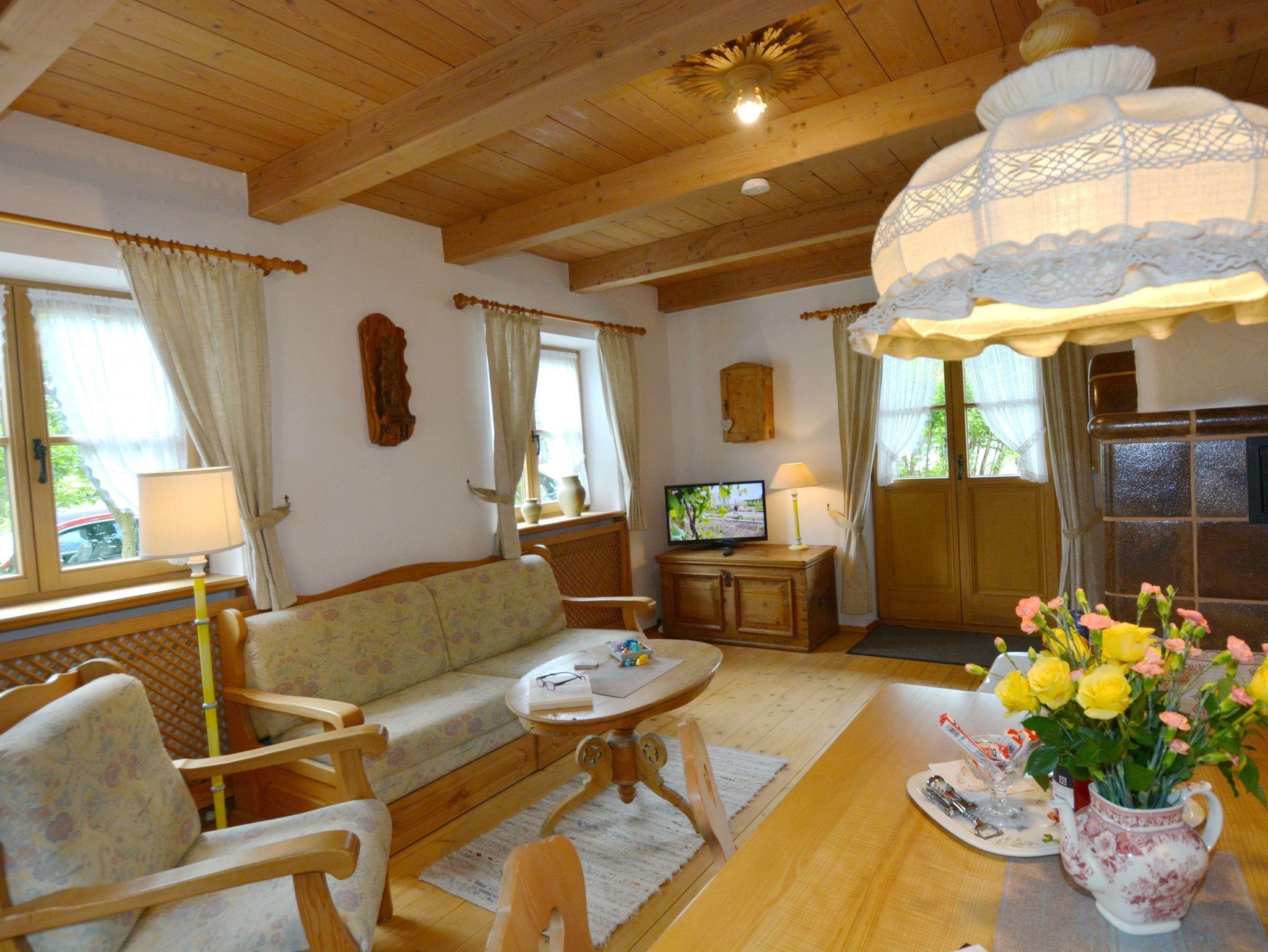 Durchgängig im Landhausstil mit Vollholzmöbeln und Holzdielenböden gehalten strahlt dieses Feriendomizil viel bayerische Gemütlichkeit aus. Im Wohnzimmer befindet sich ein Kachelofen mit Ofenbank und großer Sitzecke sowie eine Couchgarnitur. Die wunderbar geräumige Wohnküche besitzt ebenfalls eine Eckbank mit Esstisch und Stühlen. Ansonsten finden Sie hier alles, was es für einen erholsamen Urlaub im Chiemgau braucht: Vom Herd mit Backofen, Kühl- und Gefrierschrank, Spülmaschine, Kaffeemaschine, Wasserkocher bis hin zu Sekt-, Wein- und Biergläsern ist alles vorhanden. Das Schlafzimmer ist mit einem Doppelbett sowie einem großen Bauernschrank ausgestattet. Badezimmer und WC sind räumlich voneinander getrennt. Das große Bad besitzt außer Dusche und Waschbecken auch eine Badewanne und ein Bidet. Selbstverständlich gibt es hier auch eine Waschmaschine, einen Trockner sowie Wäscheständer und Haarfön.