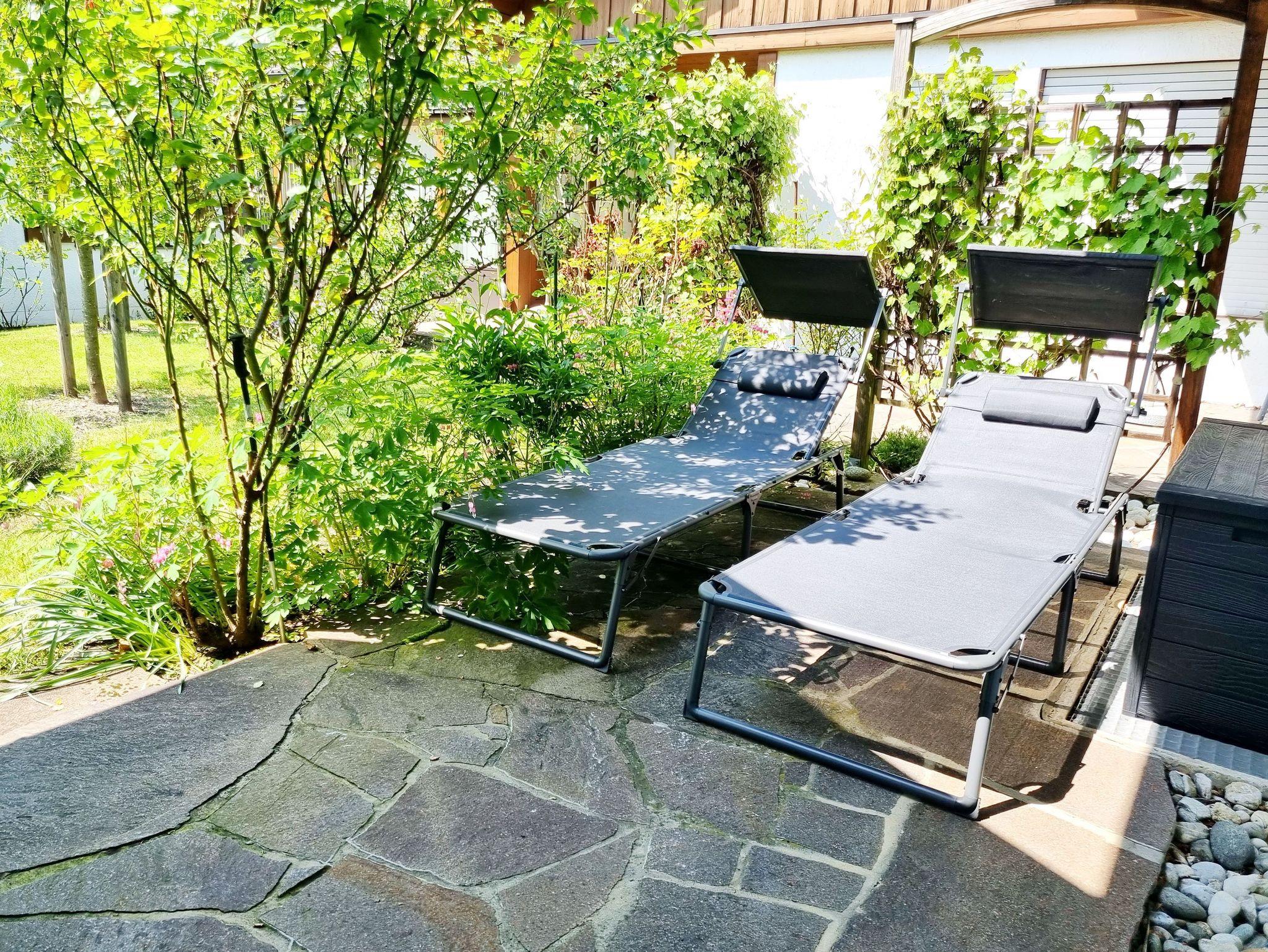 Die West-Terrasse mit Blick in den Garten und zu den Bergen ergänzt dieses schöne Domizil. Mit Tisch, Stühlen und Grill bietet sie alles, um bei schönem Wetter im Freien zu entspannen.