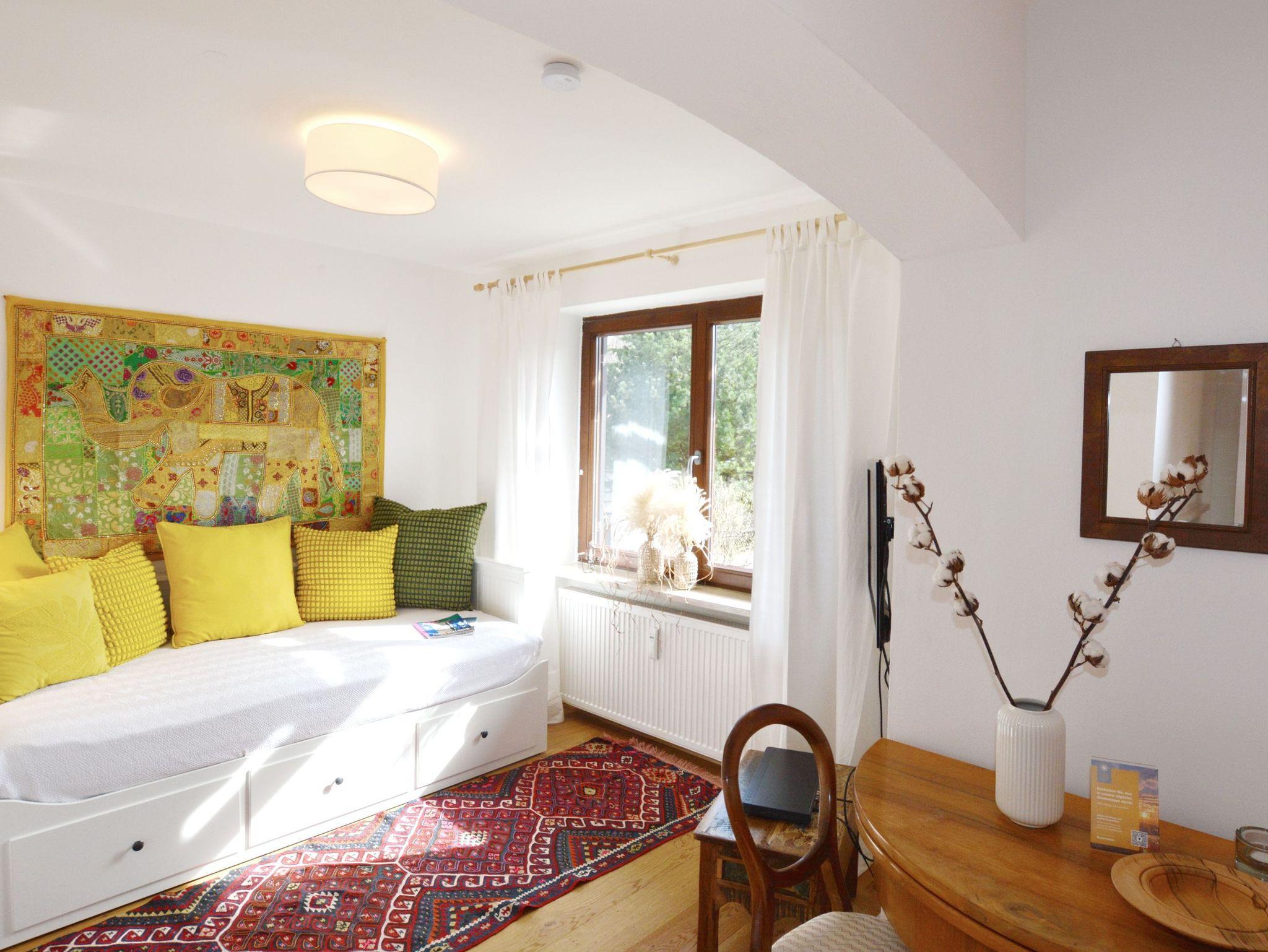 Das Wohlfühlapartment Zillibilly in Aschau im Chiemgau bietet Platz für bis zu 3 Personen und befindet sich in der 1. Etage eines 3-Familienhauses. Es eignet sich besonders für Alleinreisende, Paare oder kleine Familien, die eine entspannte Zeit in der Natur verbringen möchten. Das Domizil vereint Vintage- und moderne Elemente, die durch natürliche Farben, Farbakzenten und Stoffe eine gemütliche Atmosphäre schaffen. Der Wohn- und Essbereich ist der zentrale Raum der Wohnung und lädt nicht nur zum Lesen auf dem Sofa ein. Genießen Sie die Auszeit auch auf dem Südbalkon, welcher über den Wohnbereich betreten werden kann. Jeder Hobbykoch schwingt sicherlich gerne in der topausgestatteten Küche, welche mit großer und hoher Arbeitsfläche, Induktionskochfeld, hohem Backofen uvm ausgestattet ist, seinen Kochlöffel. Im Badezimmer mit einer Walk-In Regendusche können Gäste sich erfrischen, um danach den Abend im Chiemgau ausklingen zu lassen. Nach einem ereignisreichen Tag fällt man dann gerne in das Doppelbett des Schlafzimmers. Ein Einzelbett ist in einer Nische des Wohnbereiches gegeben, welches durch einen Paravant auch optisch von diesem getrennt werden kann.
