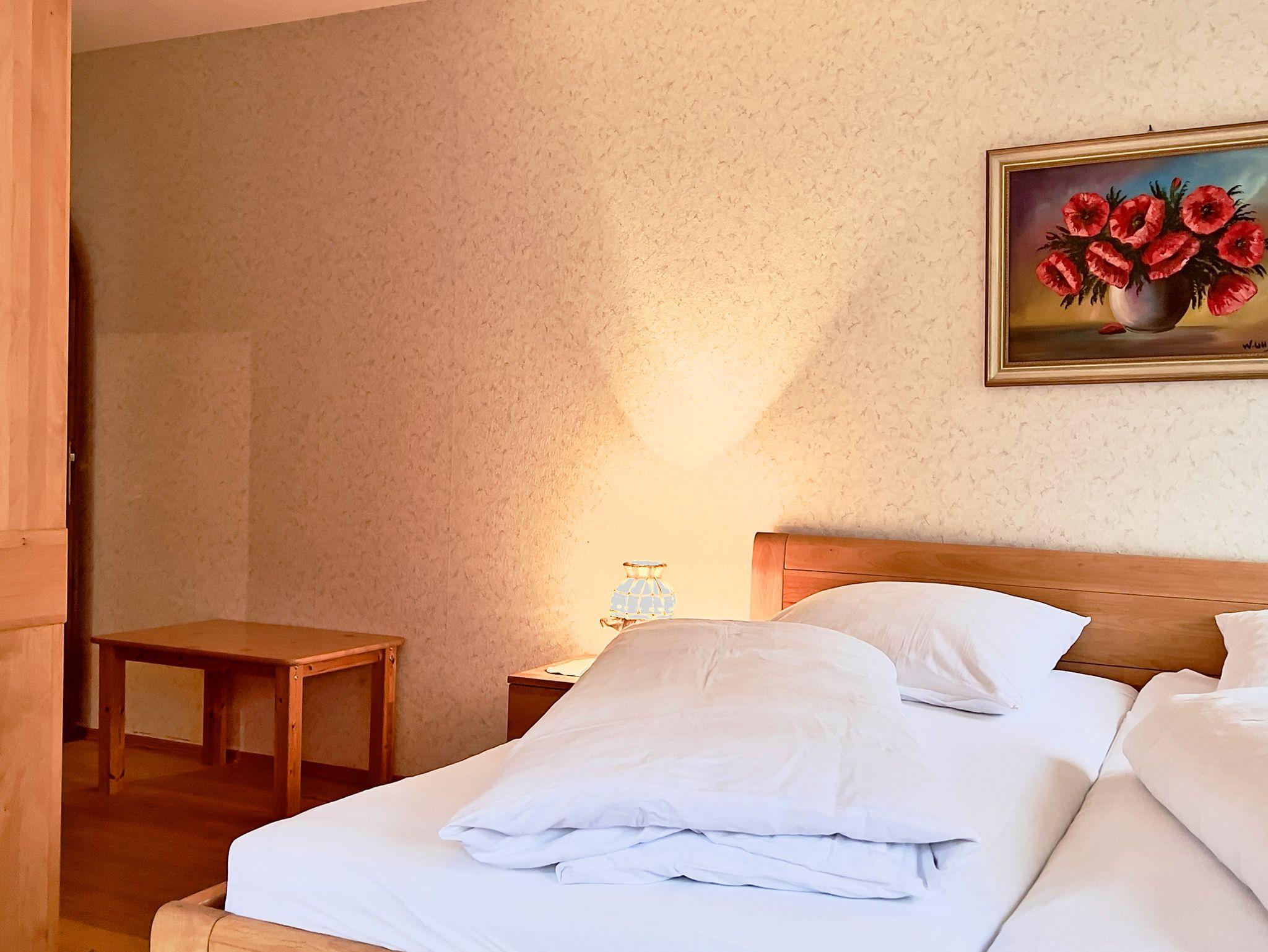 Großes helles Doppelzimmer mit Dusche/WC, Föhn, TV, kostenloses WLAN und Balkon. Herrlicher Blick vom Balkon auf das Zellerhorn und die umliegenden Berge. Ein Hund darf gegen Aufpreis gerne mitgebracht werden. Ihr Frühstück genießen Sie im Frühstücksraum.