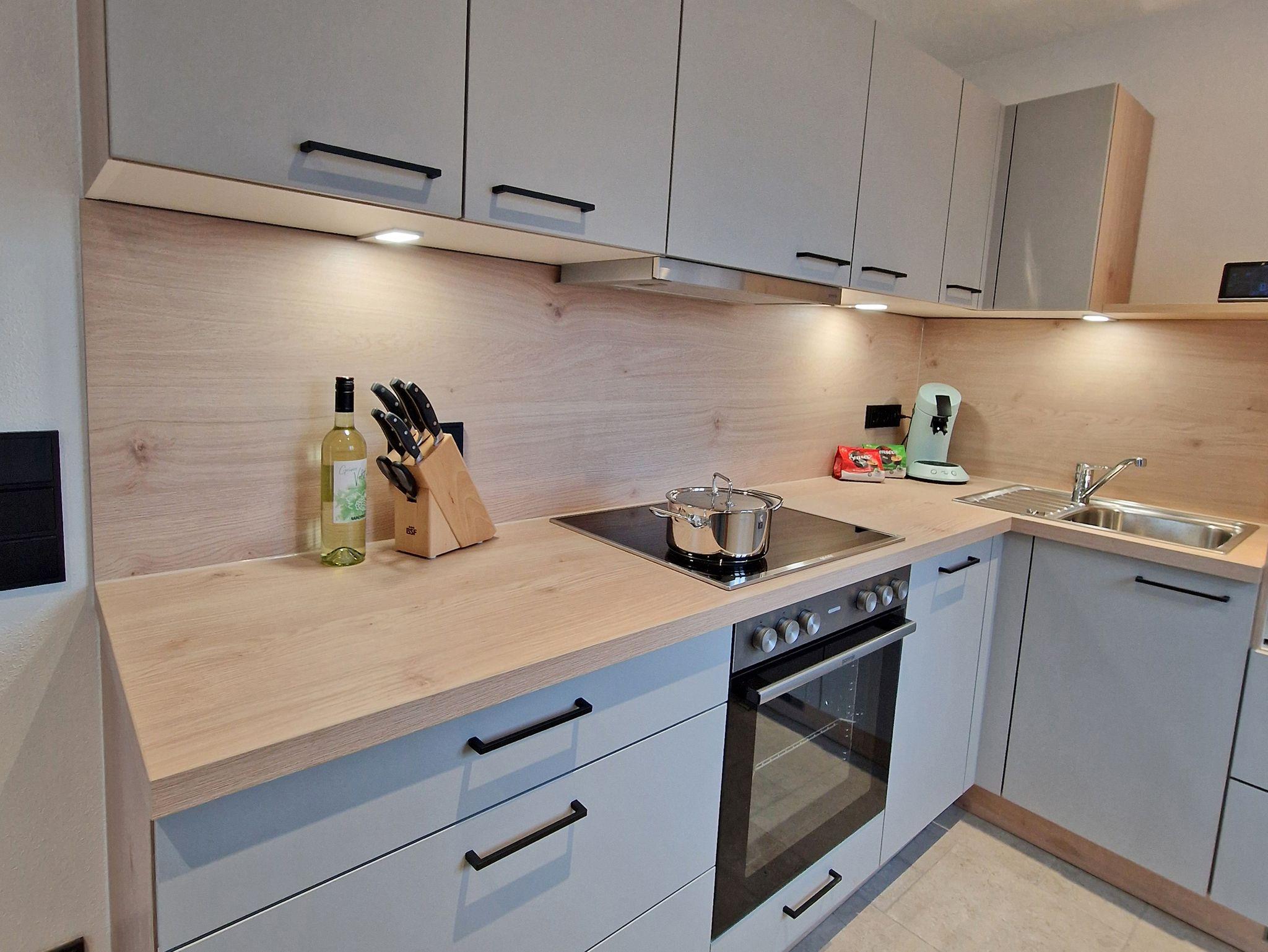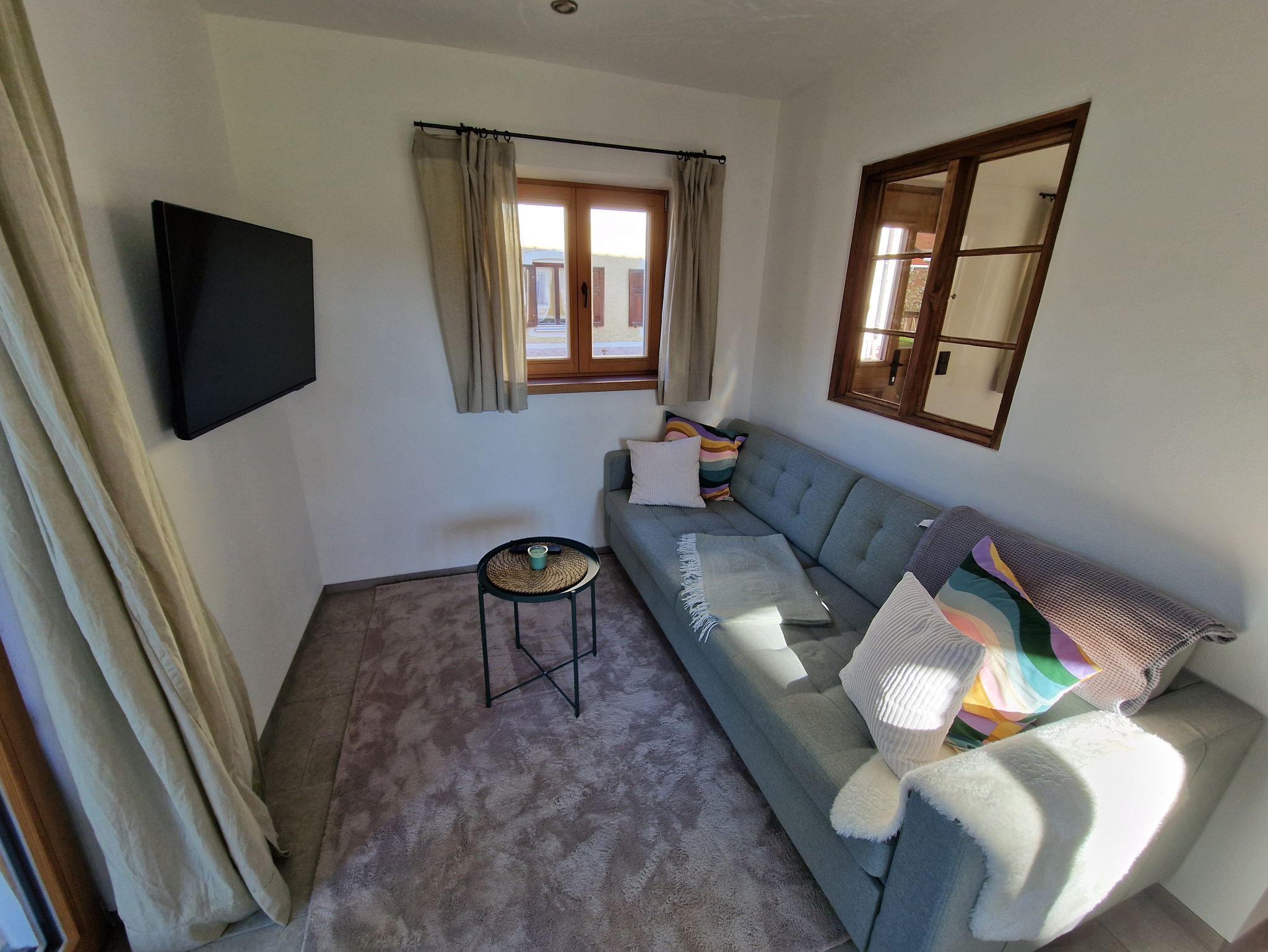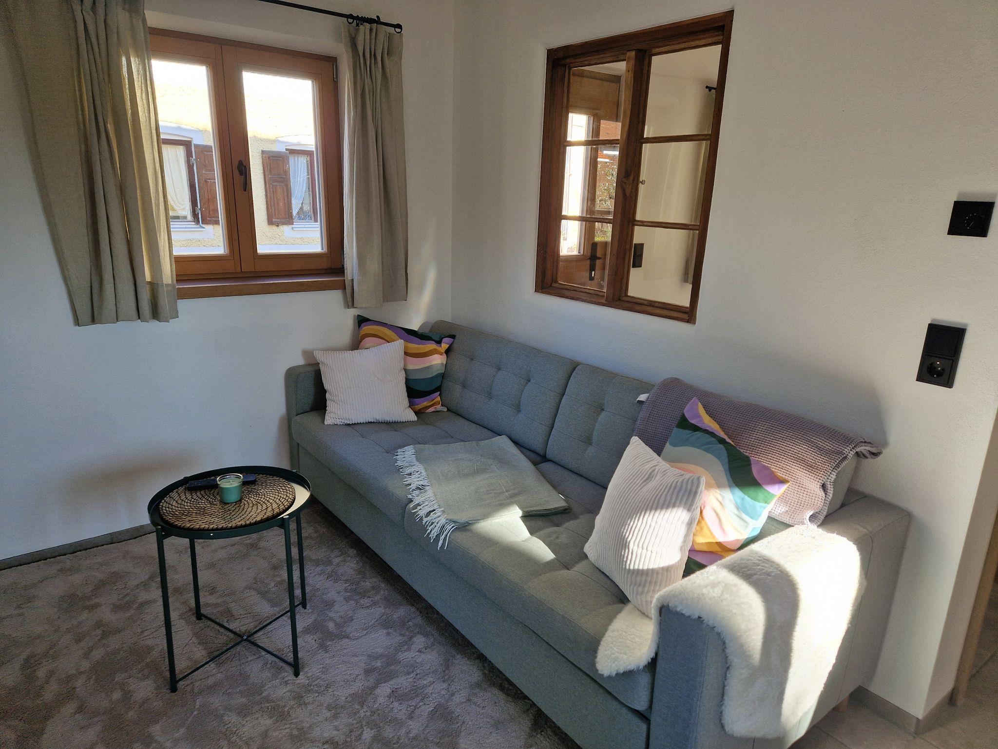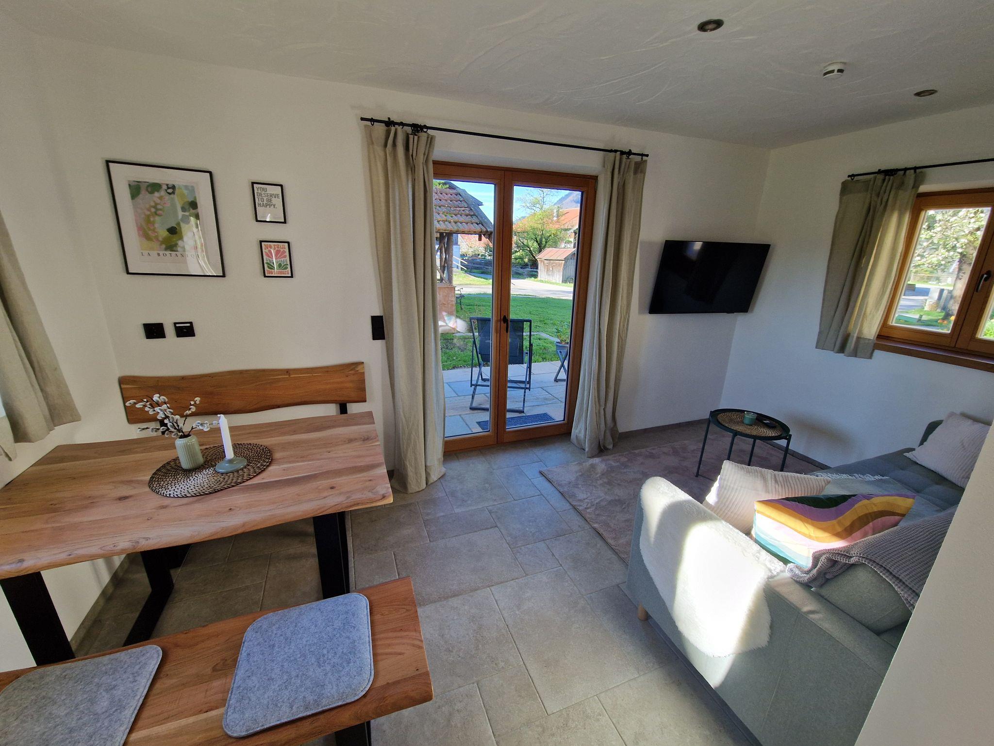 Unser gemütliches Chalet erstreckt sich über zwei Etagen und bietet Platz bis zu vier Personen – ideal für Familien, Paare oder Freunde. Im Erdgeschoss erwartet Sie eine offene, moderne Küche mit Geschirrspüler, Kühlschrank und Backofen, eine einladende Essecke sowie ein gemütlicher Wohnbereich. Von hier aus gelangen Sie direkt auf die Terrasse mit einem eigenen kleinen Garten, wo Sie einen traumhaften Blick auf Höhenberg, die charmante Kirche und die umliegenden Berge genießen können.