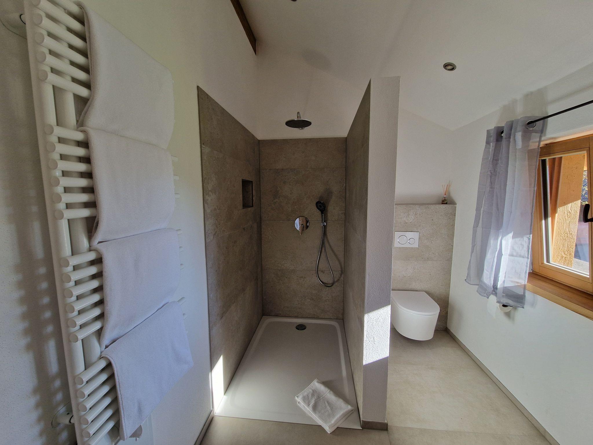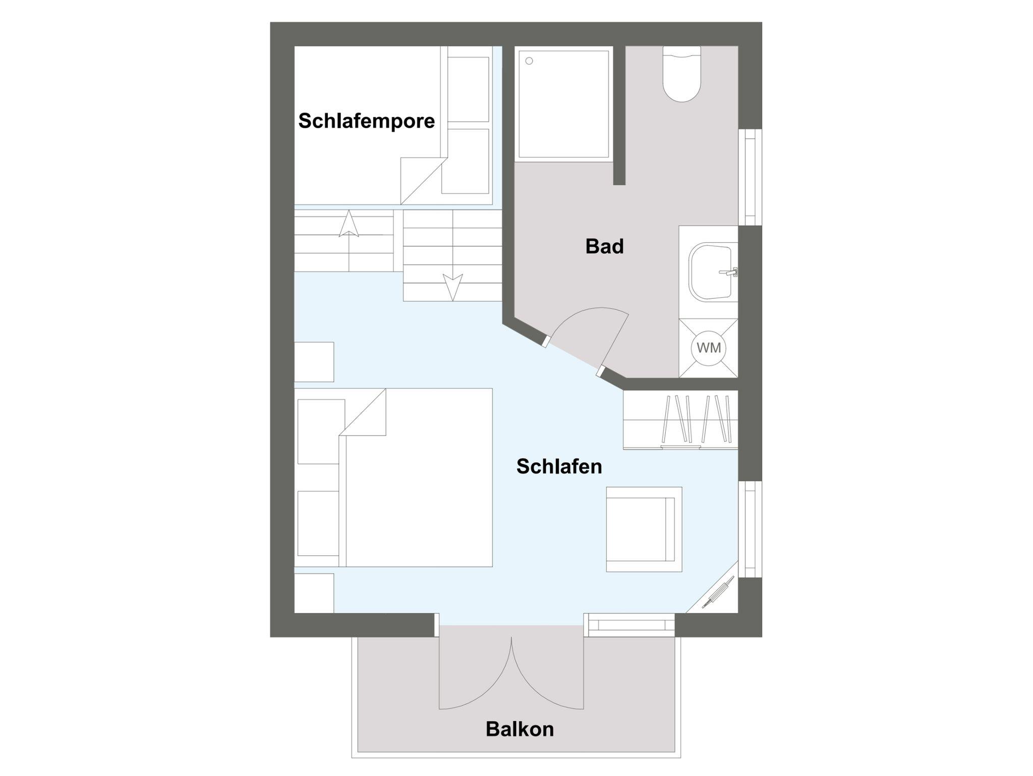 Im Obergeschoss finden Sie ein geräumiges Schlafzimmer mit einem komfortablen Doppelbett (180x200 cm) sowie eine praktische Schlafempore (160x200 cm) in der Dachschräge (niedrige Höhe), die sowohl für Kinder als auch für Erwachsene geeignet ist. Für die kleinsten Gäste stellen wir gerne ein Babybett bereit. Vom Schlafzimmer aus haben Sie Zugang zu einem kleinen Balkon, der ebenfalls mit einem herrlichen Ausblick auf die Berge und Wiesen punktet. Ein modernes Badezimmer mit ebenerdiger Dusche, WC, Waschbecken und Waschmaschine rundet das Obergeschoss ab. Das charmante Ferienhaus lädt zum Wohlfühlen ein – als Nichtraucherhaus bietet es eine rauchfreie Atmosphäre, doch auf der einladenden Terrasse ist das Rauchen gestattet. Natürlich bieten wir Ihnen kostenfreies WLAN im gesamten Chalet und auch im Außenbereich. Ein Parkplatz steht Ihnen direkt vor dem Haus zur Verfügung. Bitte beachten Sie, dass Hunde und andere Haustiere leider nicht gestattet sind.