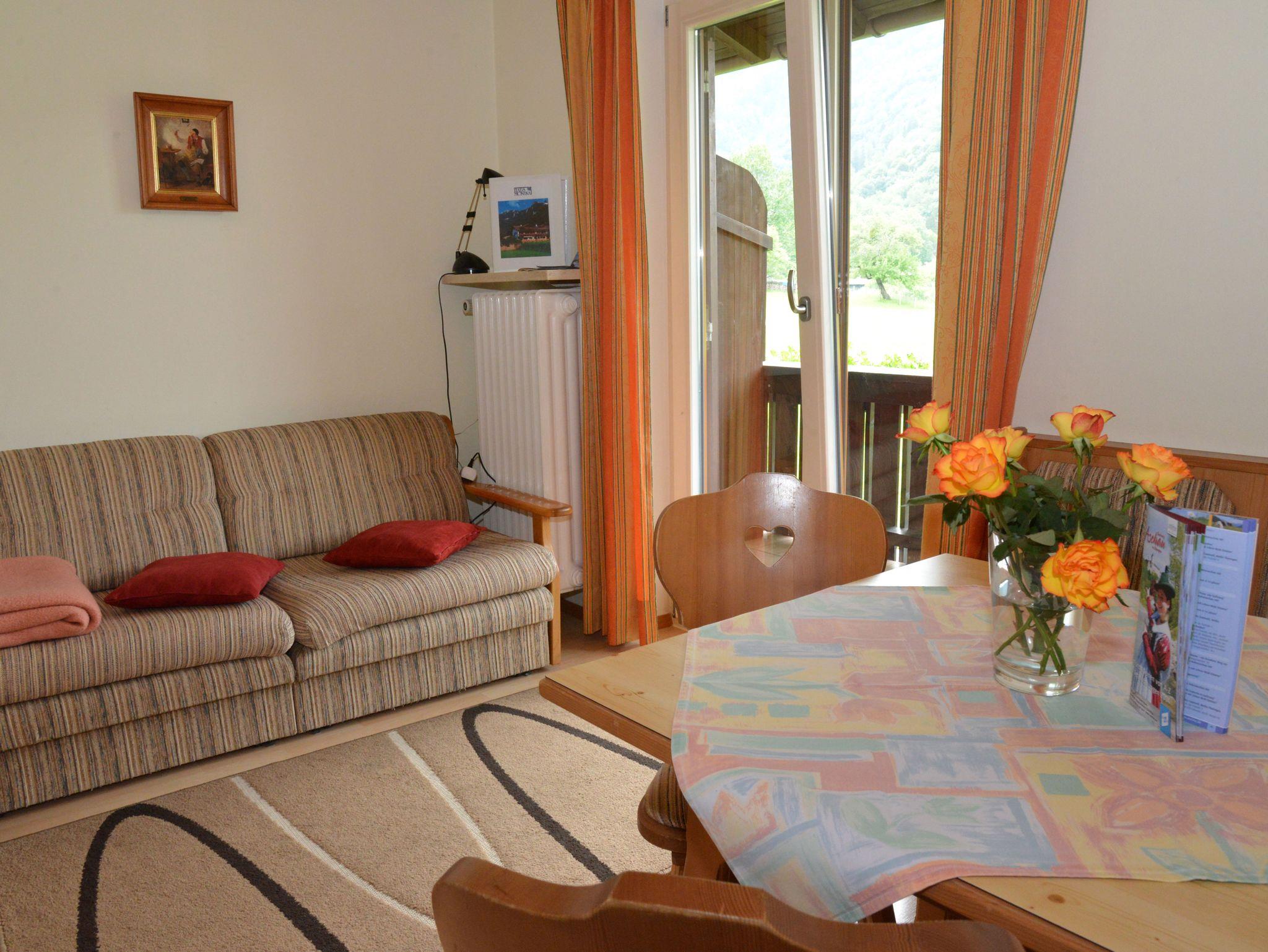 Gemütlich komfortabel und liebevoll eingerichtete Ferienwohnung (40 qm) im 1. Obergeschoss mit großem Süd-West-Balkon und herrlichem Gebirgsblick. Separates Schlafzimmer mit Doppelbett 1,8 m x 2 m. Komplett ausgestattete Wohnküche mit Kaffeemaschine, Toaster, Ausziehcouch, Kabel-HD-TV und kostenloses WLAN. Badezimmer mit Dusche/WC. Handtücher und Bettwäsche stehen zur Verfügung. Gerne dürfen Sie gegen Aufpreis einen Hund mitnehmen.