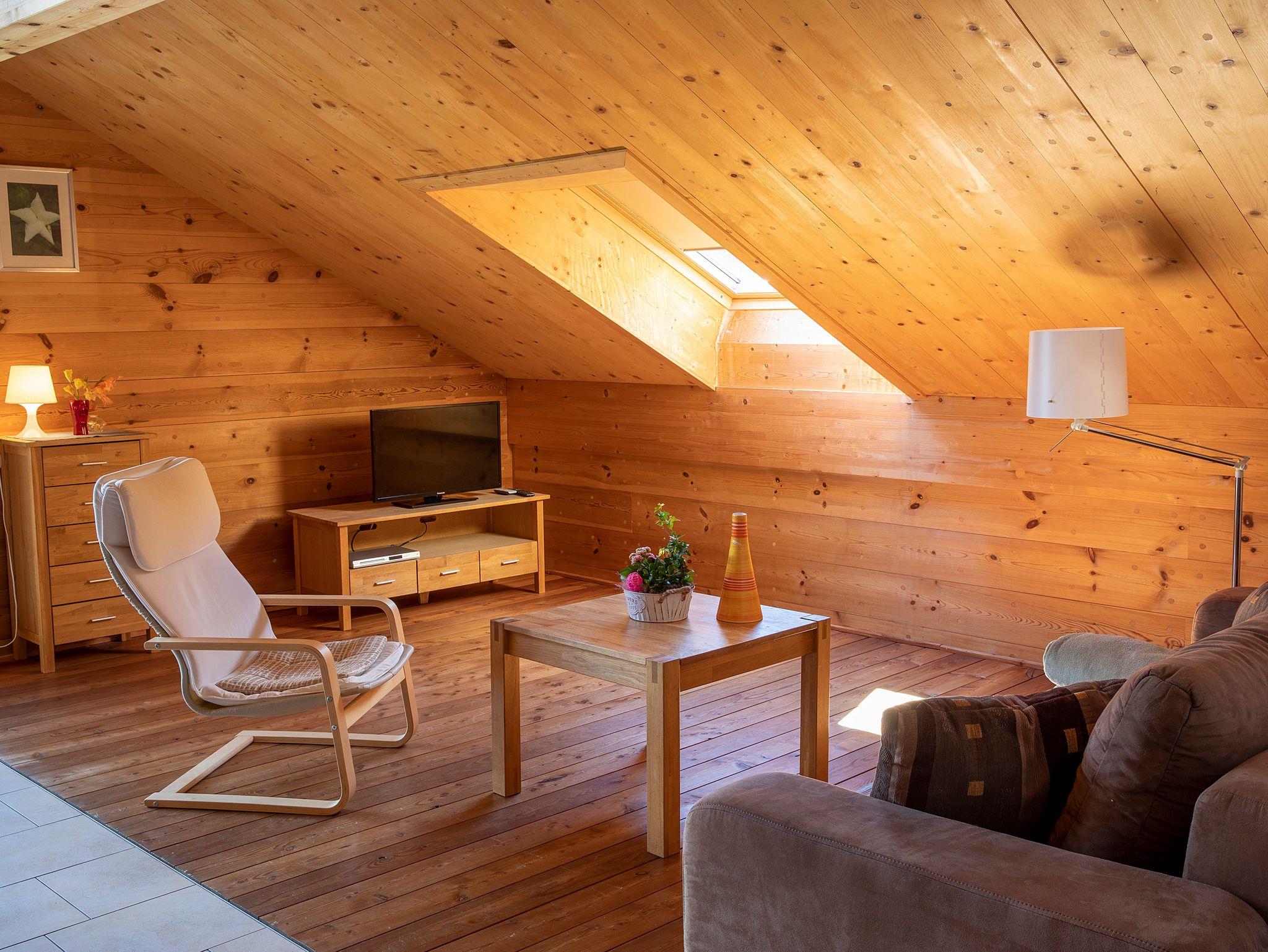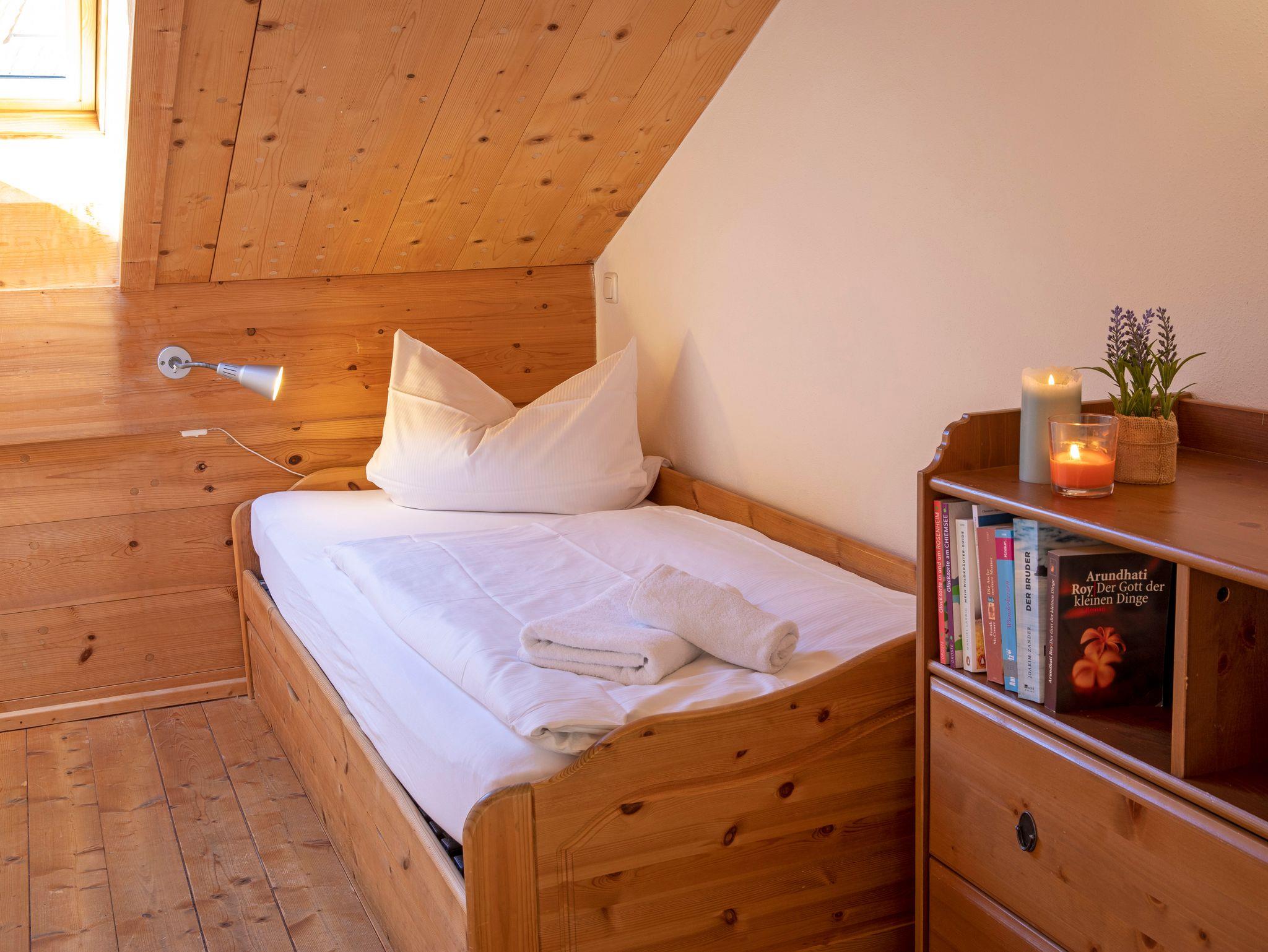 Die großzügig, helle und gemütliche mit Mondphasenholz und Lehm gestaltete 64 qm Nichtraucher Ferienwohnung im Dachgeschoss mit schönem hohen Sichtdachstuhl, Süd-Balkon und Panoramablick auf die Kampenwand, lädt durch ihre Naturholzmöbel mit Wohlfühlambiente, Fußboden- und Wandheizung zum Erholen ein. Genießen Sie Ihre Auszeit in einem großen Wohnraum mit offener Küche und Essplatz. Der Wohnbereich mit Schlafcouch, SAT-Flat-TV, Internetanschluss, kostenloses W-LAN, die voll ausgestattete Küche mit 4-Platten-Cerankochfeld/Backofen, Geschirrspüler, Kühlschrank/Tiefkühlfach, Moccamaster Kaffeemaschine, Wasserkocher und Toaster. Zwei separate Schlafzimmer: Ein Schlafzimmer mit einem Doppelbett und das zweite Schlafzimmer mit einem Einzelbett mit Ausziehbett. Das Ausziehbett ist in Form einer Unterschublade gestaltet und lässt sich einfach ausziehen. Badezimmer mit Natursteindusche, Fußboden- und Wandheizung, WC und Föhn. Bettwäsche und Handtücher sind vorhanden.