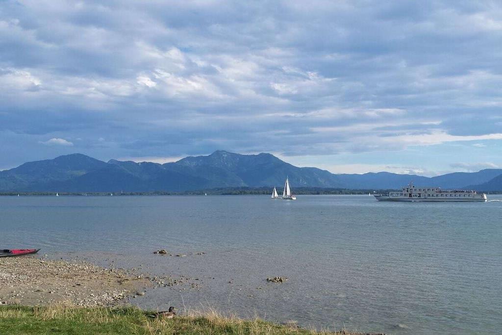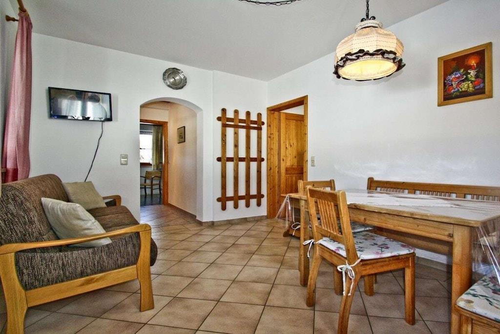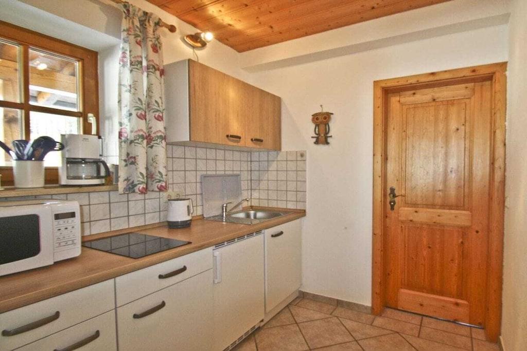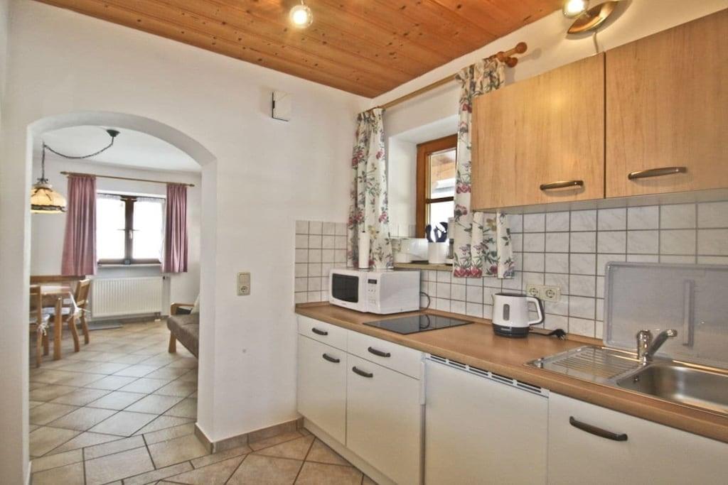 Gemütliche, sehr ruhige, ebenerdige Ferienwohnung mitten in den Bergen am Fuße der Kampenwand und Chiemgauer Berge. Die Wohnung liegt auf 835m Höhe. Parken bei der Eingangstüre. Große Terrasse mit Blick auf Wald, Wiesen und Berge laden ein zum Faulenzen, Relaxen, Entspannen, Lesen... Sie sind total ungestört und der Platz gehört nur Ihnen alleine.Hören die Vögel und sehen unseren Kühen beim Grasen zu. Sehr gut ausgestattete Küche mit Mikrowelle, 2 Herdplatten, Kühlschrank mit Gefrierfach, 1 Wohnbereich mit Sitzecke und Ausziehcouch für 3. Person. TV, großes Bad mit Dusche und Fußbodenheizung und 2 Fenster, Schlafzimmer mit Parkett, Betten ohne Fußende, 200x200. Von der Ferienwohnung starten Sie direkt zu den Almen und ins Wandergebiet.