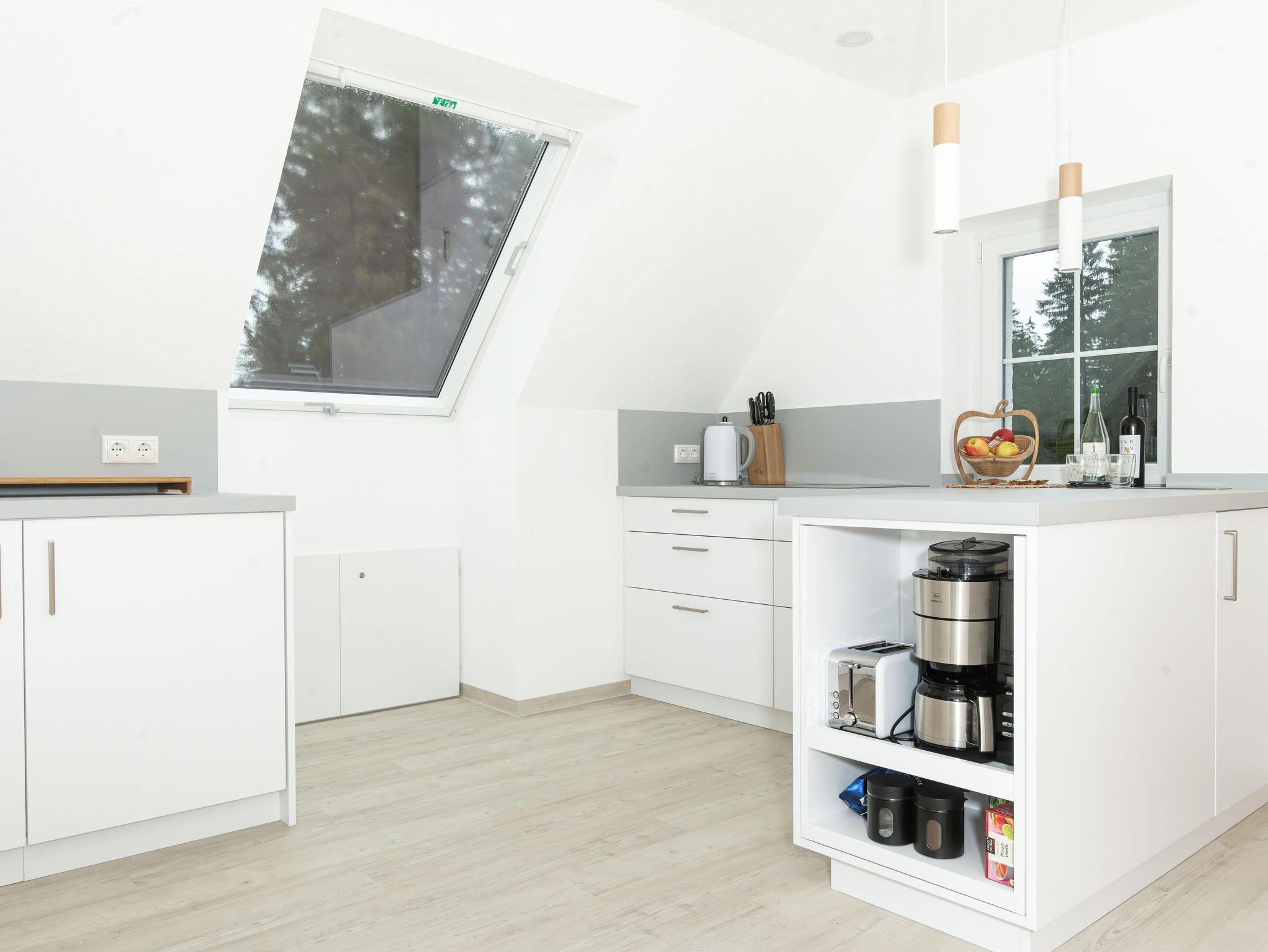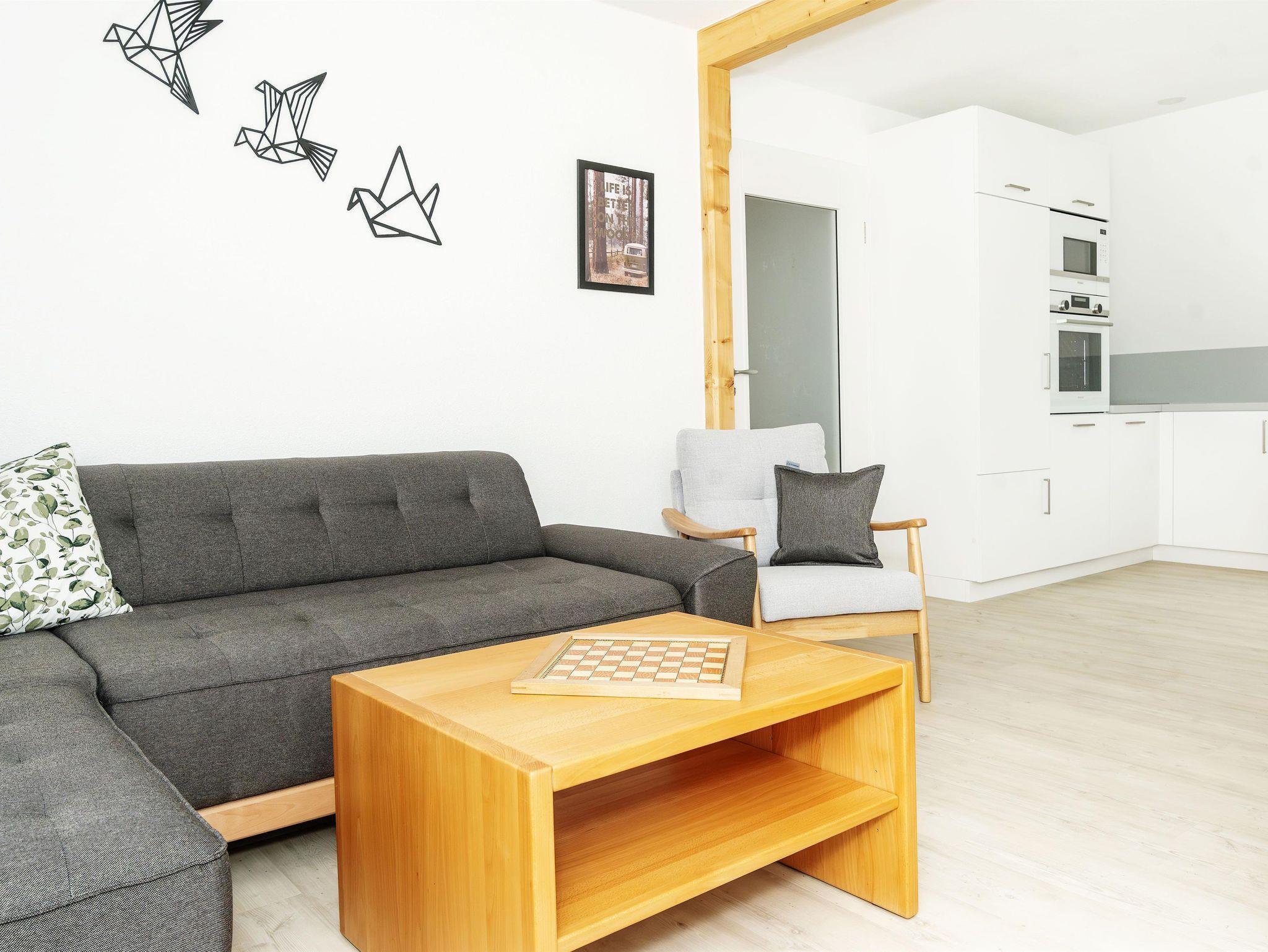Die Ferienwohnung Wipfelglück befindet sich in der 2. Etage der Quelle. Entspannen Sie inmitten der Baumkronen und genießen Sie das beruhigende Zwitschern der Vögel in nächster Nähe. In der Küche wird es Ihnen dank Backofen, Mikrowelle, Geschirrspüler etc. leicht gemacht, ein leckeres Essen zu zaubern. TV+Soundbar und Spiele laden zu gemütlichen Abenden ein. Buchen Sie für bis zu 4 Personen stehen Ihnen zwei Schlafräume (1x Doppelbett 180x200 und 1x 2 Einzelbetten 90x200) zur Verfügung. Eines der Zimmer ist mit einem Stapelbett ausgestattet, was es geräumig macht oder so, dass hier bequem 2 Kinder ihr Bett beziehen können (ggf. auch mit Kinderreisebett). Ab 5 Personen erhalten Sie Zugang zu einem weiteren, separaten Schlafzimmer (Doppelbett 180x200) mit TV auf gleicher Etage, jedoch außerhalb der Wohnungseingangstür. Das Bad ist so gut wie möglich barrierefrei, mit großer ebenerdiger Dusche und Wanne. Bei Bedarf können am WC Haltegriffe angebracht werden. Frischluft tanken Sie in unserem Außenbereich mit Terasse und Grill.