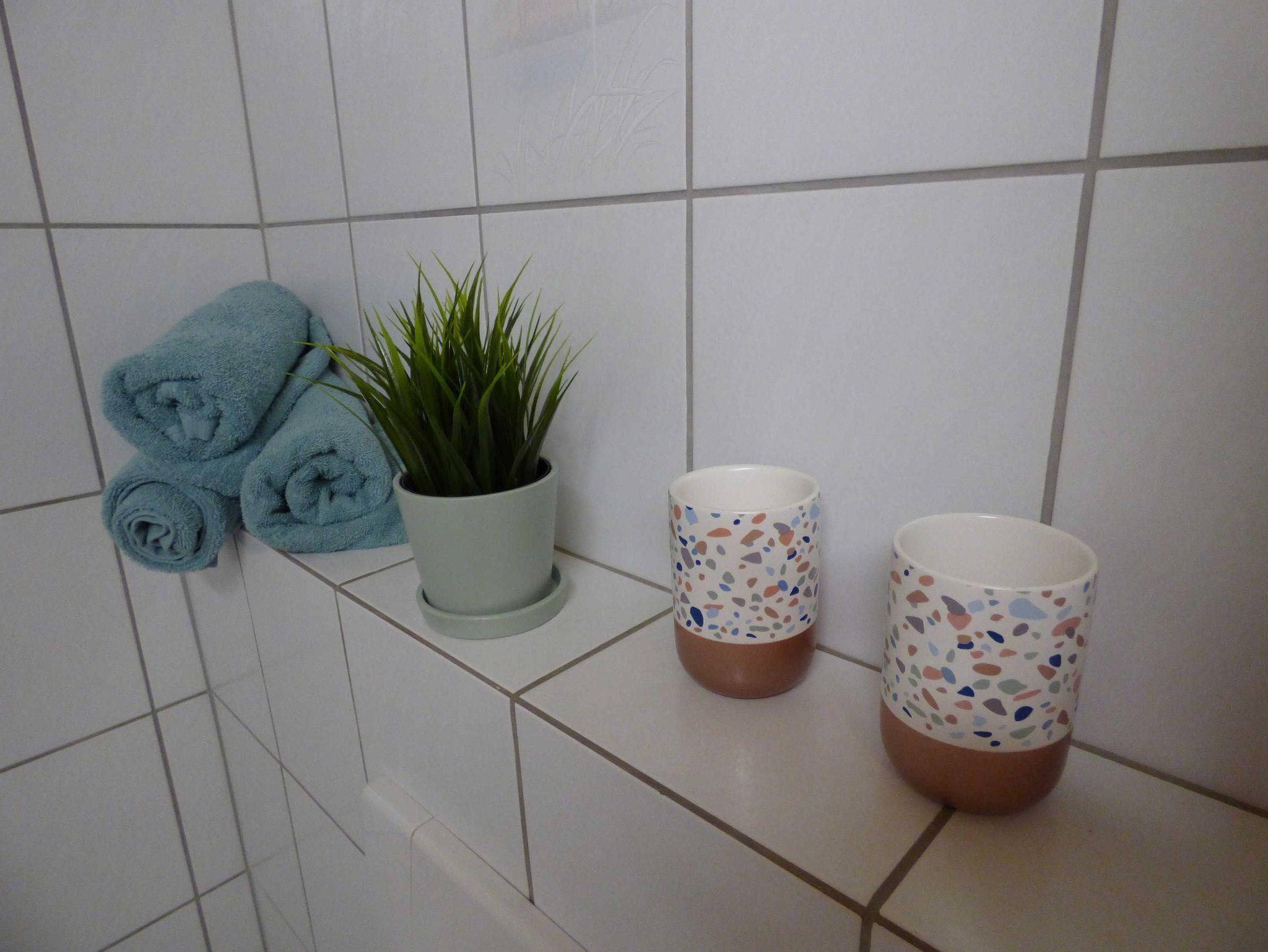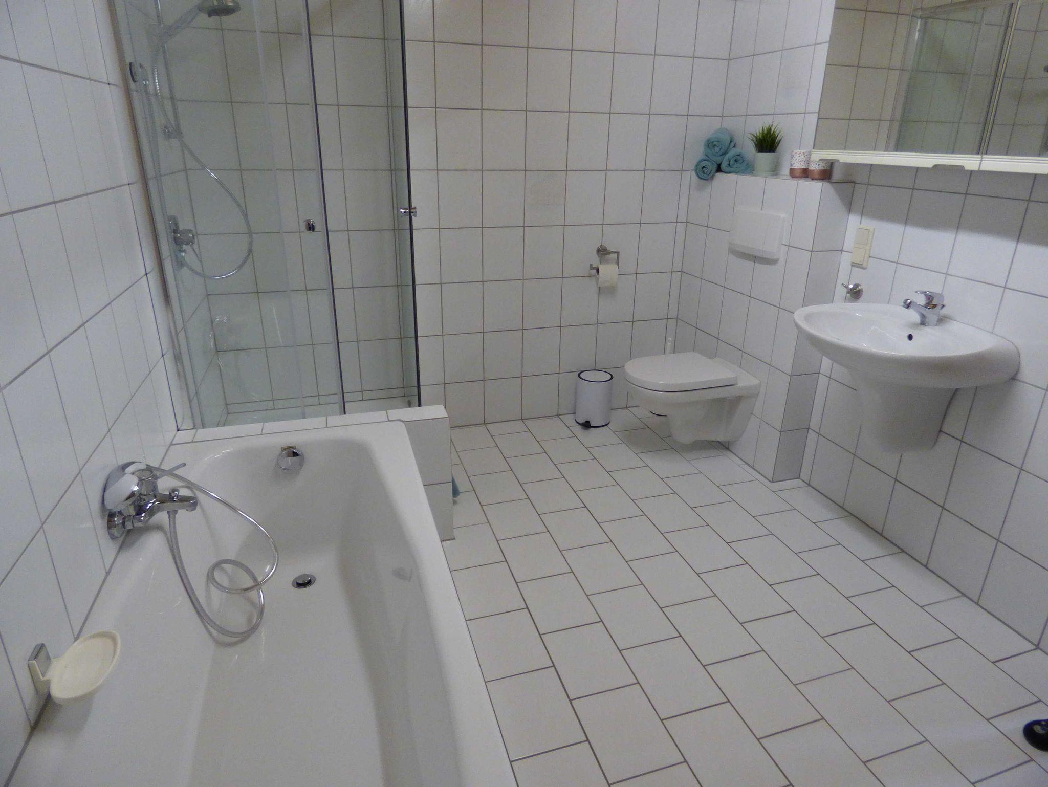 Badezimmer mit Dusche, Badewanne und WC (Föhn und Handtücher)