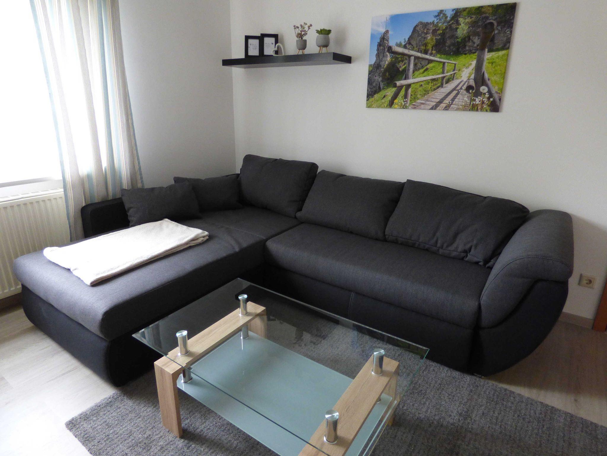 Wohnzimmer mit ausziehbarem Schlafsofa und SAT-TV