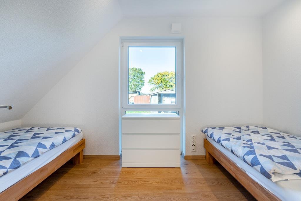 Modern und liebevoll eingerichtete Ferienwohnung Nitschke - FeWo Flut bietet die Möglichkeit, im Herzen Ostfrieslands Ihren Urlaub zu genießen. Die Ferienwohnung in einer unserer beiden in 2022 neu gebauten Doppelhäusern liegt direkt am idyllischen Badesee in Aurich-Tannenhausen. Jede Doppelhaushälfte verfügt über ~60 m² Wohnfläche und bietet Platz für bis zu vier Personen. Das offengestaltete Erdgeschoss mit Koch-/ Wohn- und Essbereich sowie die daran anschließende Terrasse laden zum Wohlfühlen ein. Im Obergeschoss befinden sich zwei gemütliche Schlafzimmer und ein großes Tageslichtbad mit begehbarer Dusche, Waschbecken und WC. Parkplatz für PKW ist direkt am Haus. Größere Familien dürfen gerne beide Doppelhaushälften zusammen reservieren.