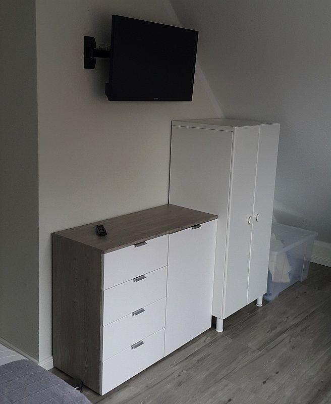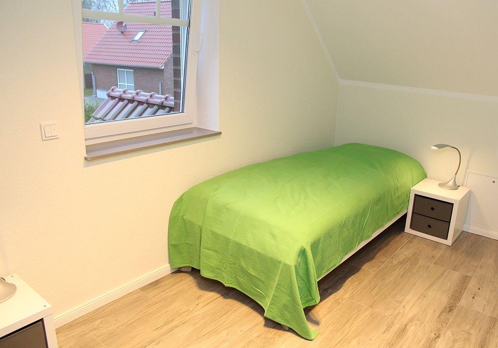 2 Schlafzimmer im OG: Eines ist mit Doppelbett, Kleiderschrank und Flach-Sat-TV und das andere mit zwei Einzelbetten und einer Kommode. Im Kinderzimmer befinden sich noch verschiedene Gesellschaftsspiele. Beide Schlafzimmer können mit elektrischen Außenjalousien abgedunkelt werden.