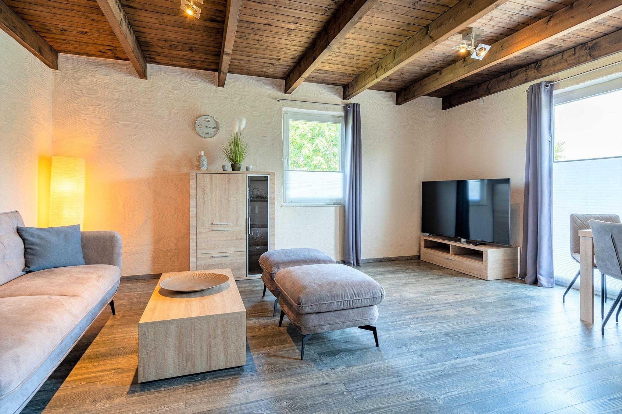 Großzügig geschnittener Wohn-/Essbereich mit vollwertig ausgestatteten Küche und eine gemütliche Couch mit TV ergänzen die Einrichtung. Ein gemütliches Schlafzimmer mit einem Doppelbett und das große Bad mit Dusche sind komfortabel eingerichtet.