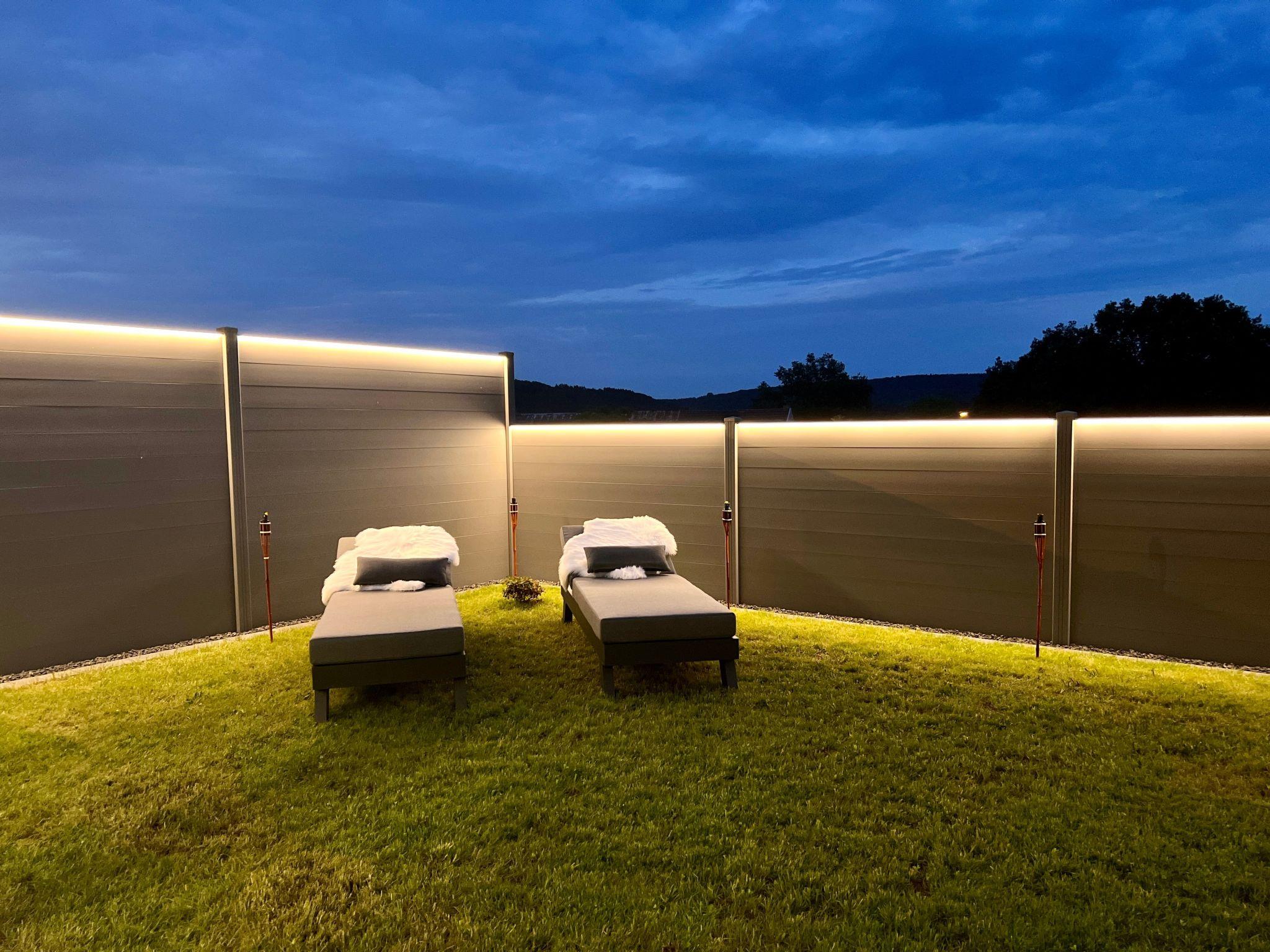 Our accommodation also offers a beautiful outdoor area with a cosy seating area. Wonderful for breakfast or just sitting there in the evening with a glass of wine and counting the stars. The entire garden is completely fenced in and in the evening it is also beautiful to look at with our indirect fence lighting. Pure romance.