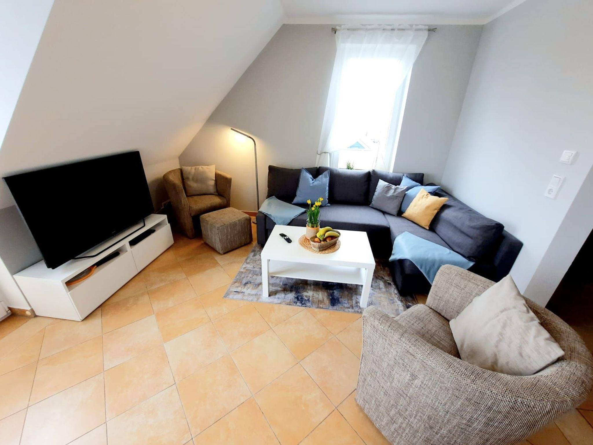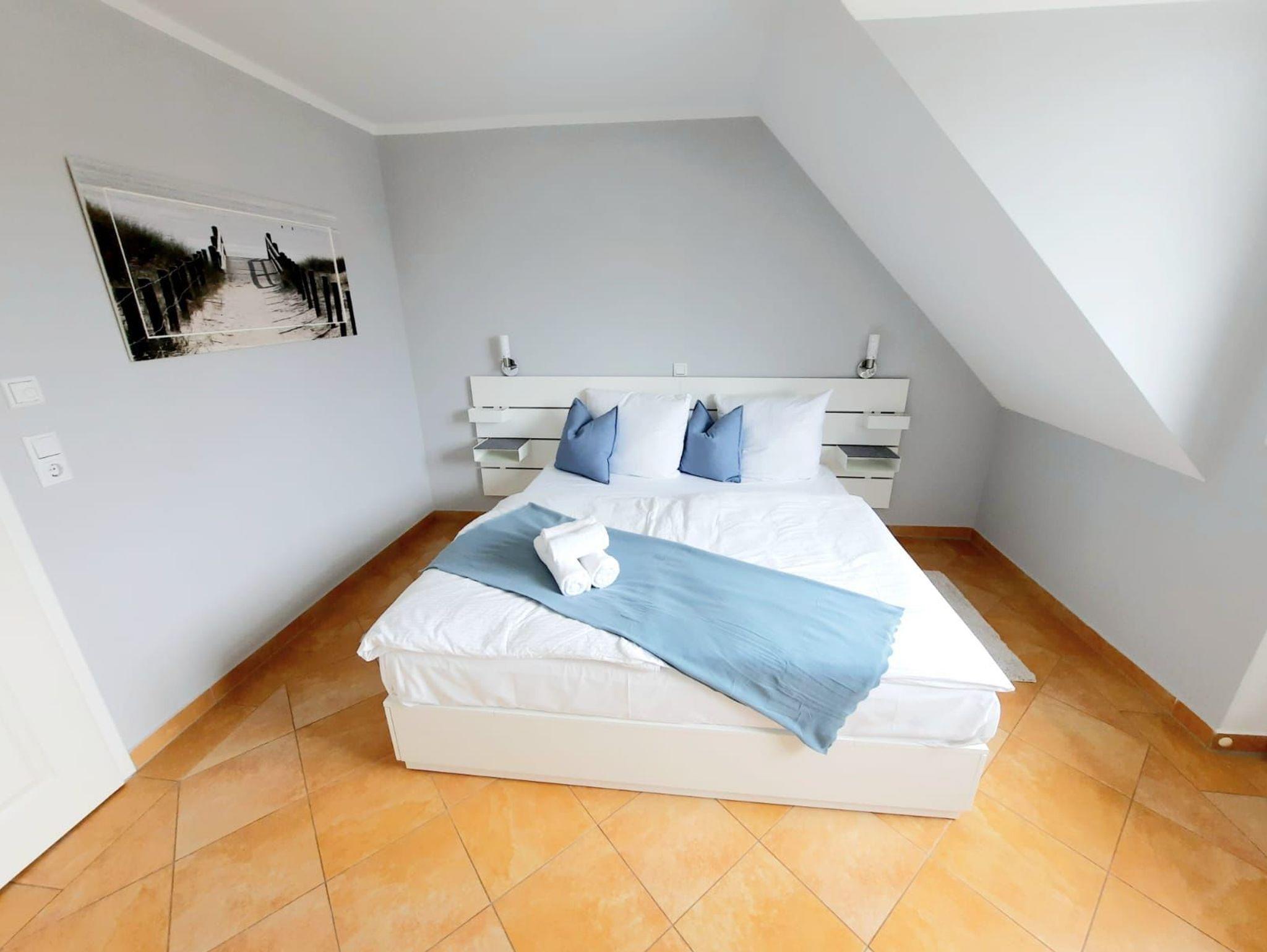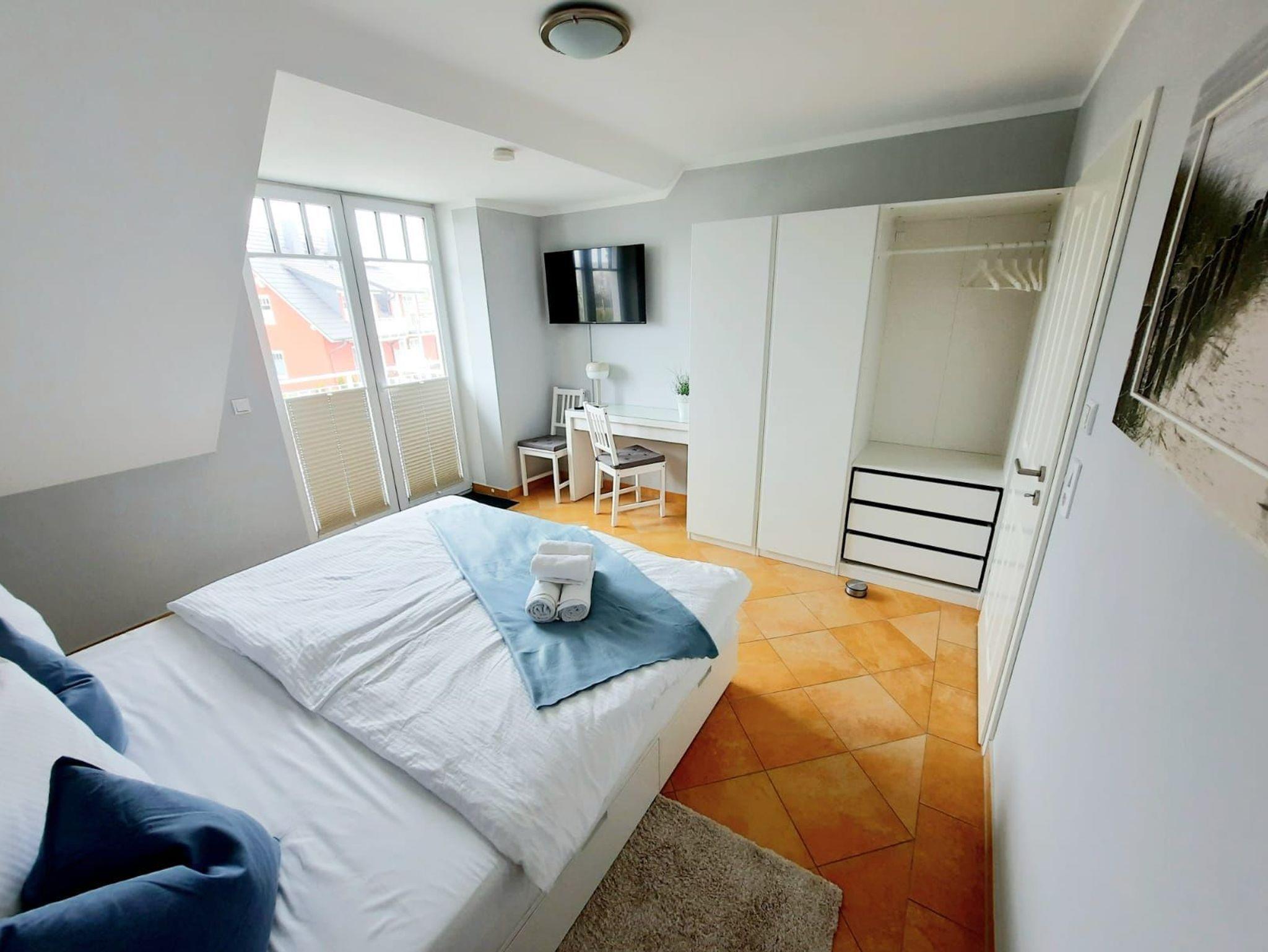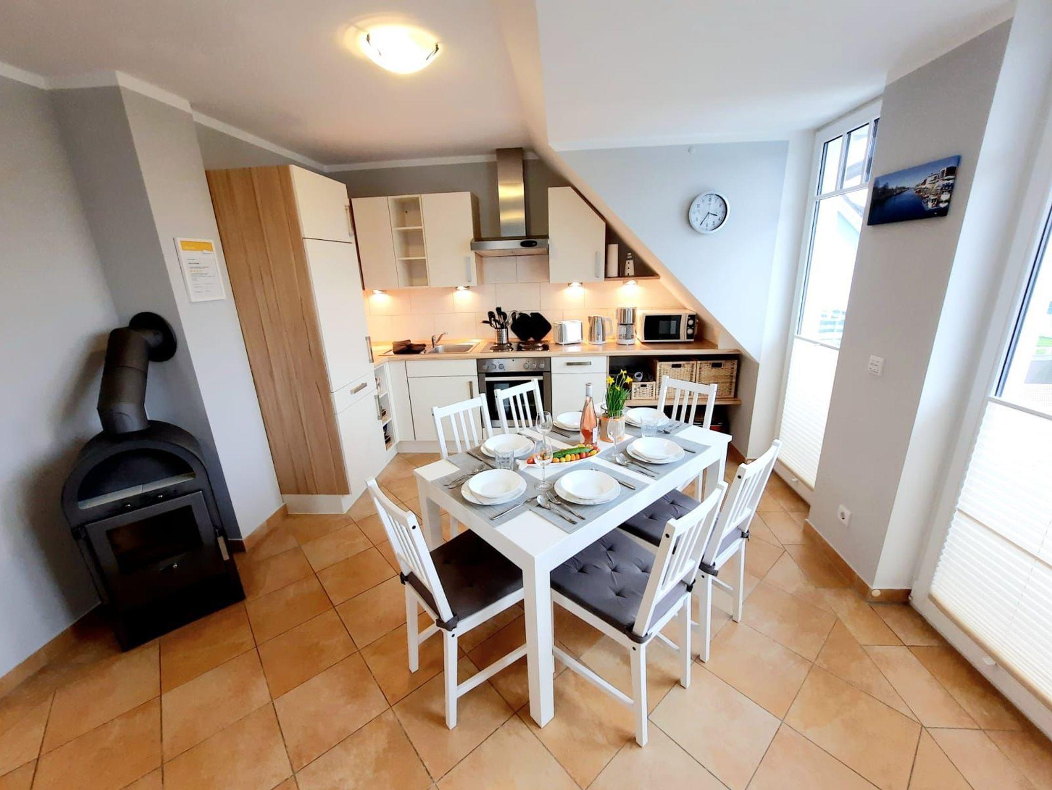 Der offene Wohnbereich mit Kamin und Kuschelecke sowie Essecke und Küche laden zum Verweilen ein. Die offene hochwertige Küche ist komplett ausgestattet mit Kühlschrank inkl. Gefrierfach, Mikrowelle, Spülmaschine, Herd inkl. Backofen sowie Kaffeemaschine und Toaster. Damit Sie sich wie zuhause fühlen, können sie wahlweise auf dem Balkon in Richtung Ostsee, oder dem Balkon auf der Südseite entspannen. Das große Bad mit Dusche und Badewanne verwandelt sich für Sie in eine Wohlfühloase. Über eine geradläufige Aussentreppe ist das Appartement im 1. OG erreichbar. Hier befindet sich das Schlafzimmer Nr. 01 mit einem großen Doppelbett. In der großzügigen Schlafgalerie (Schlafzimmer Nr. 02) im Dachgeschoss gibt es weitere 2 Einzelbetten, die jedoch beide bei Bedarf zu einem Doppelbett umfunktioniert werden können. Für unsere kleinsten Gäste stellen wir kostenlos ein Reisebettchen sowie einen Kinderhochstuhl zur Verfügung. Die Couch im Wohnzimmer kann ebenfalls bei Bedarf mit wenigen Handgriffen zu einem weiteren Schlafplatz umgebaut werden und bietet Platz für 2 Personen. Ein PKW-Stellplatz befindet sich für Sie kostenfrei am Haus. Für Haustiere berechnen wir EUR 20,00 pro Nacht. Wir bitten Handtücher und Bettwäsche mitzubringen. Die Endreinigung berechnen wir zusätzlich mit EUR 100,00. Unsere Unterkunft ist für Monteure nicht geeignet.