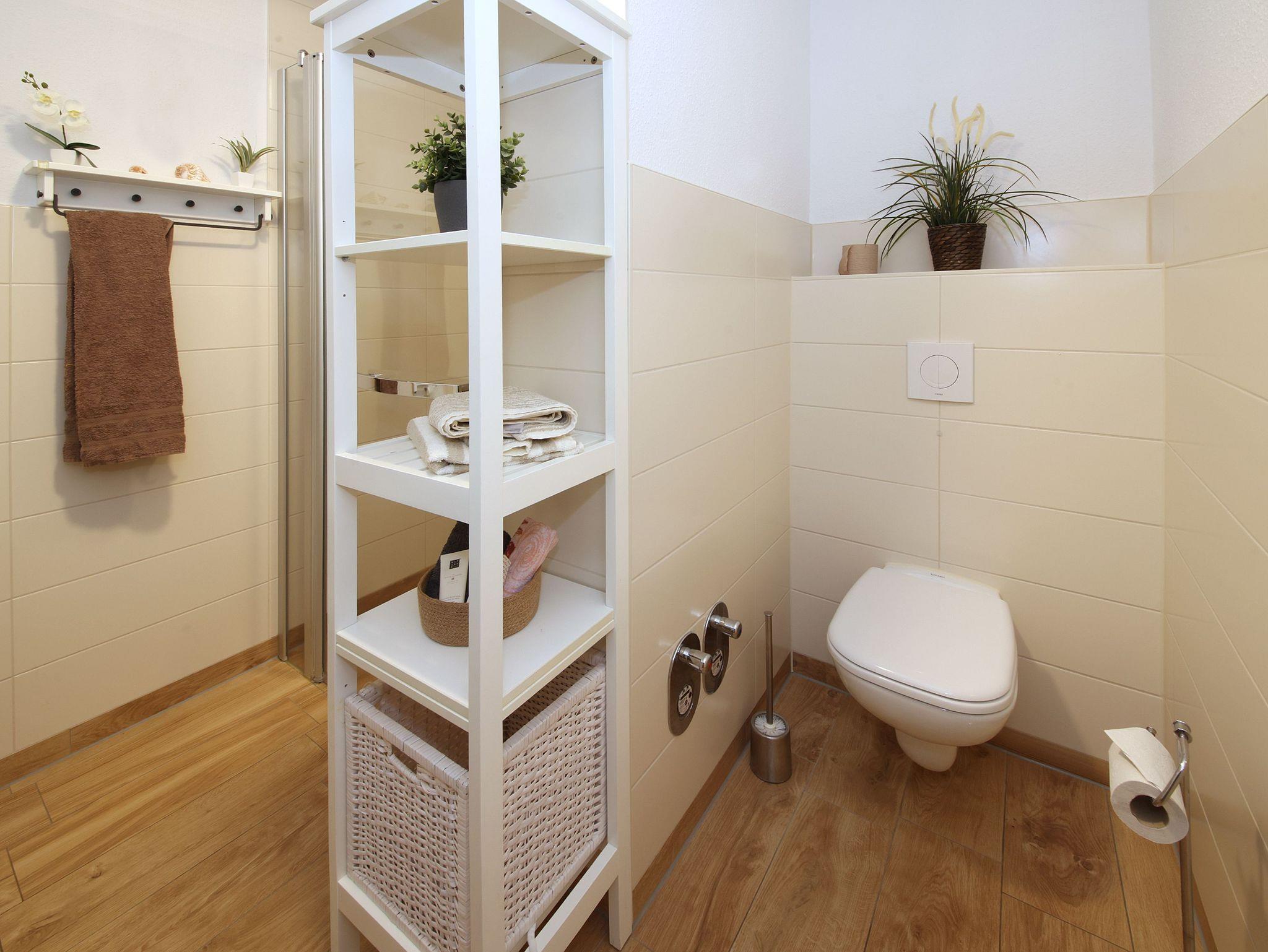 Das moderne Badezimmer verfügt über eine bodengleiche Dusche, Handtuchwärmer und Föhn. Im Schlafzimmer befindet sich ein komfortables Doppelbett (1,80 m x 2,00 m). Bodentiefe Fenster sorgen für viel Tageslicht, die Fußbodenheizung im Wohnbereich für zusätzlichen Komfort.