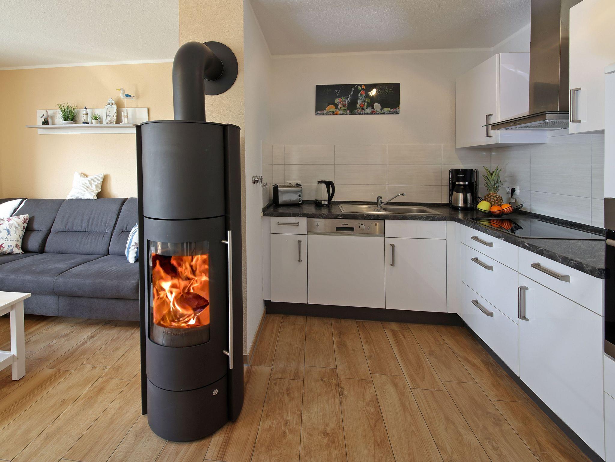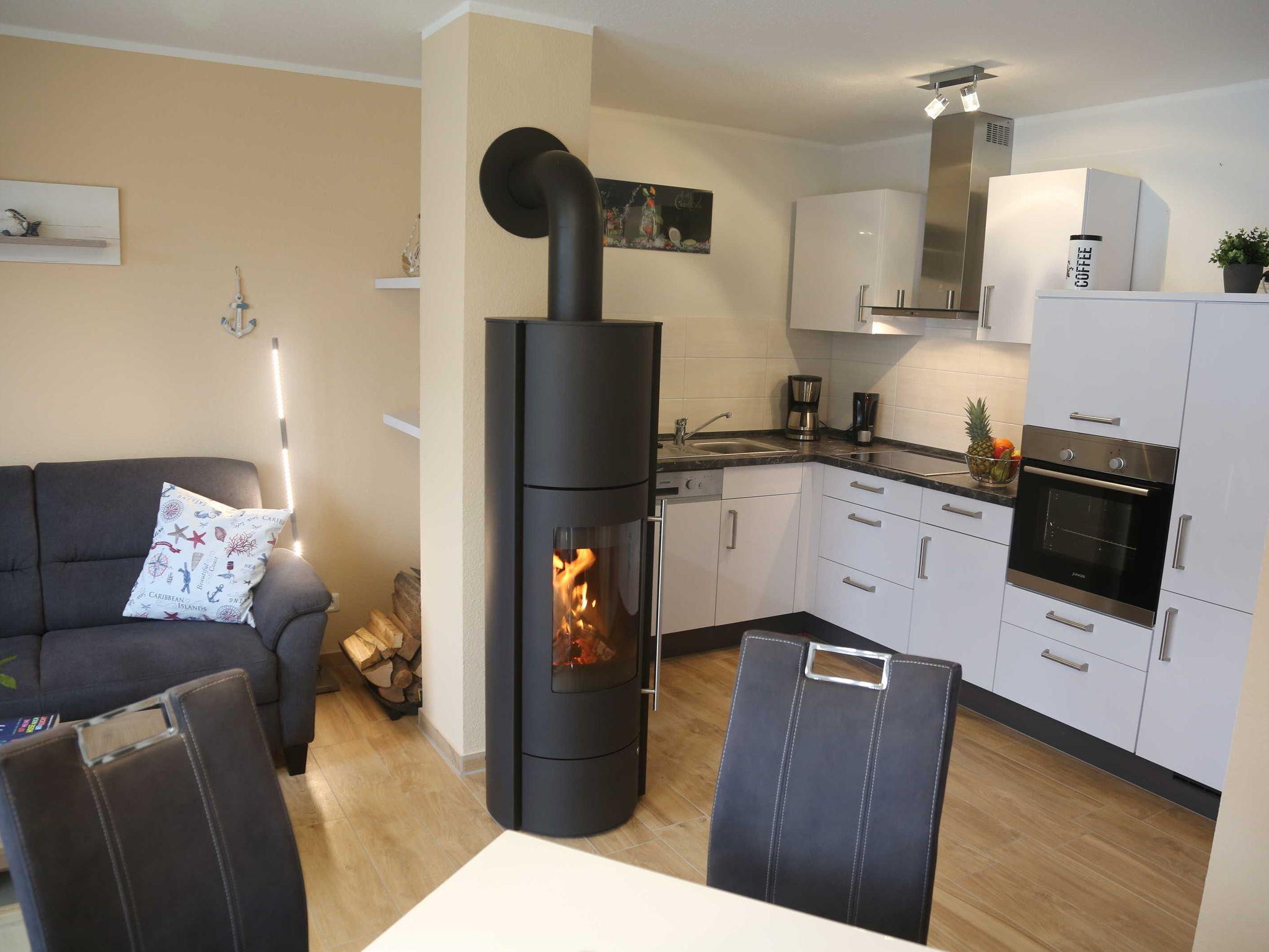 Der Balkon ist sonnig ausgerichtet und lädt von den Vormittagsstunden bis zum Abend zum Verweilen ein. In der kühleren Jahreszeit sorgt der Kaminofen für eine angenehme Wohnatmosphäre.