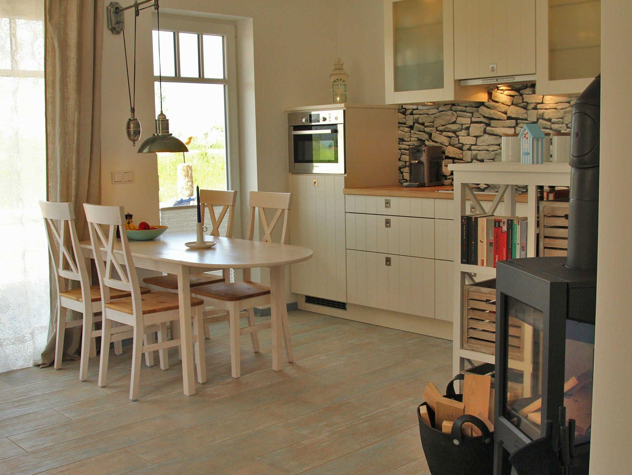 Die Küche ist in den Wohnraum integriert und mit hochwertigen Markengeräten ausgestattet. Direkt an die Terrasse und den Garten schließt sich der Park von Börgerende mit Spielplatz und Fitness Parcours an.