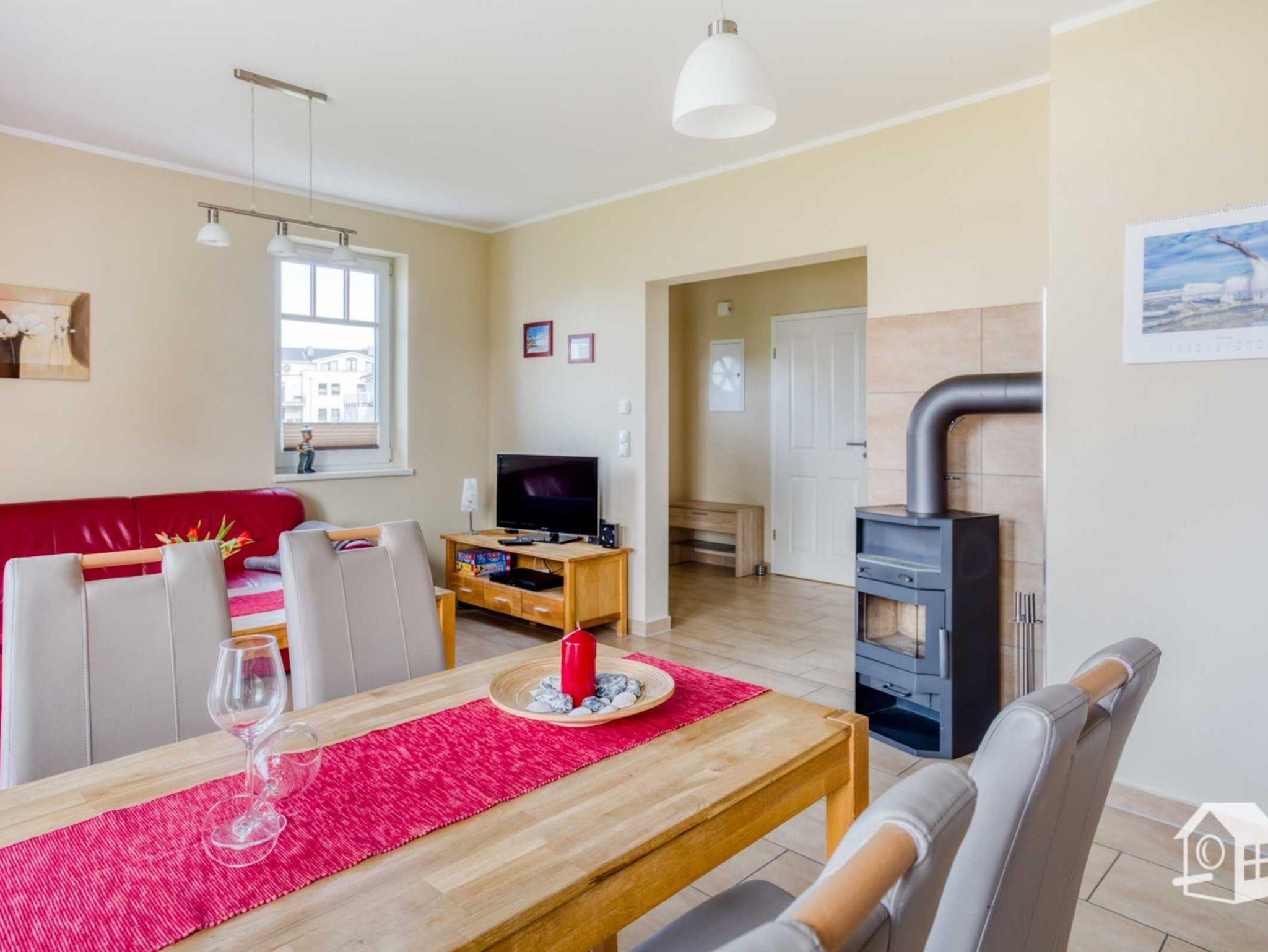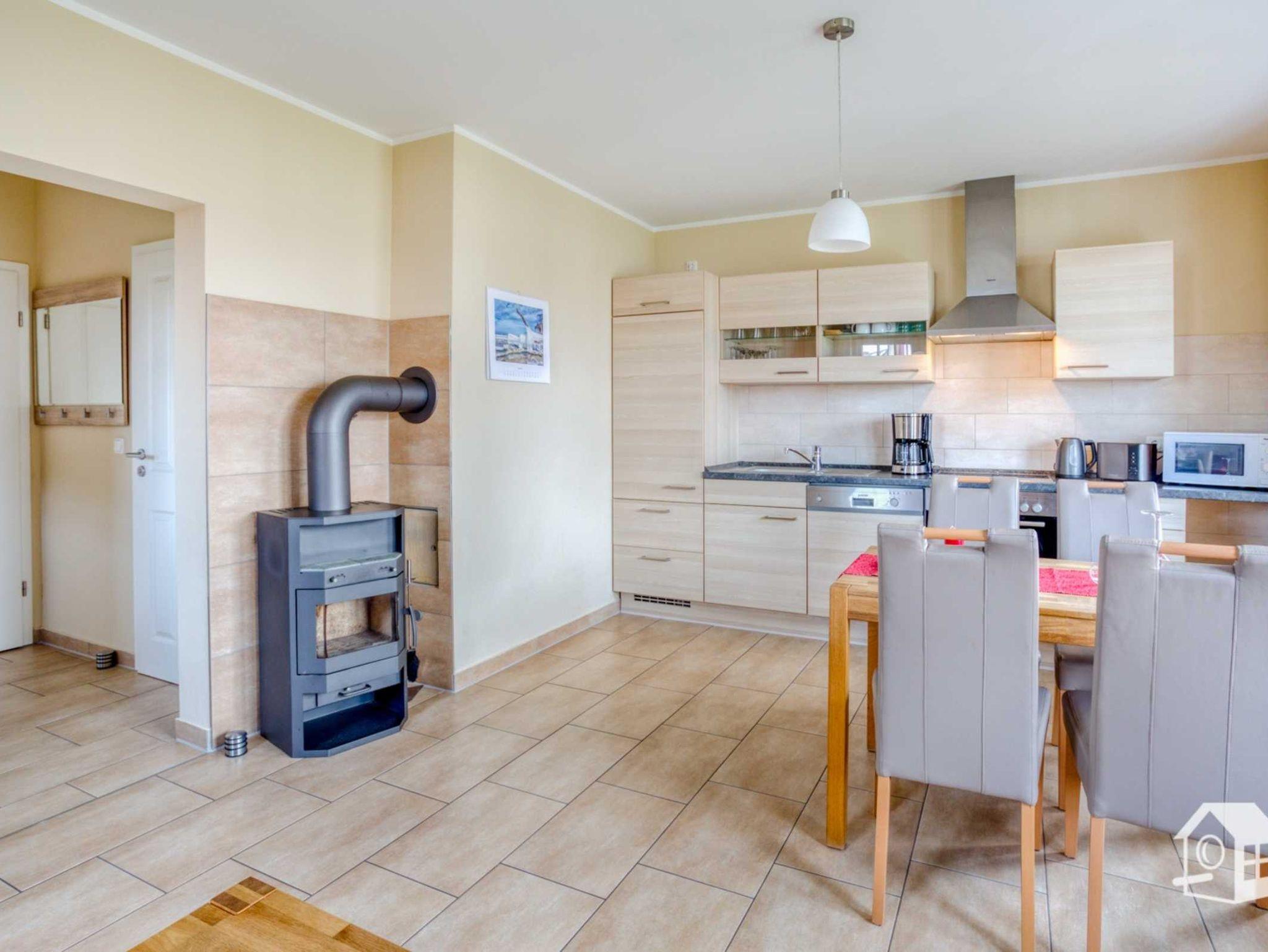 Der Wohnbereich besticht durch seine Ledereckcouch mit integrierter Schlaffunktion. Zum Ausklingen der Urlaubstage befindet sich hier ein Flachbildfernseher, sowie ein 2.1 Blu-Ray Heimkino System. Ein Kaminofen macht die Wohnung auch für die kühlere Jahreszeit gemütlich.