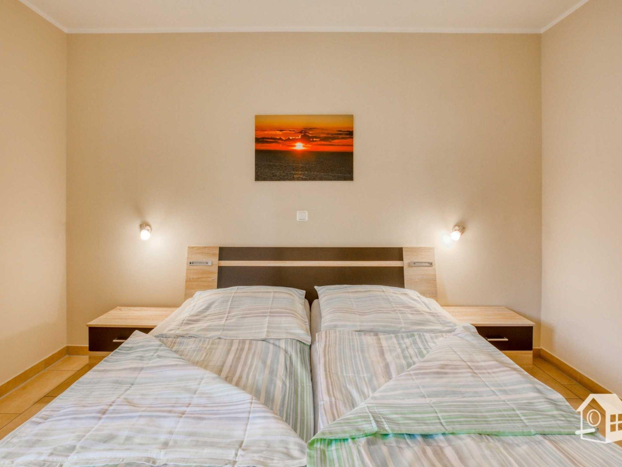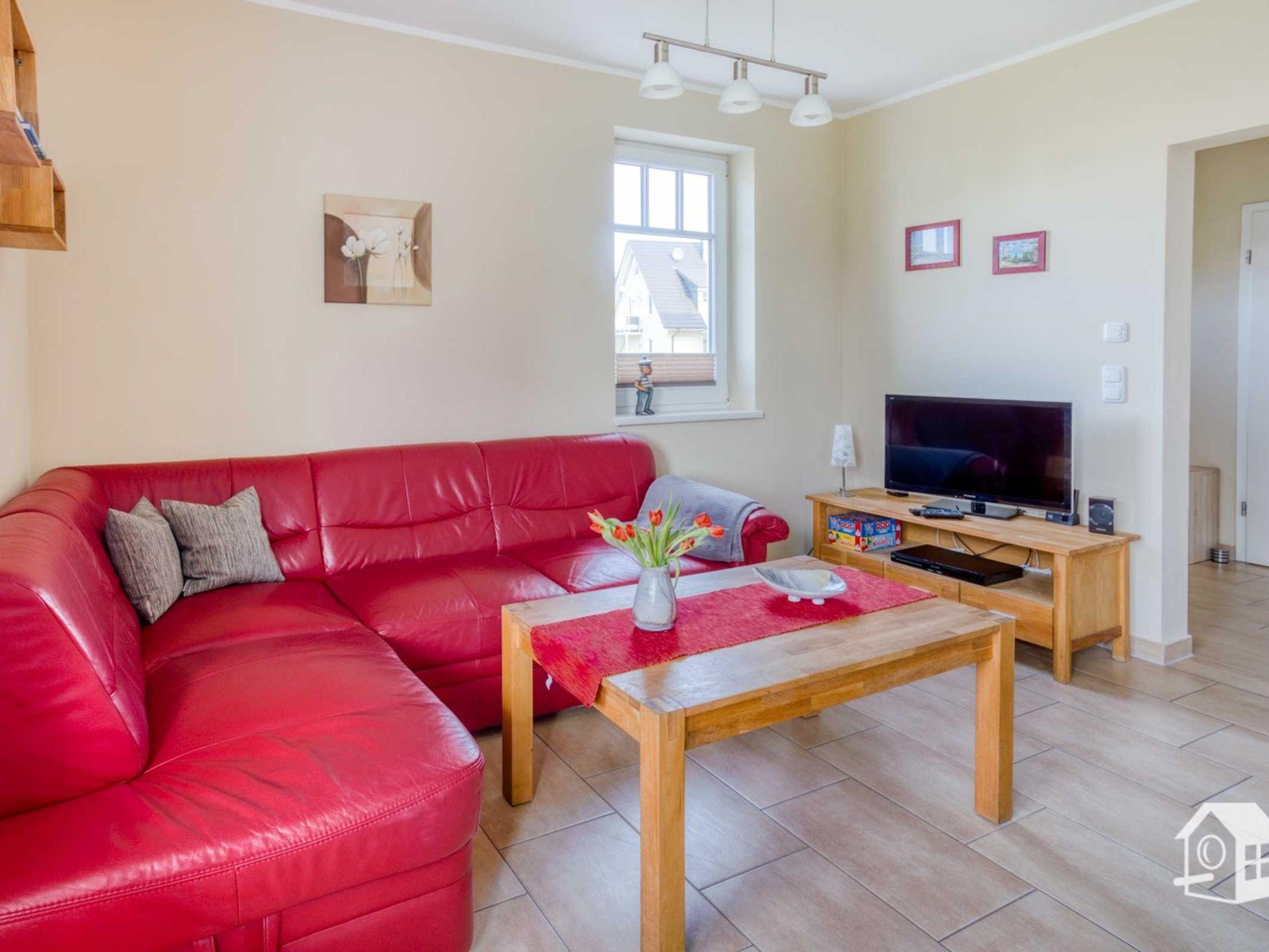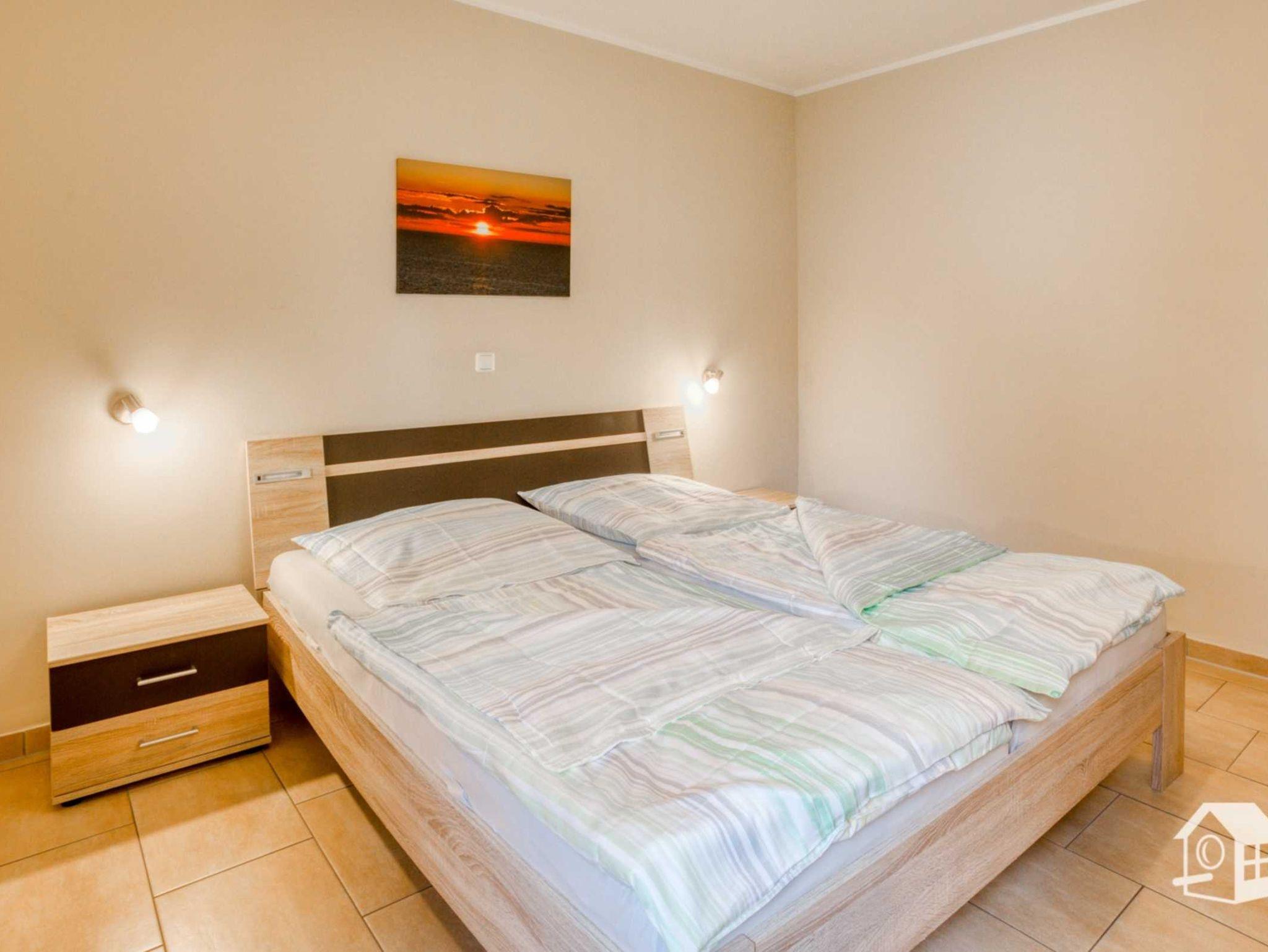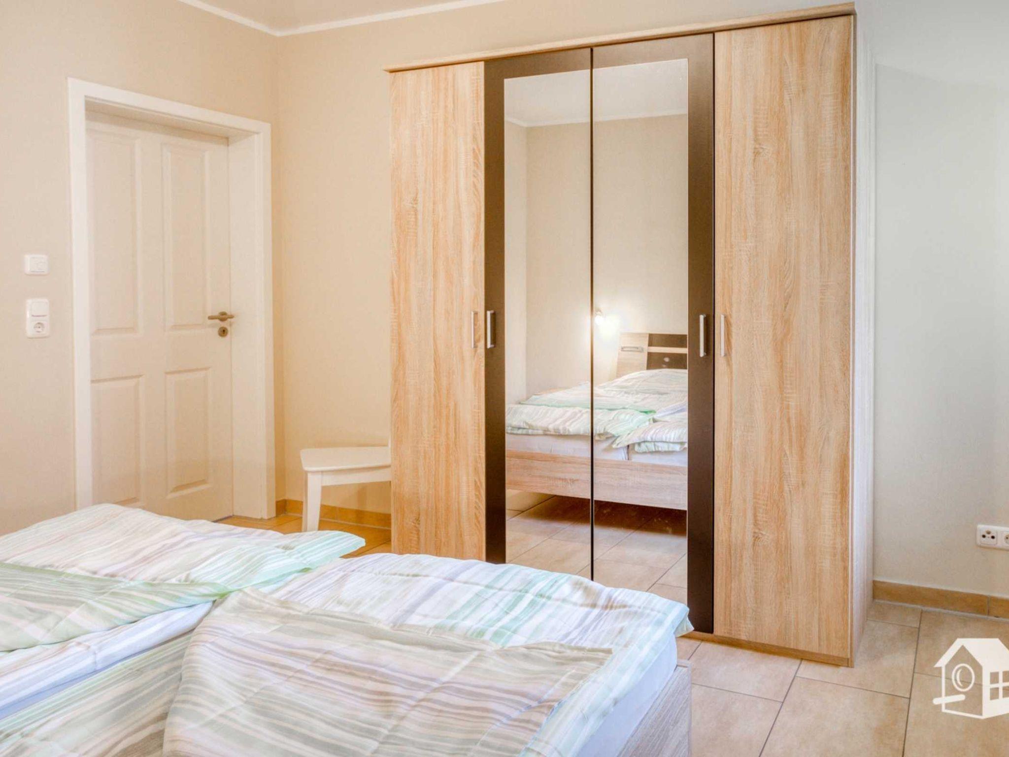Die gesamte Wohnung ist mit einer Fußbodenheizung ausgestattet. Vom geräumigen Eingangsbereich aus, geht es in das komplett geflieste Badezimmer mit ebenerdiger Dusche, WC, Waschbecken und Waschmaschine. Im großen Schlafzimmer finden Sie u. a. ein Doppelbett sowie einen geräumigen Kleiderschrank. Zwei weitere Schlafmöglichkeiten gibt es im kleinen Schlafzimmer. Hier steht Ihnen ein Ausziehbett (ebene Liegefläche von 1,60m x 2,00m) zur Verfügung. Auch ein kleiner LCD-Fernseher (DVB-S) mit allen Anschlussmöglichkeiten befindet sich hier.