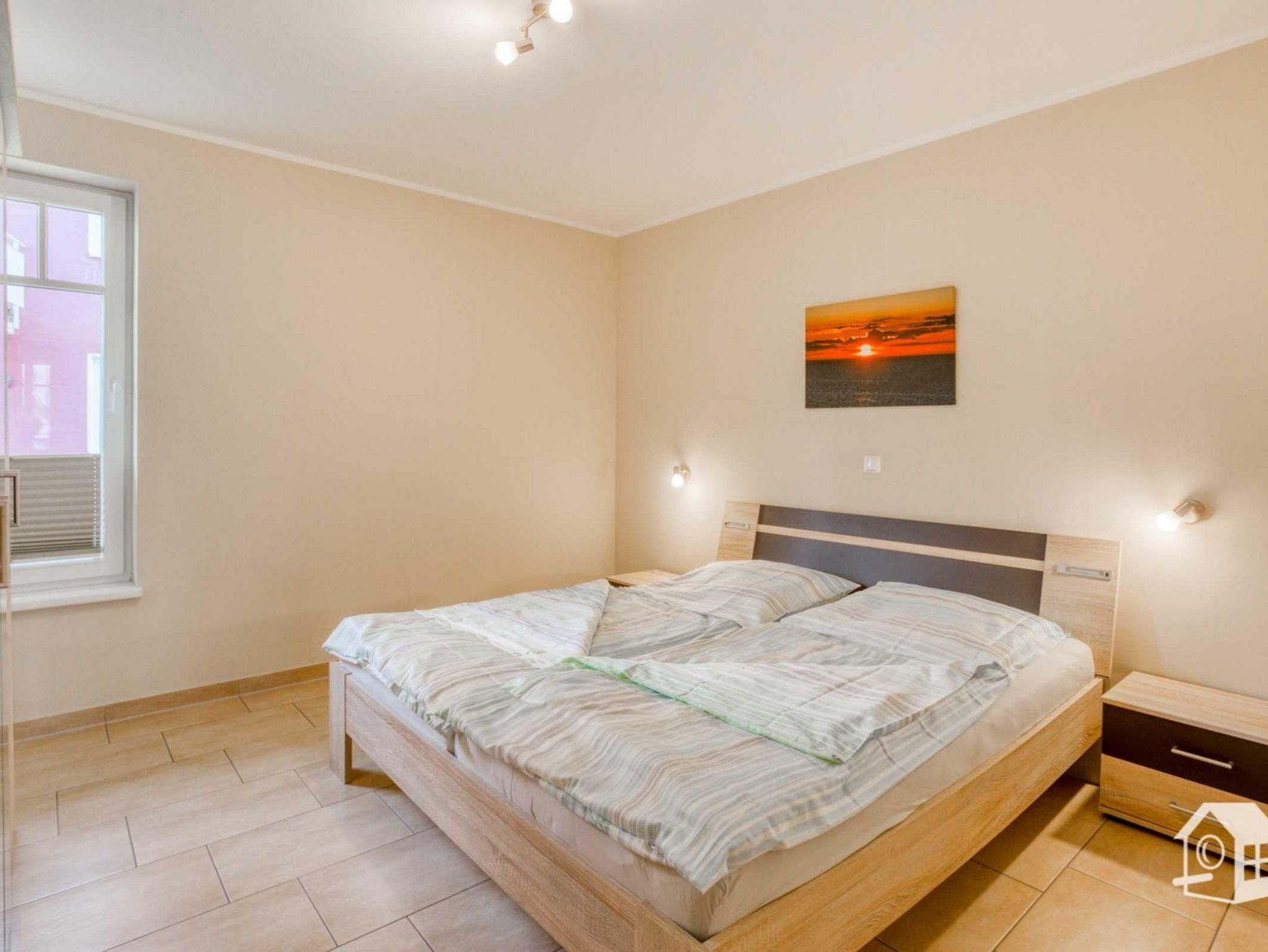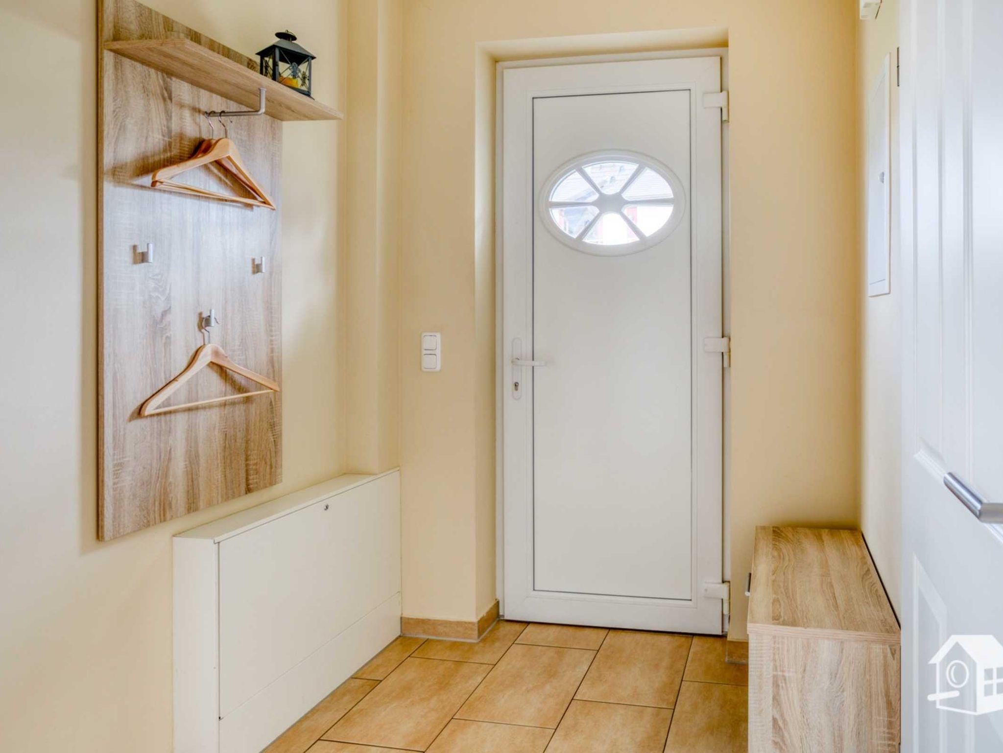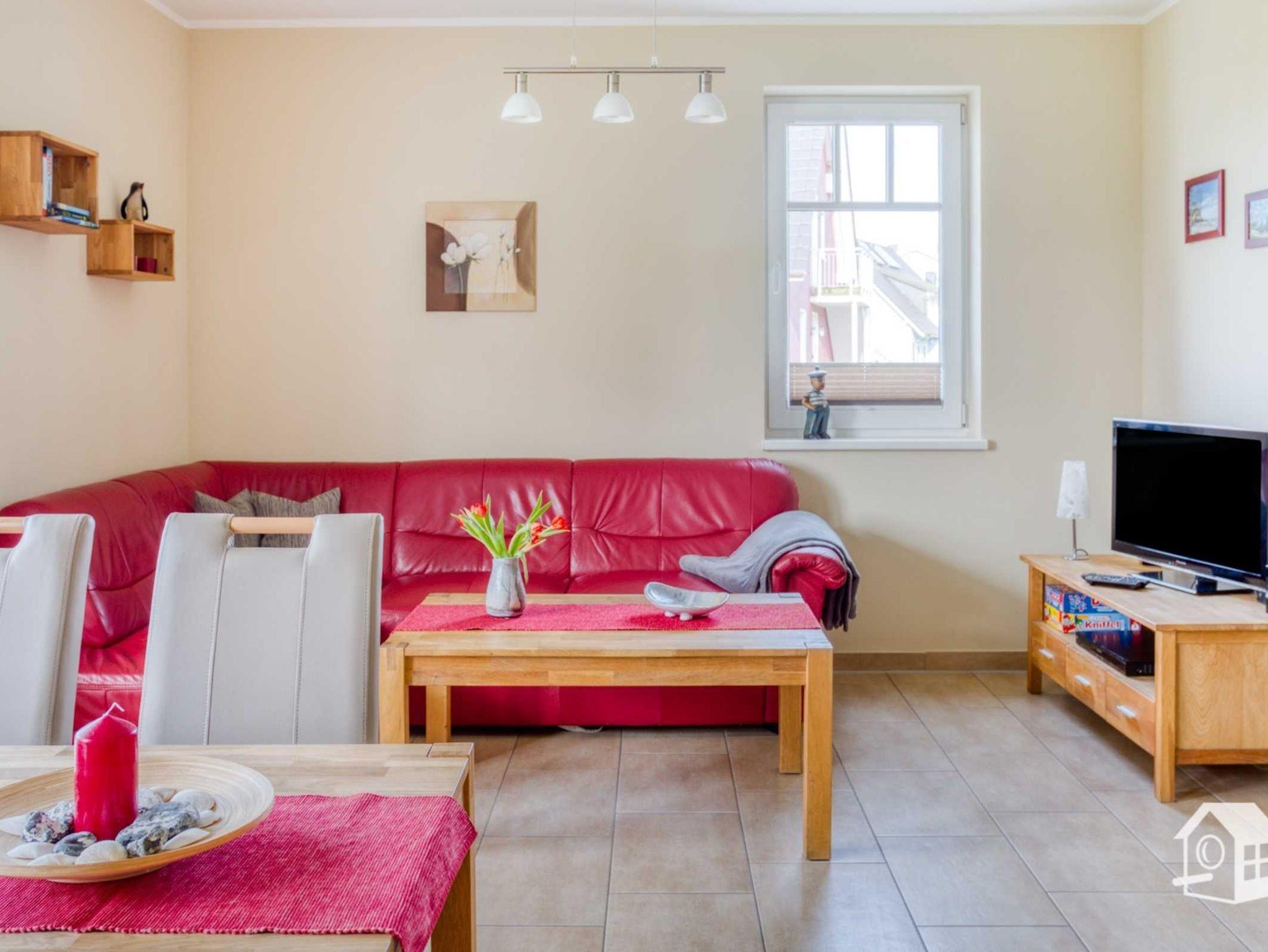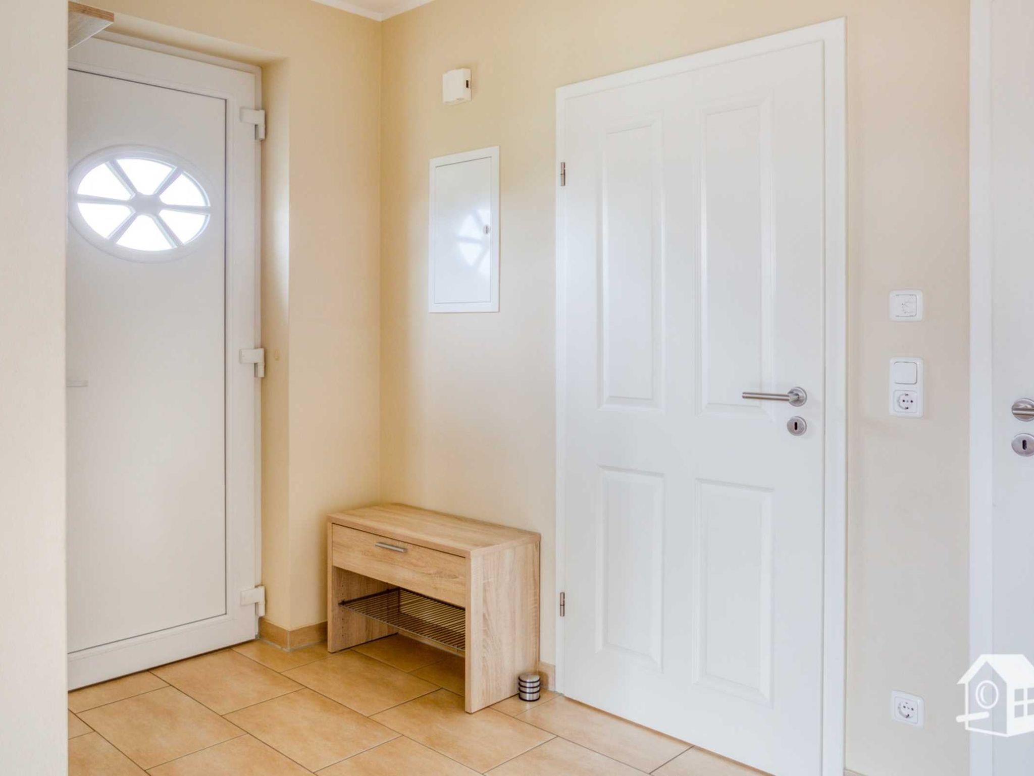 Die gesamte Wohnung ist mit einer Fußbodenheizung ausgestattet. Vom geräumigen Eingangsbereich aus, geht es in das komplett geflieste Badezimmer mit ebenerdiger Dusche, WC, Waschbecken und Waschmaschine. Im großen Schlafzimmer finden Sie u. a. ein Doppelbett sowie einen geräumigen Kleiderschrank. Zwei weitere Schlafmöglichkeiten gibt es im kleinen Schlafzimmer. Hier steht Ihnen ein Ausziehbett (ebene Liegefläche von 1,60m x 2,00m) zur Verfügung. Auch ein kleiner LCD-Fernseher (DVB-S) mit allen Anschlussmöglichkeiten befindet sich hier.